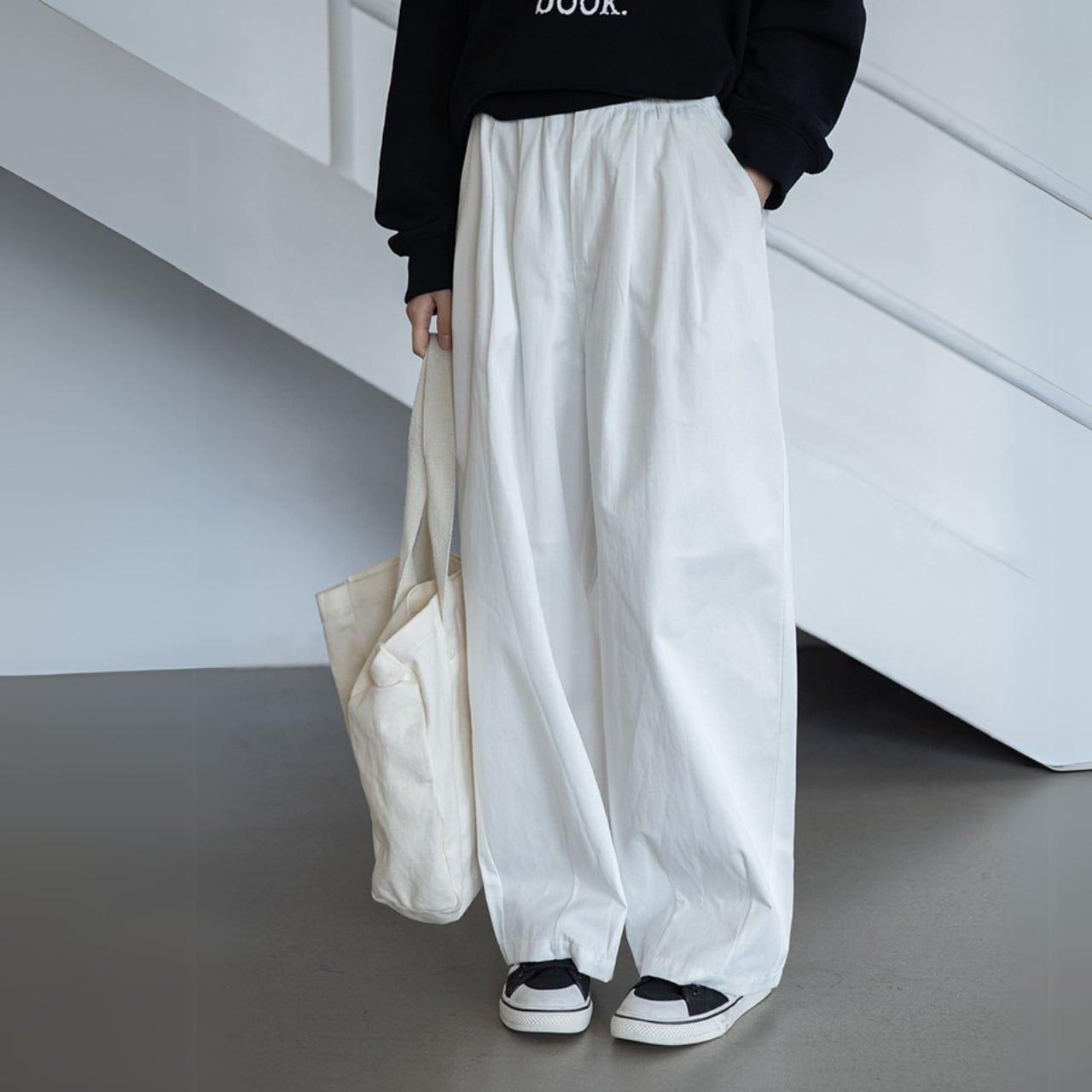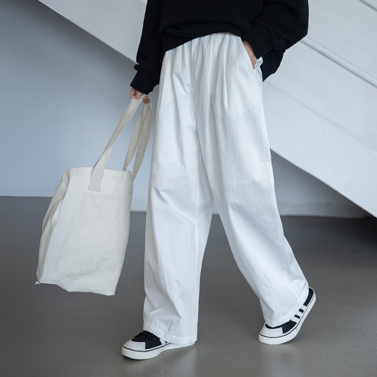 “下半身のラインがすっきり見えるワイドストレートシルエットが魅力的なイージーパンツ。程よくカジュアルで、でも品がある。大人女性にぴったりの要素が詰まったアイテムです。トップスをインした着こなしもおすすめ◎”