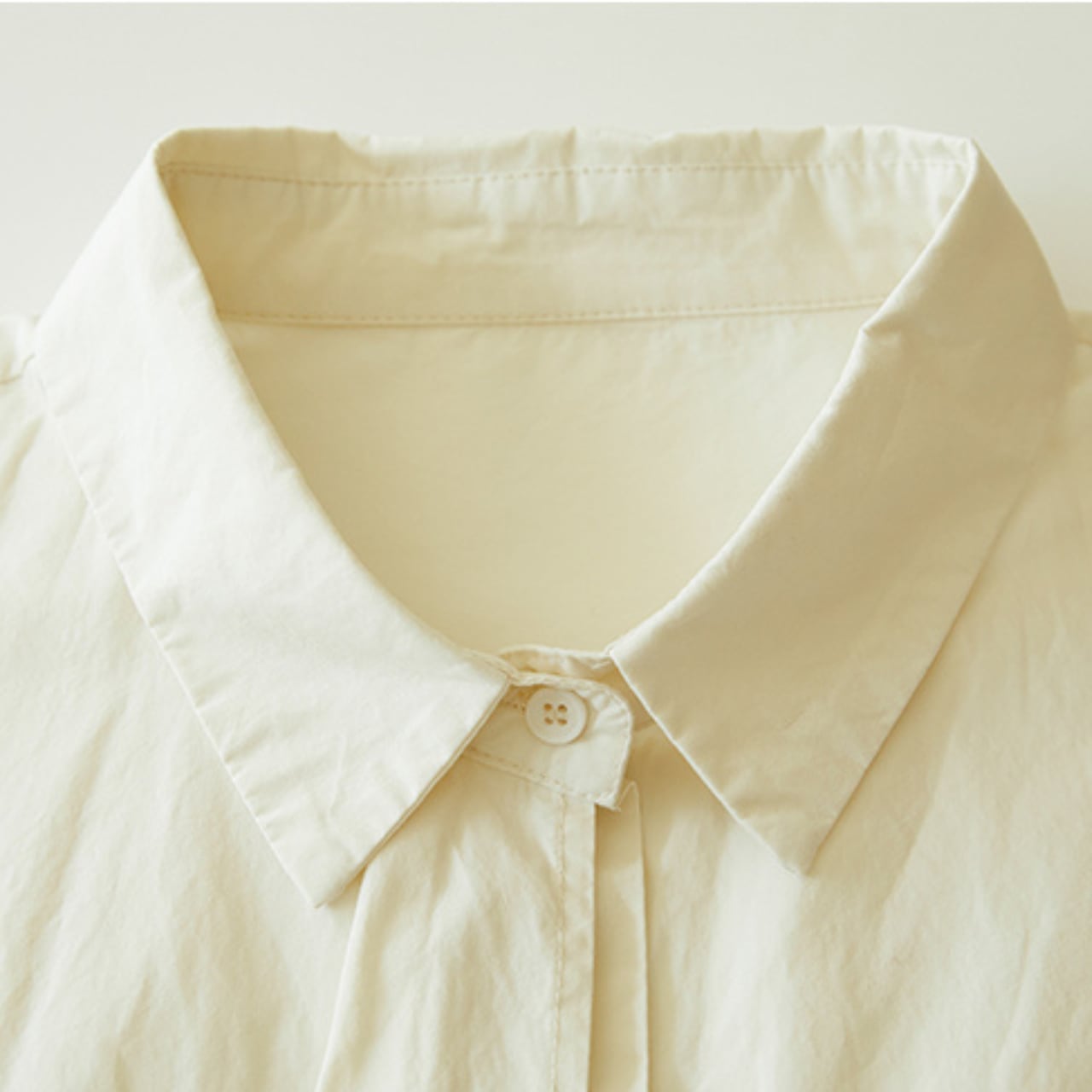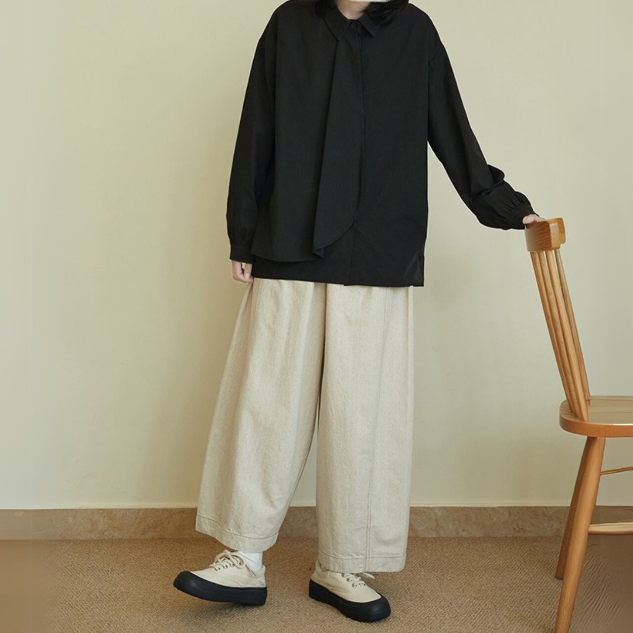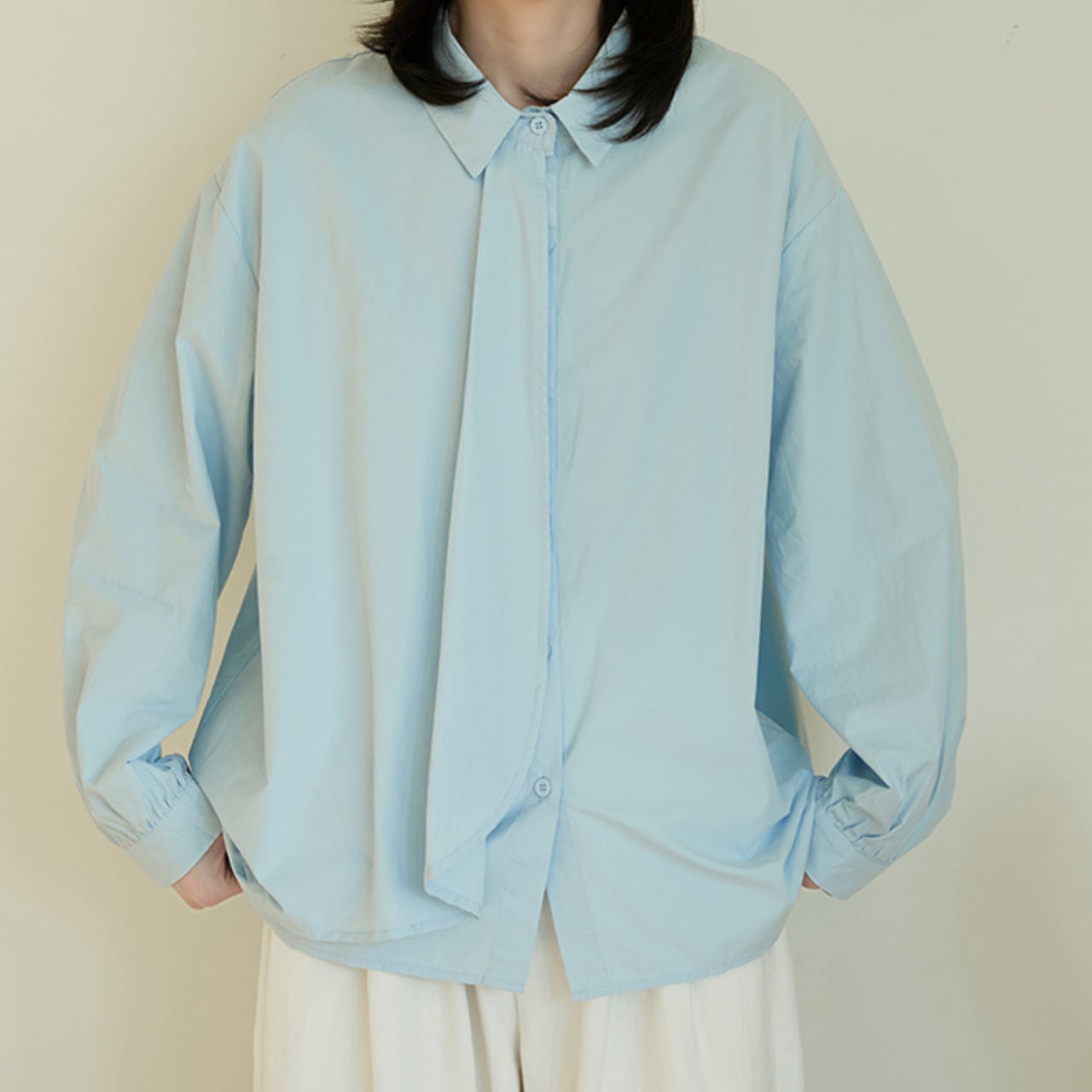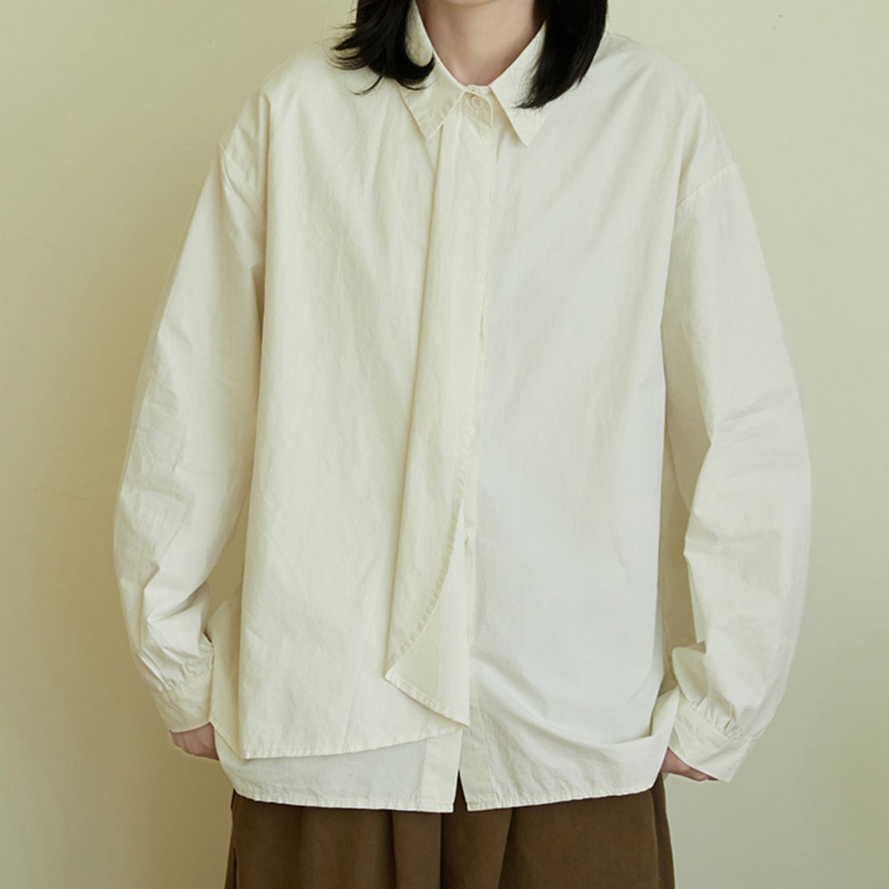“ネクタイを着けているようにも見えるドレープデザインがオシャレなフライフロントシャツ。ゆったりとしたサイズ感で、体型カバーにもおすすめの1枚です。シンプルながらにデザイン性が高く、品のある大人カジュアルコーデを楽しめます。”