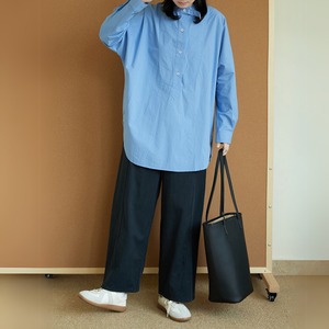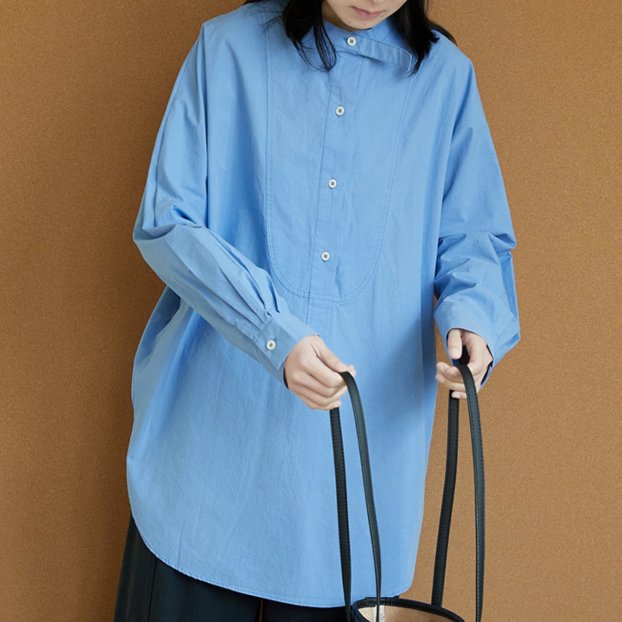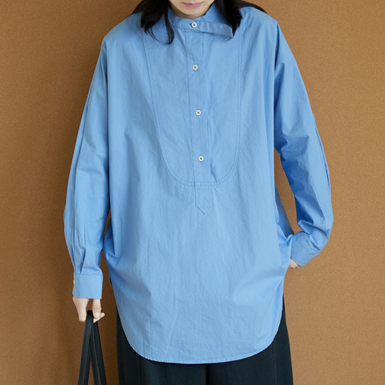 ネックラインのアシンメトリーデザインやハーフボタンを囲うステッチデザインに個性があり、オリジナリティのある1枚に仕上がっています。