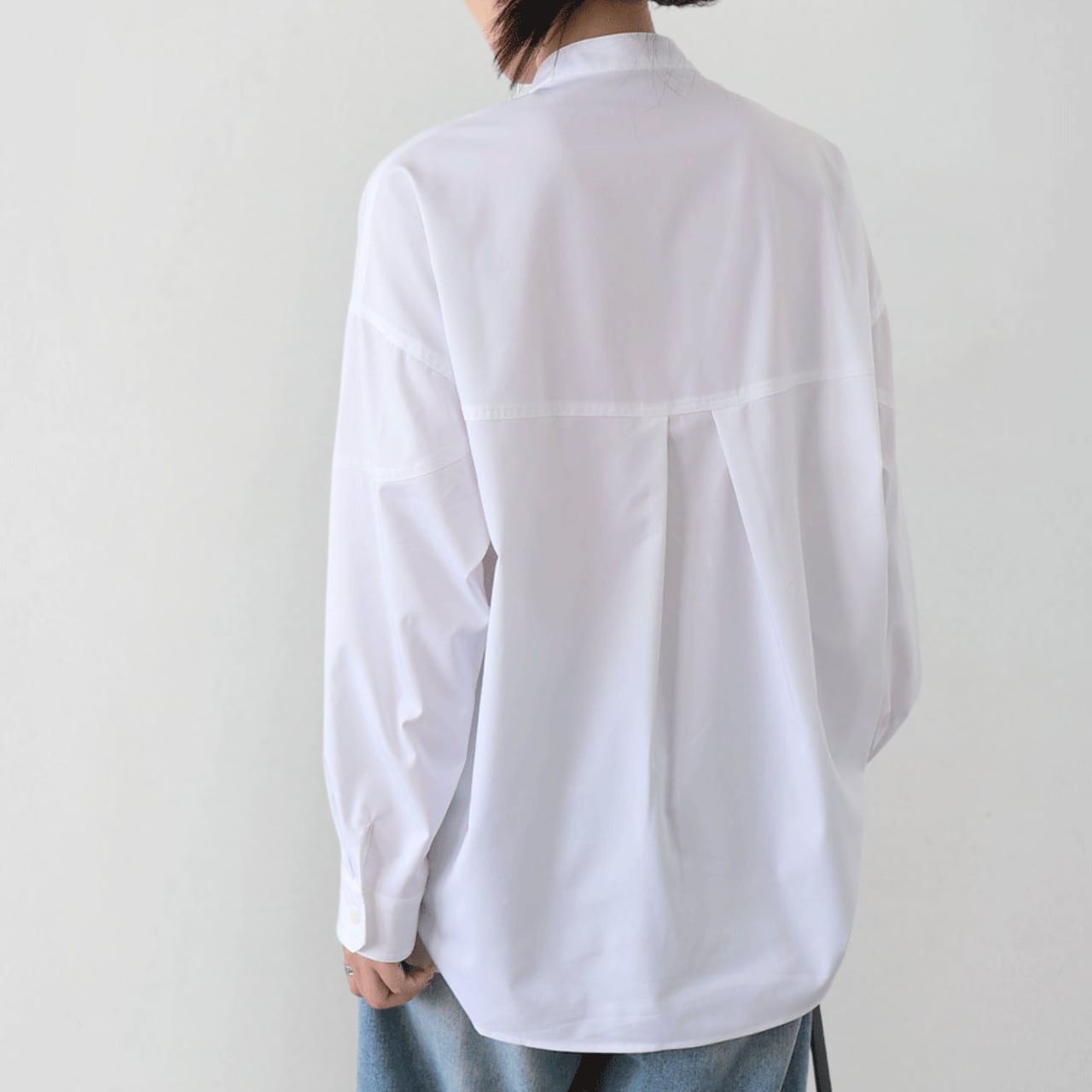 “ステッチを用いたアシンメトリーデザインが印象的な、長袖のスタンドカラーシャツ。シンプルなのにオリジナリティがあり、袖部分のダブルステッチもアクセントになっていてオシャレ!そのまま着るだけでなく、ベストやサロペットとレイヤードしても◎ゆったりとしたサイズ感が抜け感を演出してくれる1枚です。”