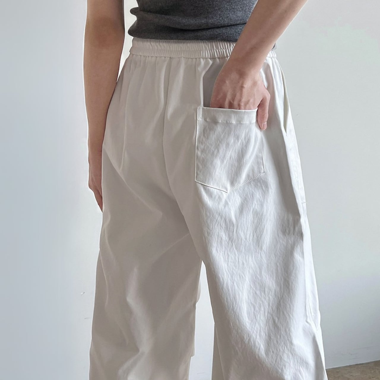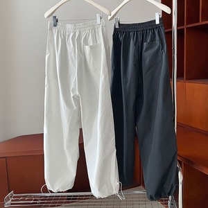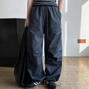 “スタイリッシュなデザインが目を惹くドローストリングパンツ。引き紐のボーダー模様やヘムシルエット、膝部分の立体感など、デティールにこだわったクールなアイテムです。タイトなトップスを合わせてメリハリを出してもオーバーサイズシャツをさらっと羽織っても、ハンサムライク◎”