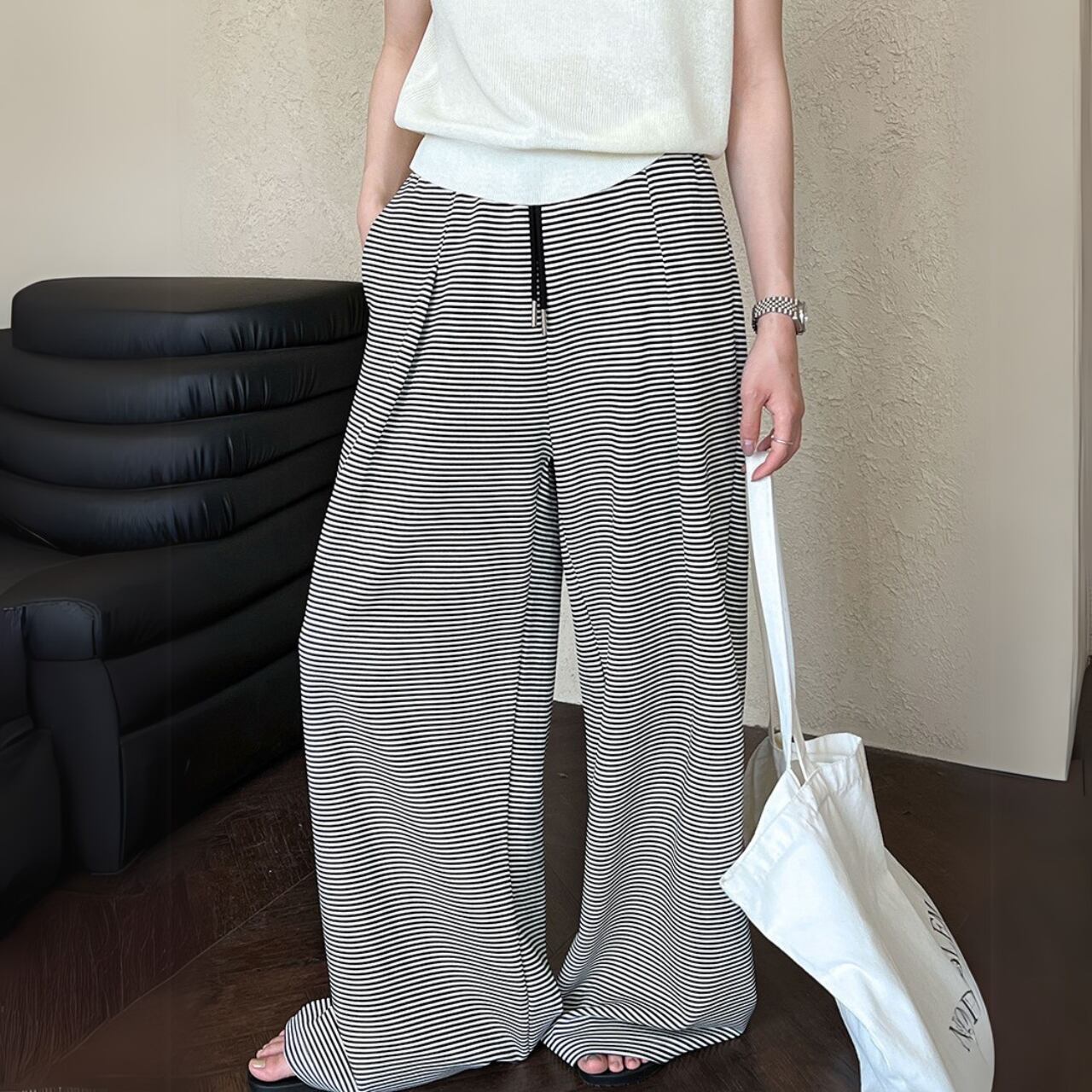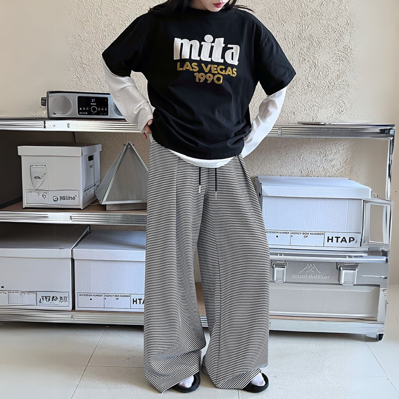 “リラックス感たっぷりなのに、どこかモードな雰囲気漂うワイドパンツ。すとんと落ちる軽やかな落ち感が上品で、ストライプで縦ラインが強調されて、自然と脚が長く見えるのも嬉しいポイント!コーディネートをモノトーンカラーで統一すると、洗練されたスタイリッシュな印象に◎”
