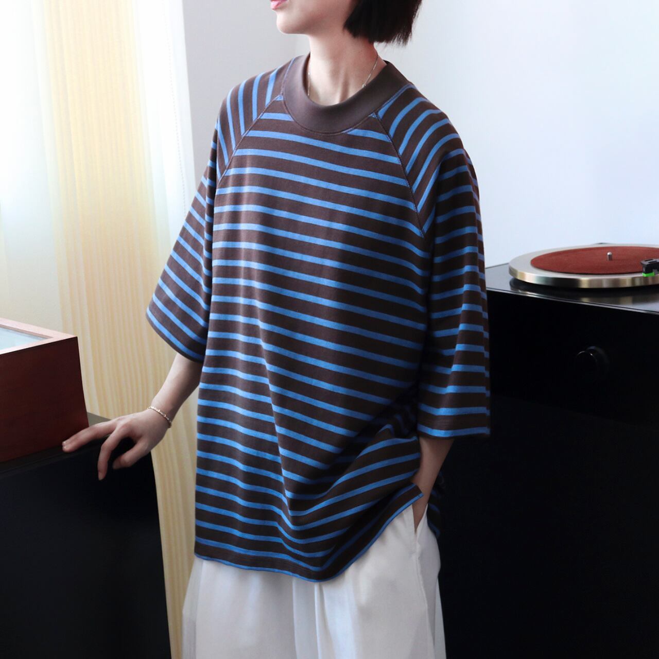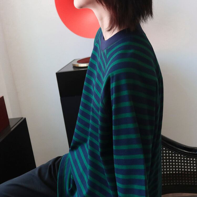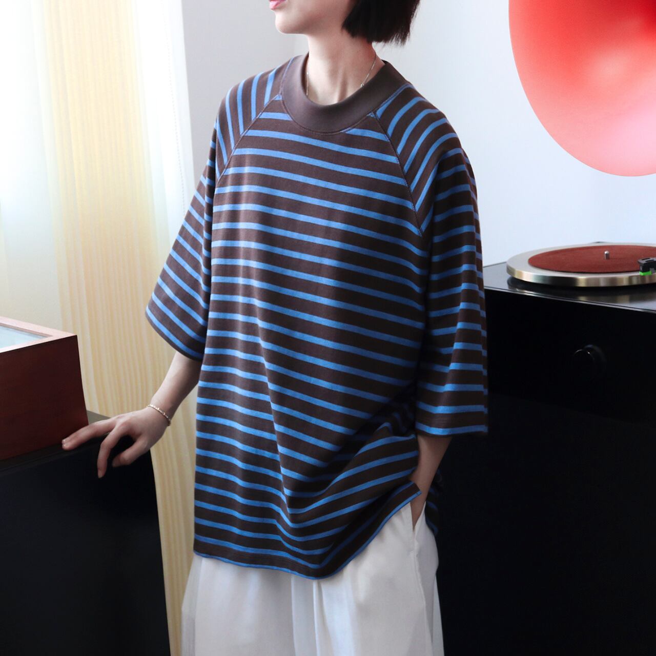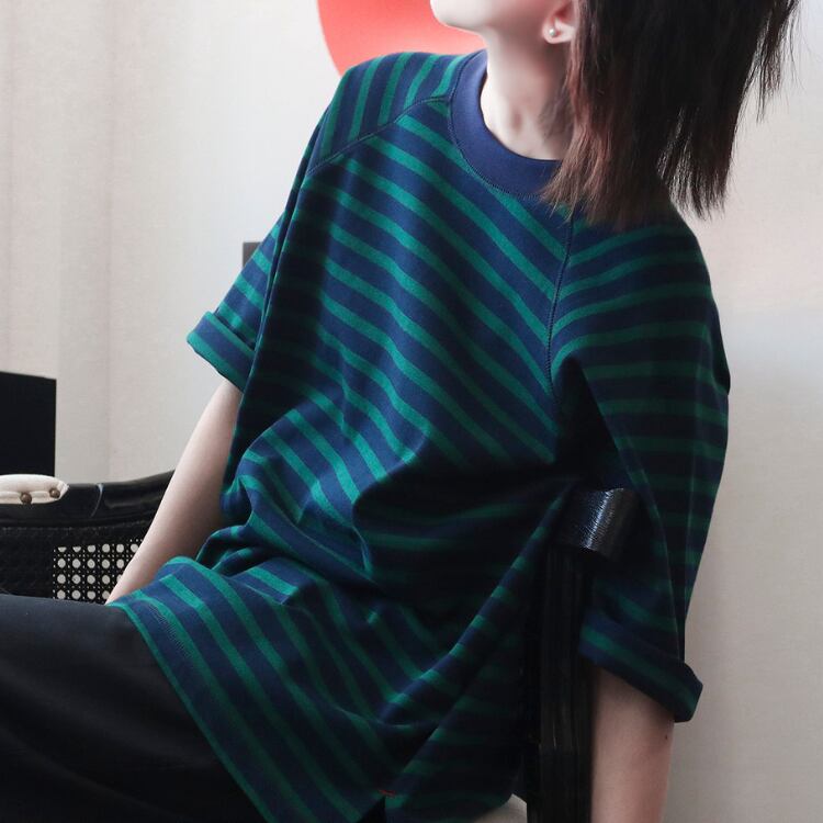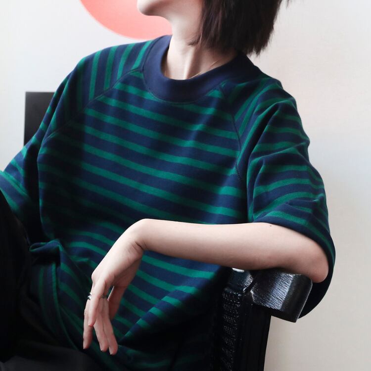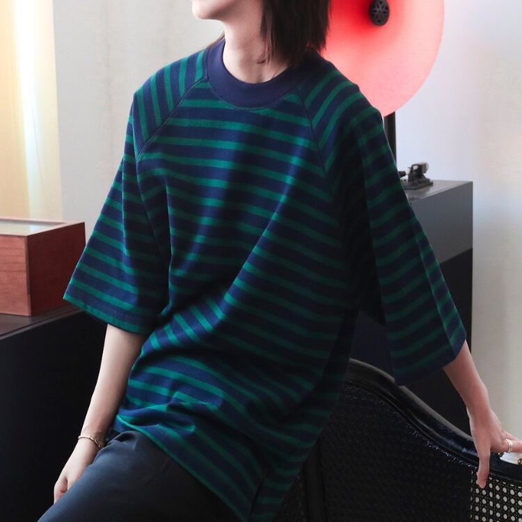 配色センスが光るツートーンボーダーにラグランスリーブを合わせた、こなれTシャツ。