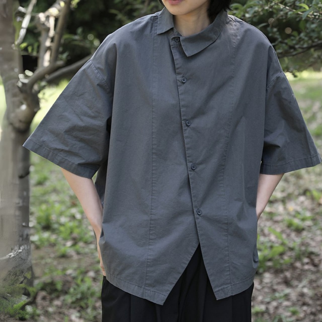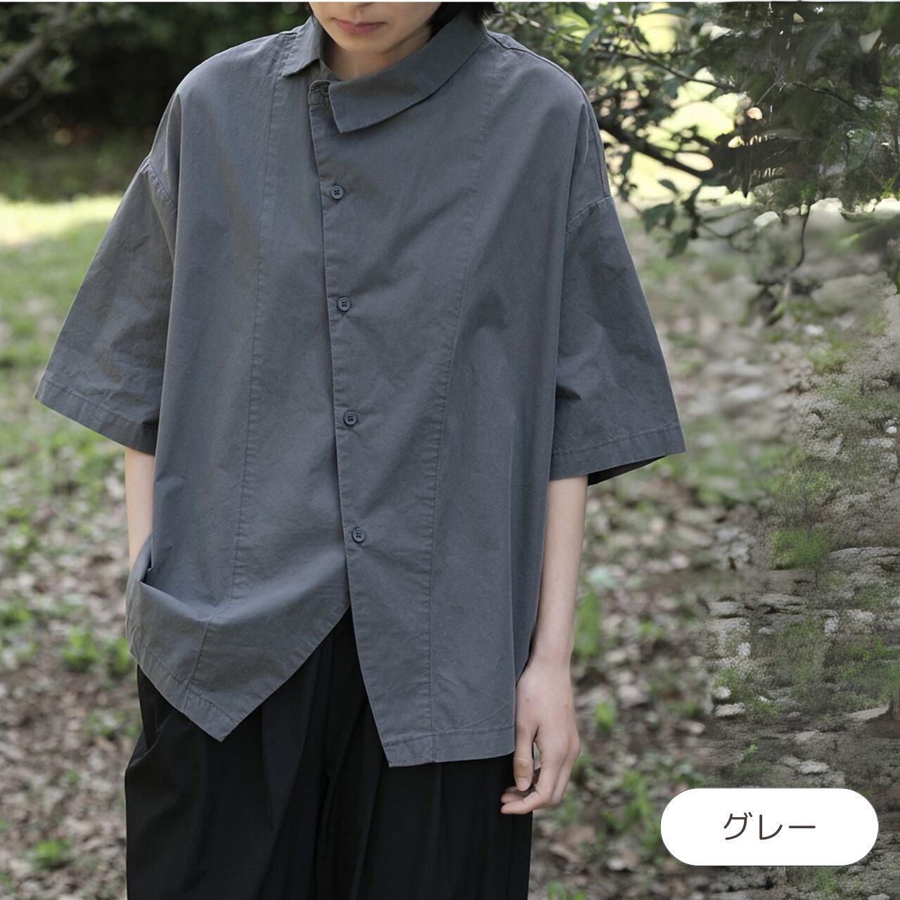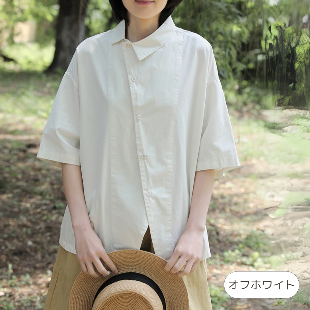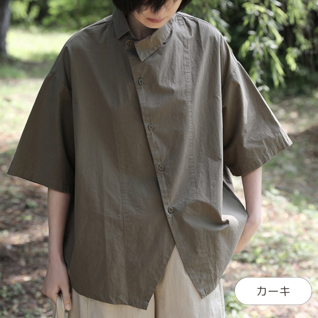 斜めに配置されたフロントデザインが目を惹く、オーバーサイズシャツ。