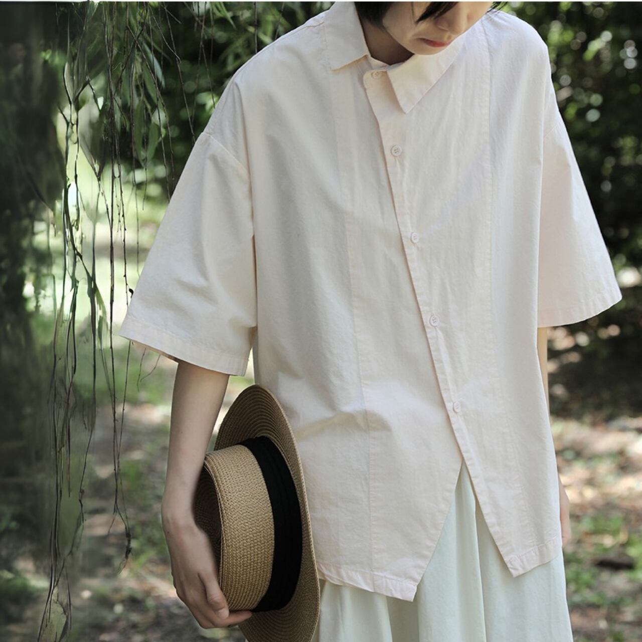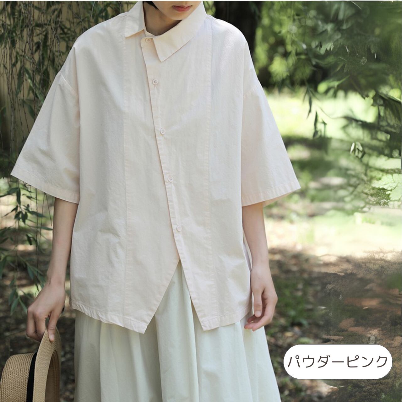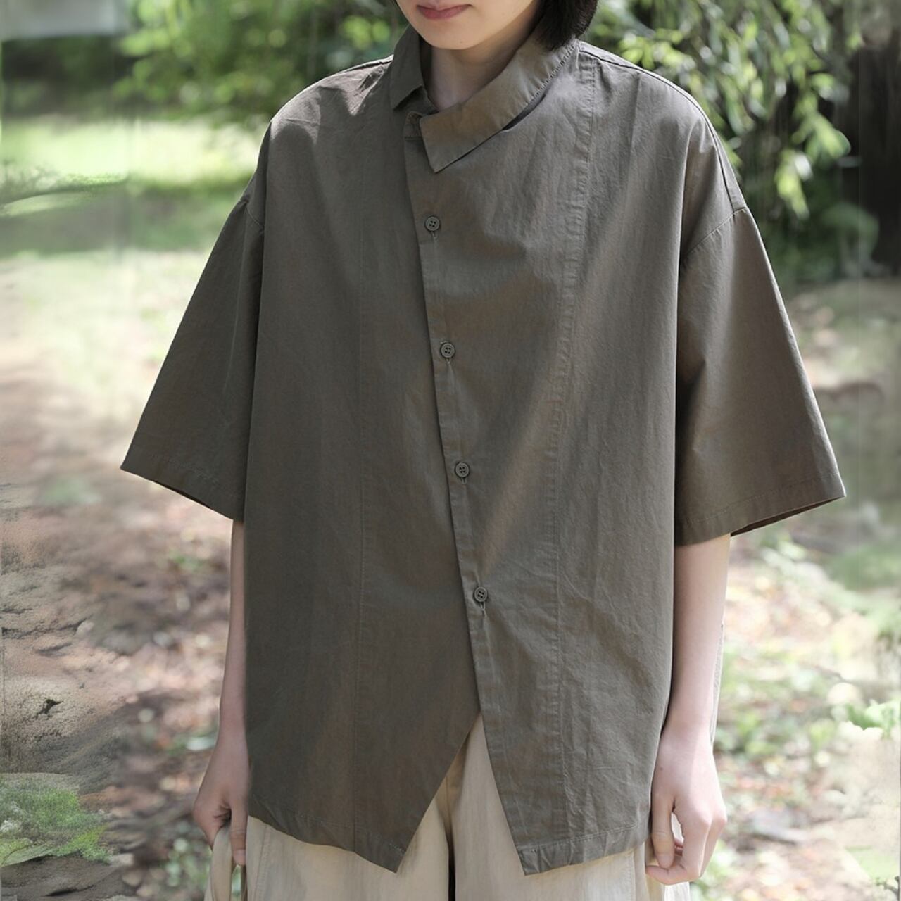 斜めに配置されたフロントデザインが目を惹く、オーバーサイズシャツ。