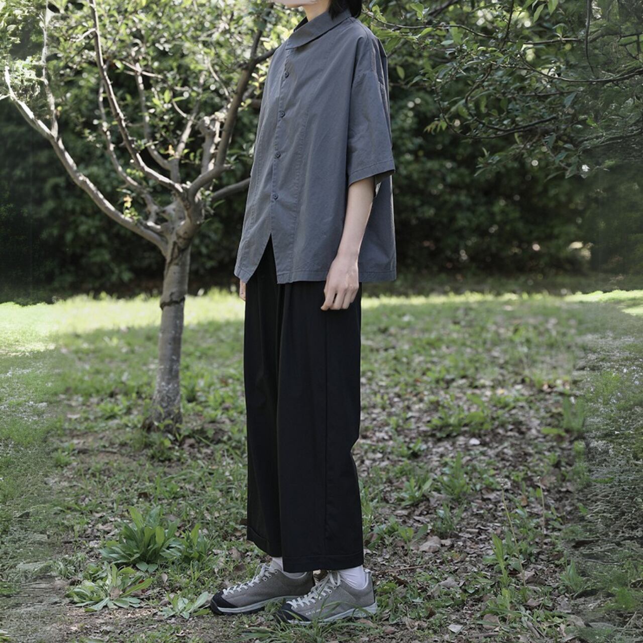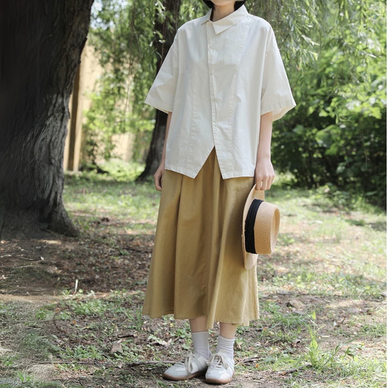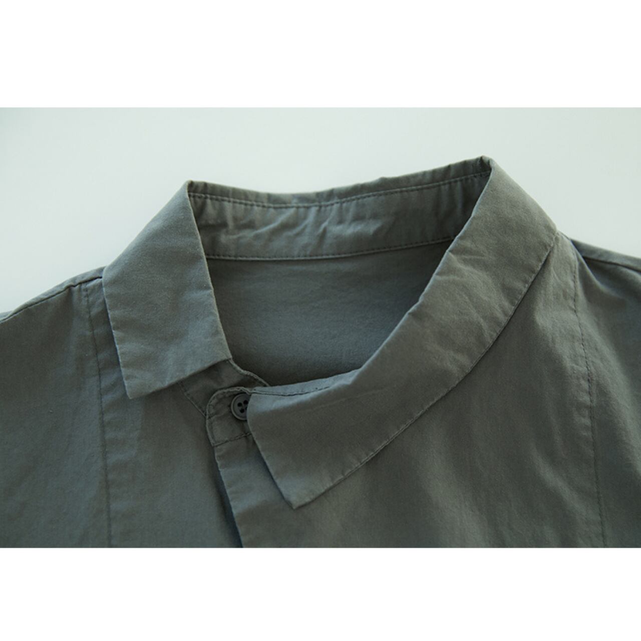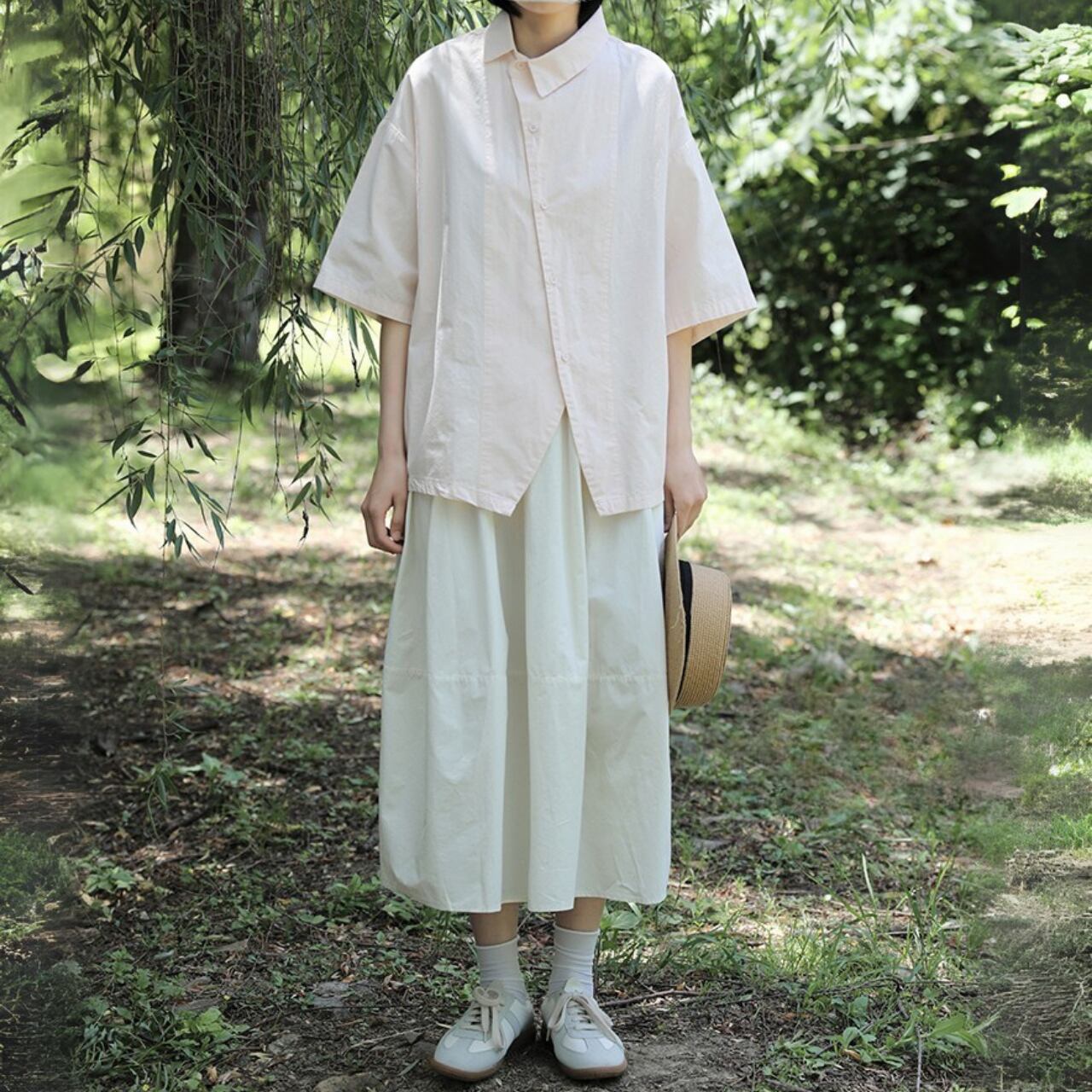 斜めに配置されたフロントデザインが目を惹く、オーバーサイズシャツ。
