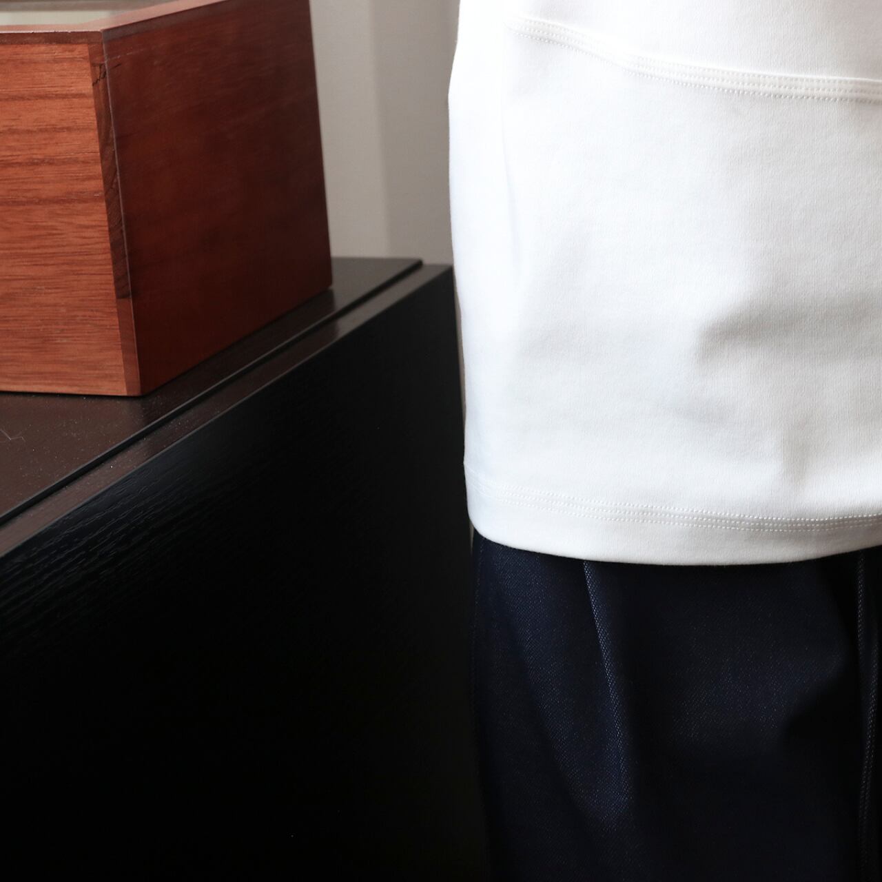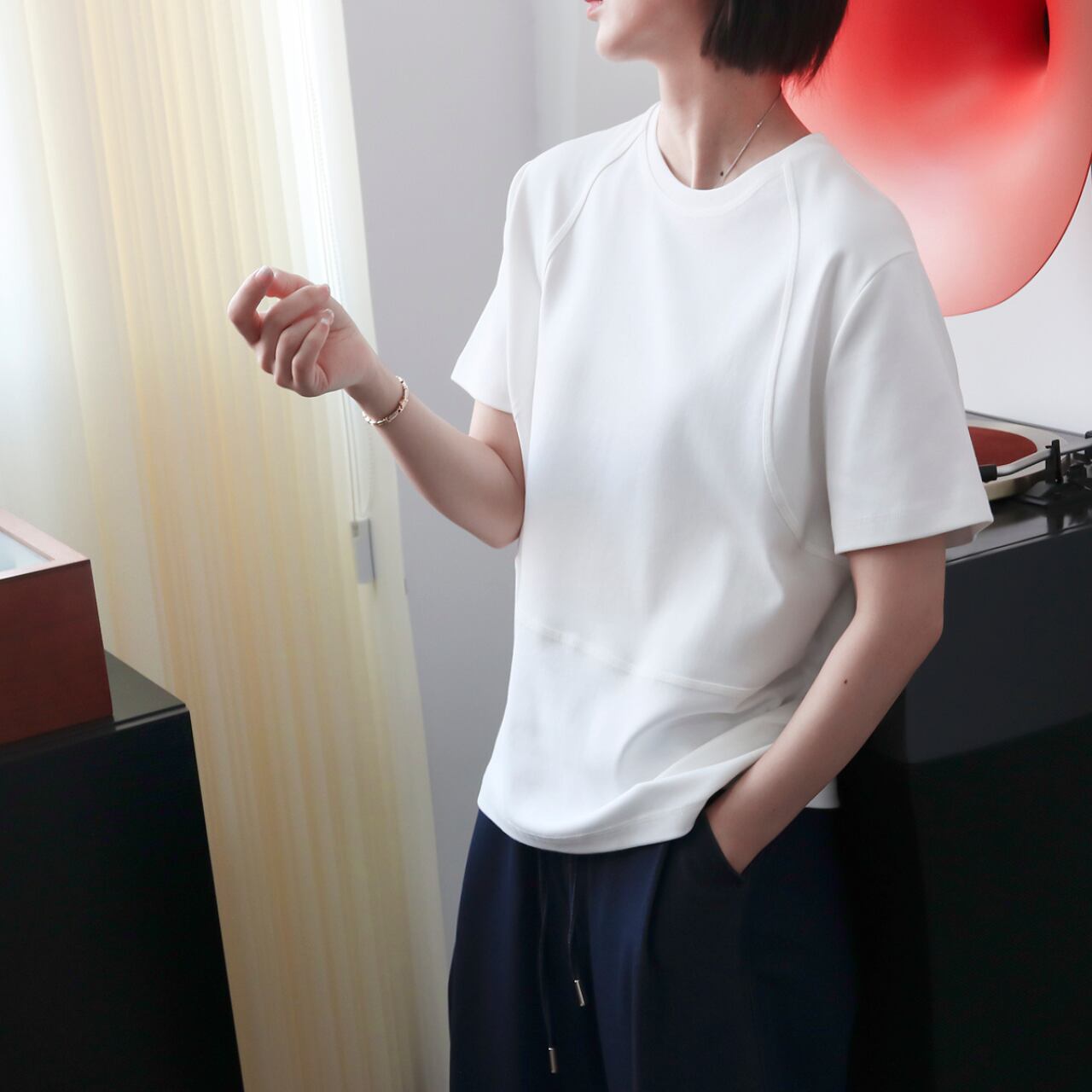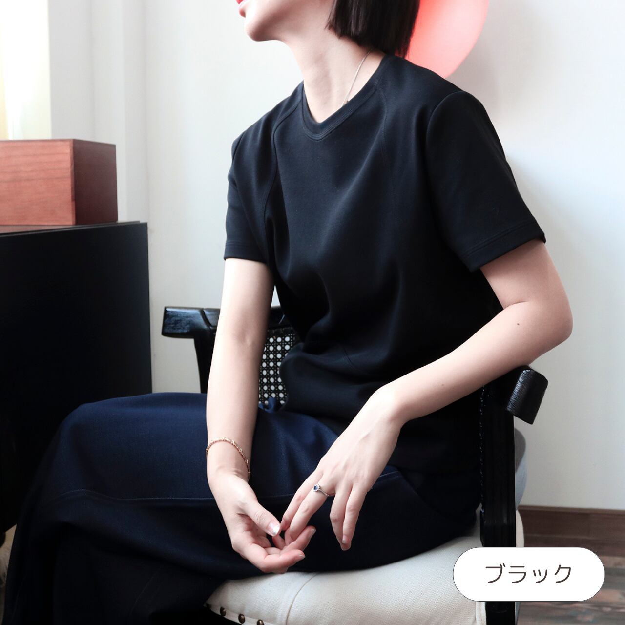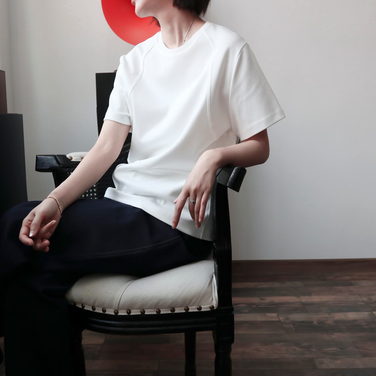 “前後にラインシームが施された、洗練カジュアルなTシャツ。さりげないアクセントを効かせたデザインで、シンプルながらもスタイルに奥行きをプラス!ゆったりめのシルエットが、リラックス感とこなれ感を両立。一枚で着てもサマになり、ジャケットやシャツのインナーにも馴染みやすい一着です。”