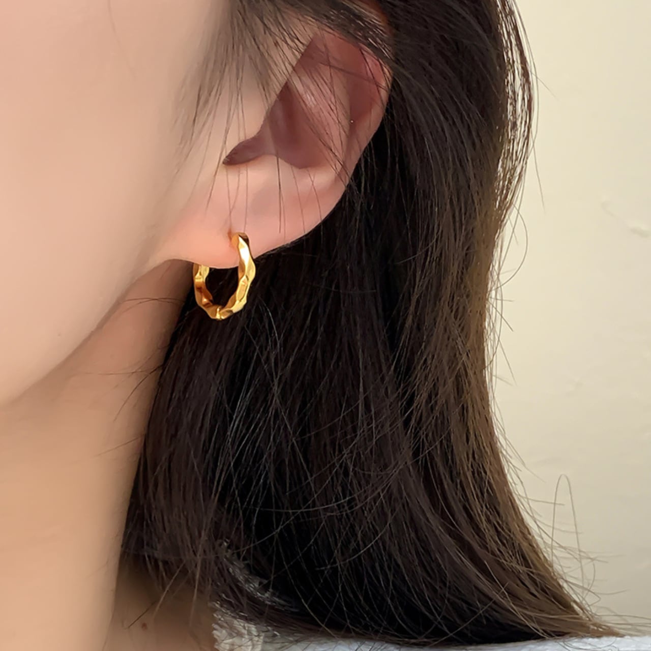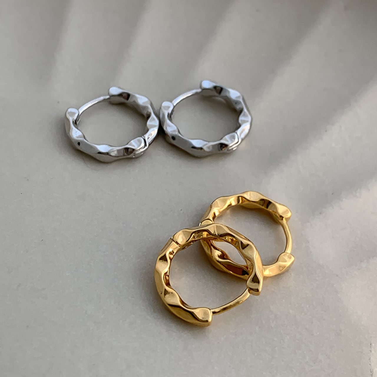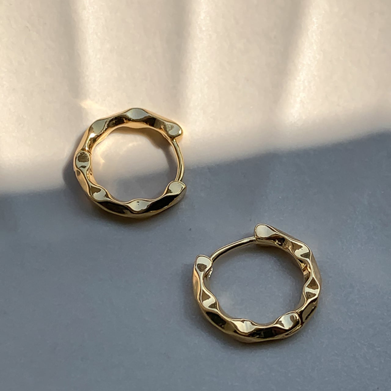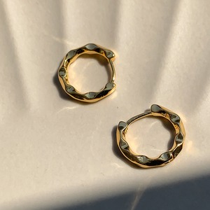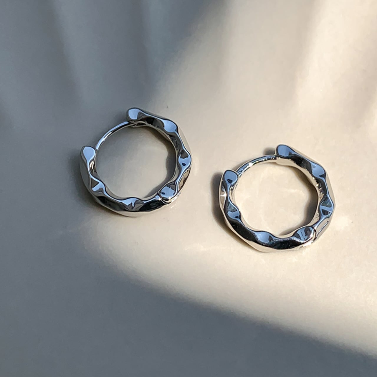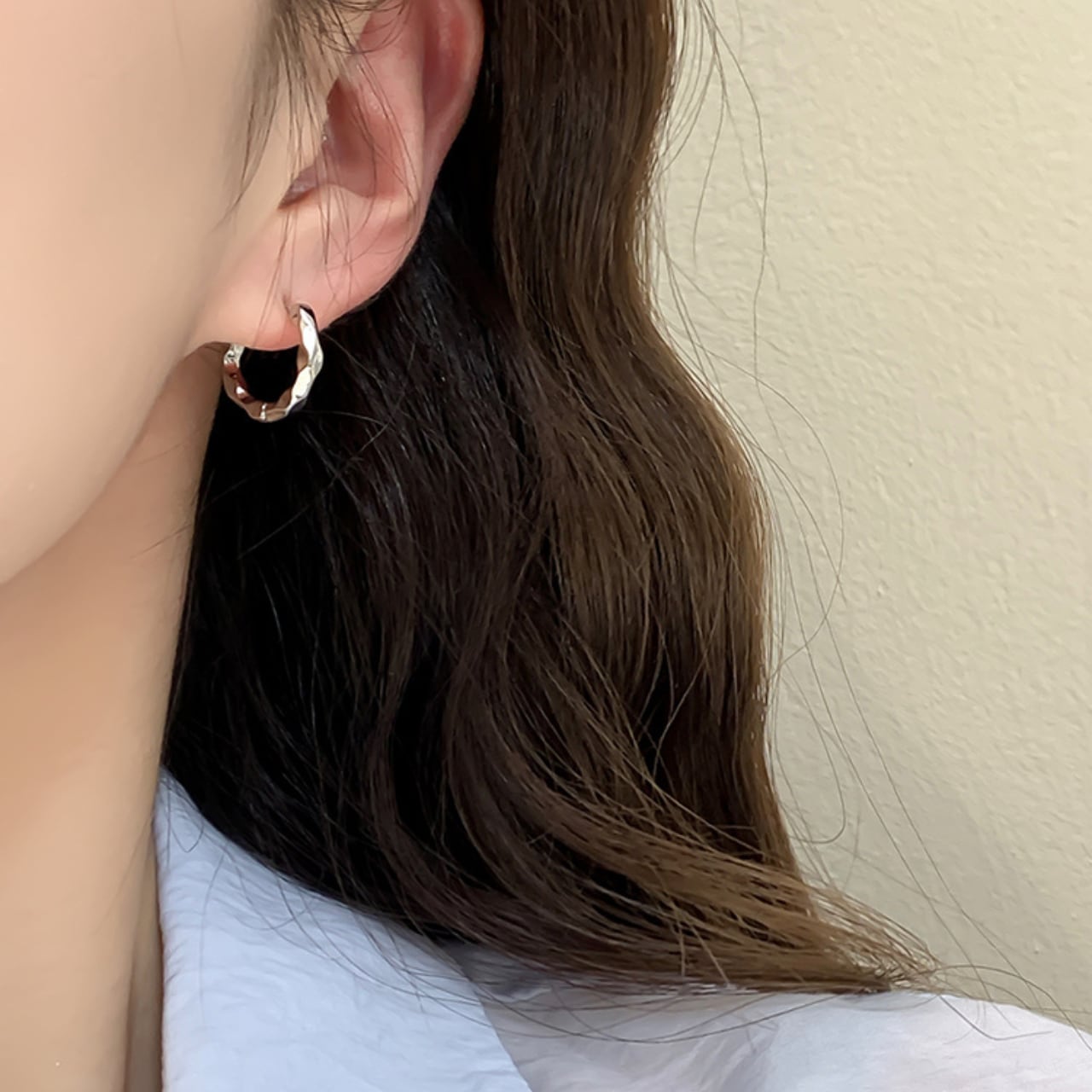 “さりげない個性が光る、クラッシュ風ラインが印象的なミニフープピアス。柔らかな光沢感と凹凸のある表情が、耳元をモードに彩ります。小ぶりながら存在感があり、デイリー使いにぴったり!”