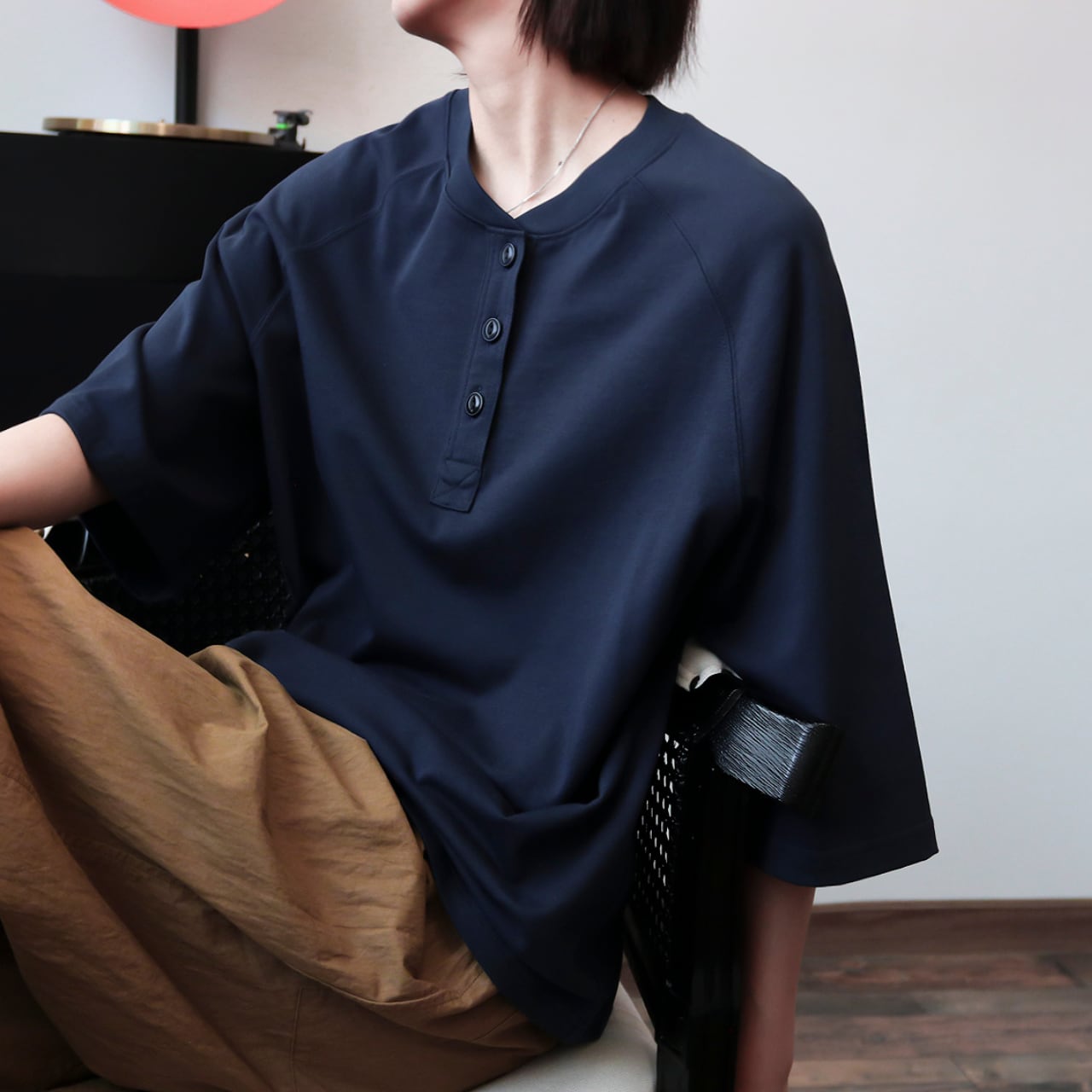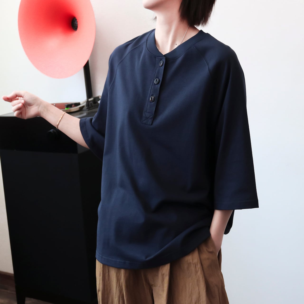 胸元のヘンリーネックが程よく抜け感をプラスする、大人カジュアルなTシャツ。