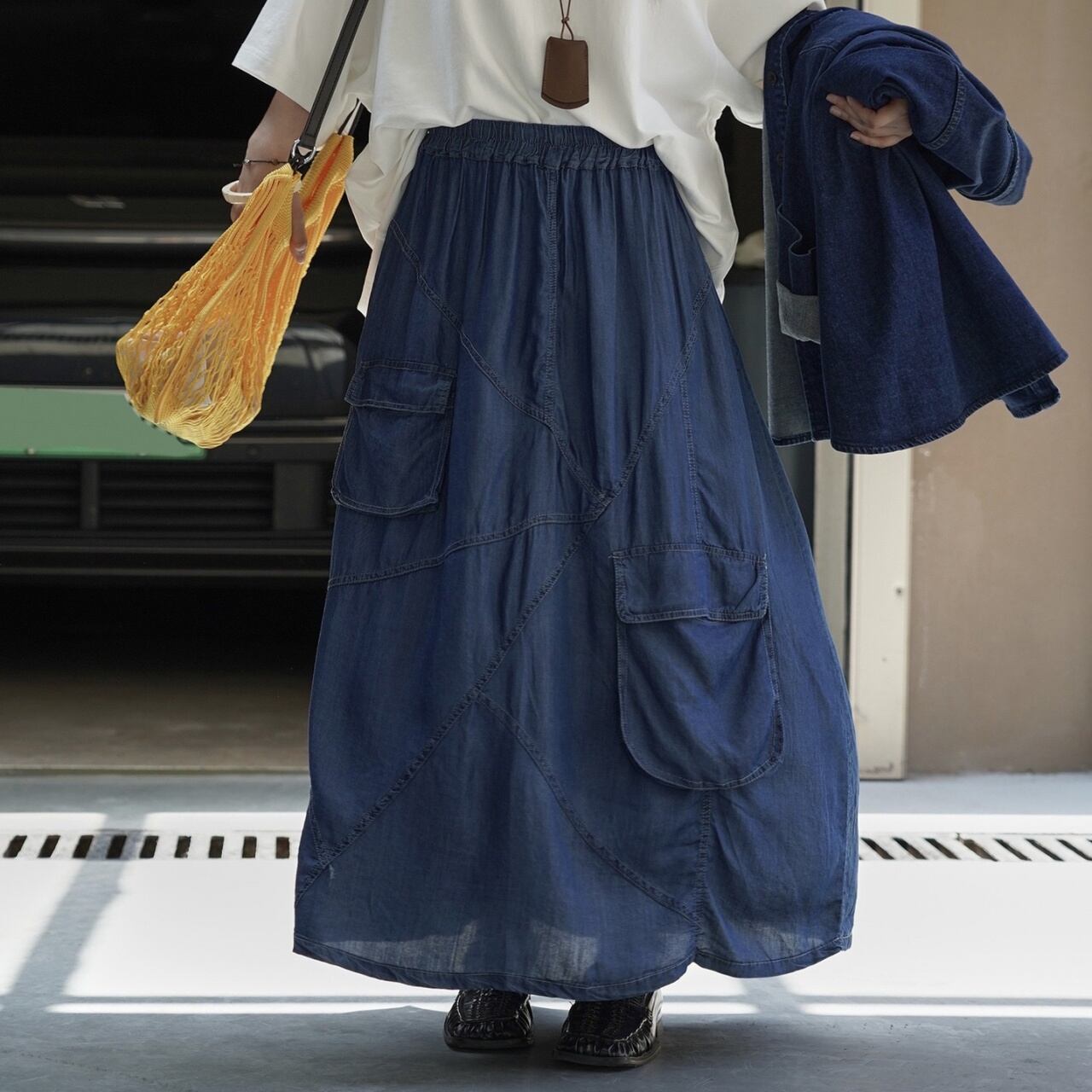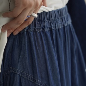 デザインステッチが魅力的なパッチワークデニムスカート。