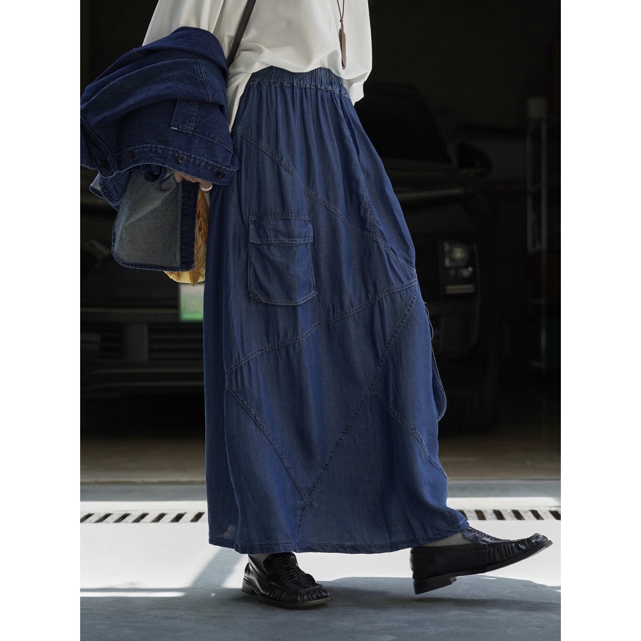 複数のデニム生地を組み合わせたパッチワークデザインが、着こなしに個性をプラスします。