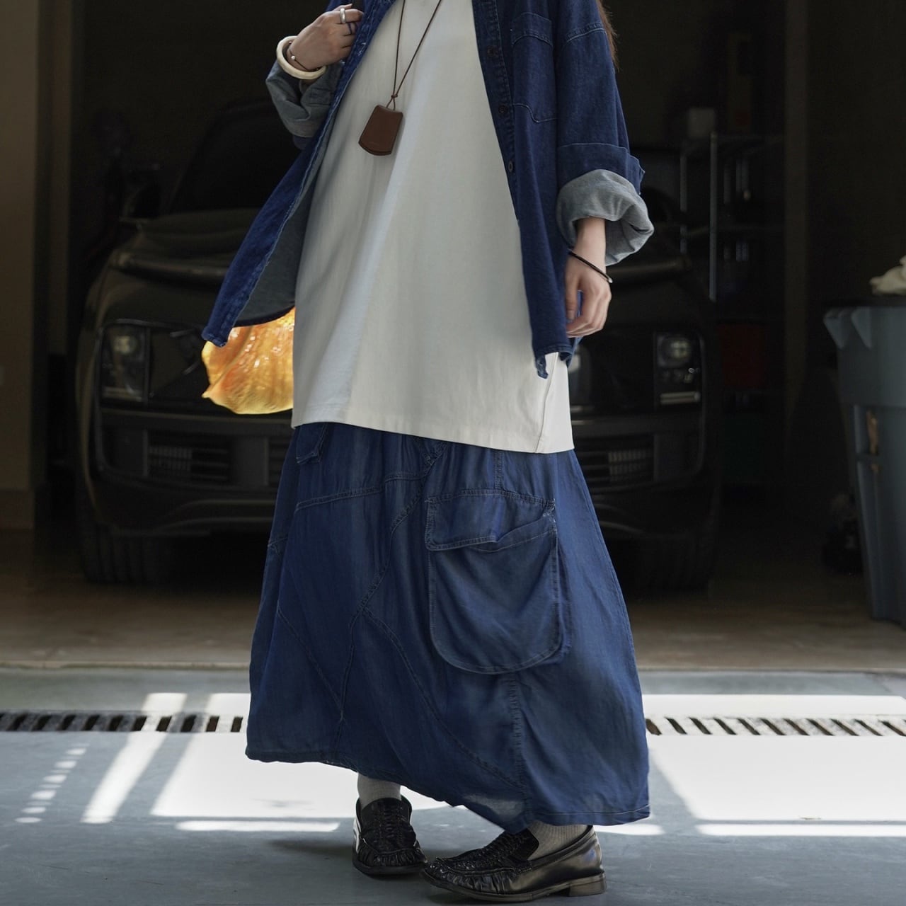カジュアルなTシャツと合わせても、ブラウスと合わせてきれいめスタイルにしても◎