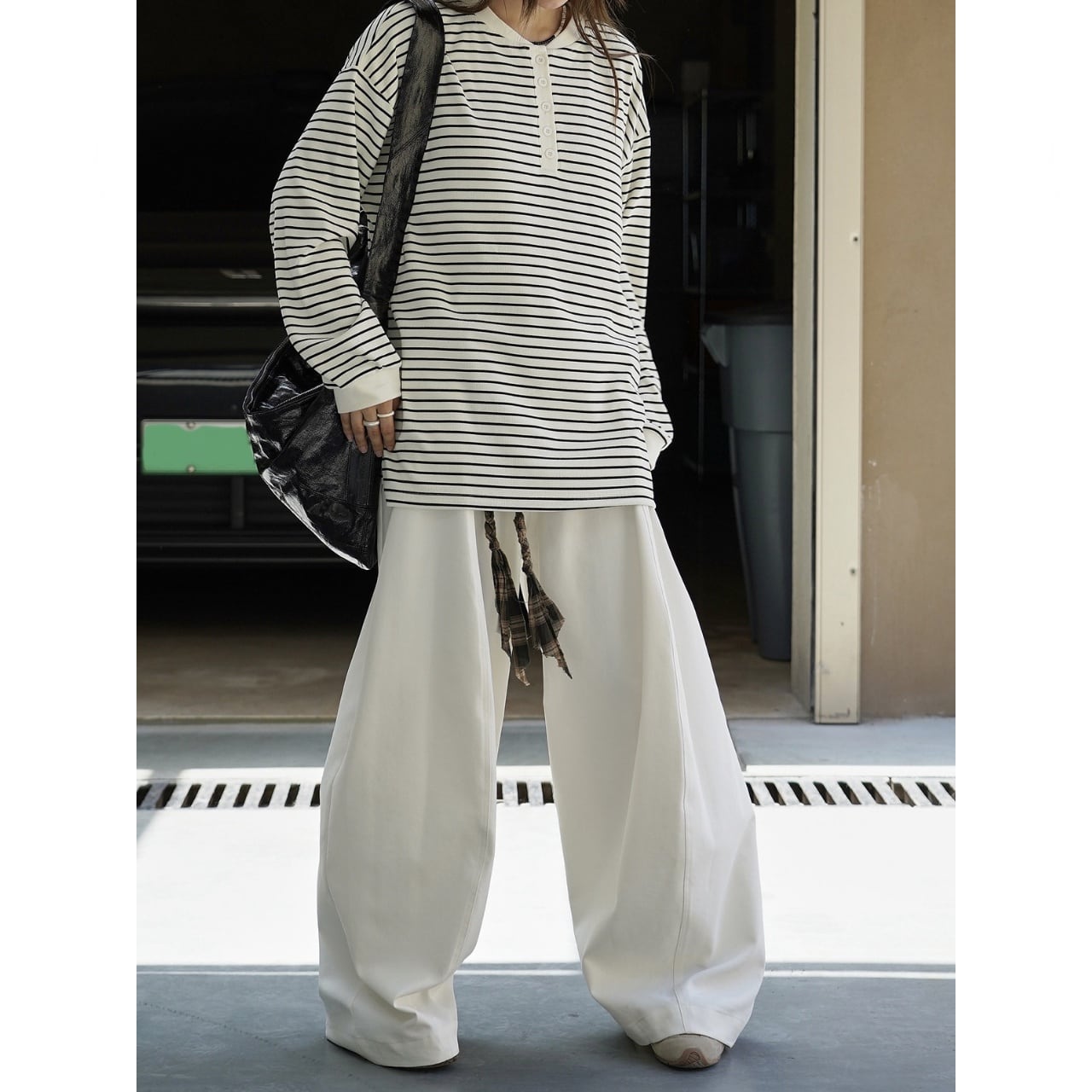カジュアルだけどどこか上品な雰囲気漂う、オーバーサイズのヘンリーネックTシャツ。