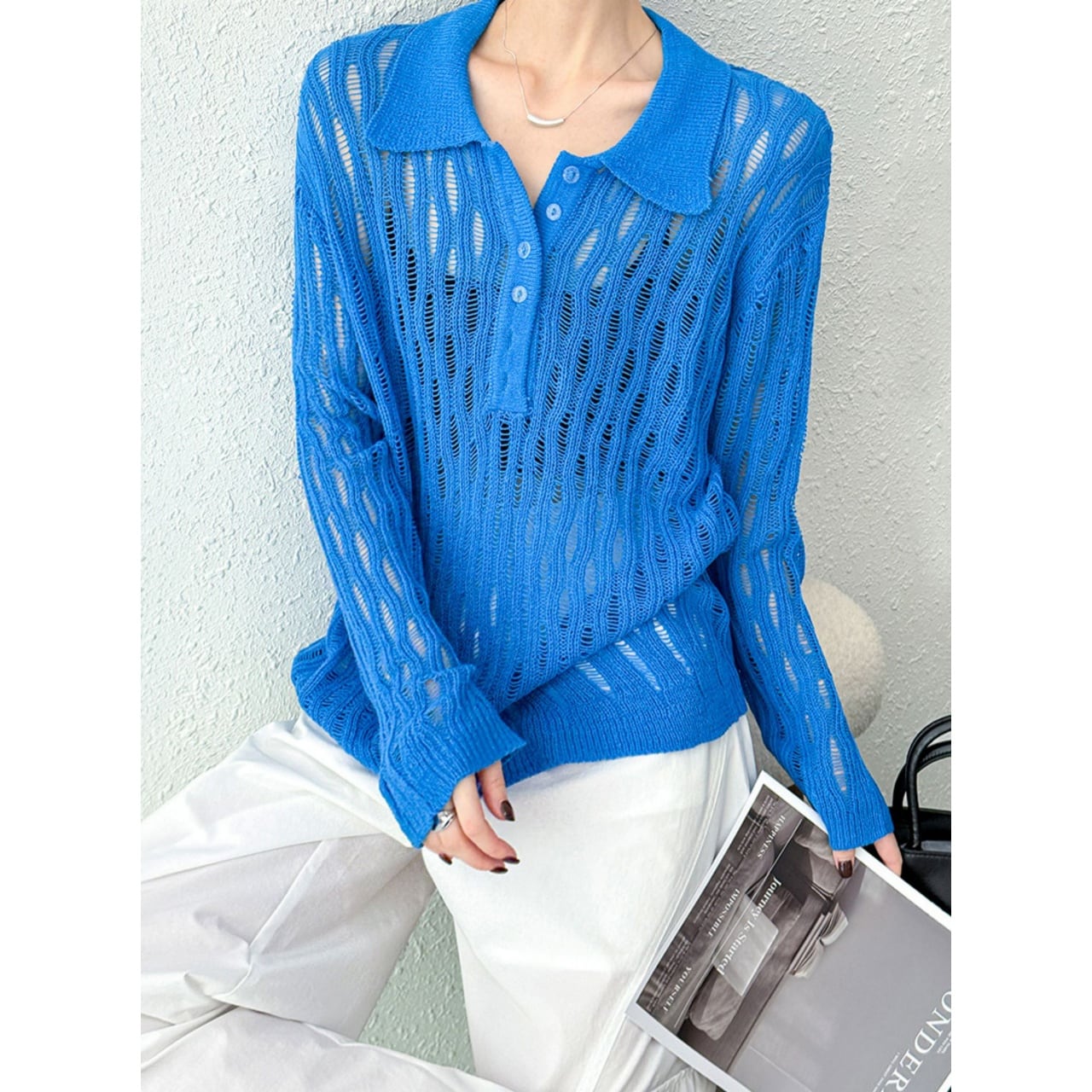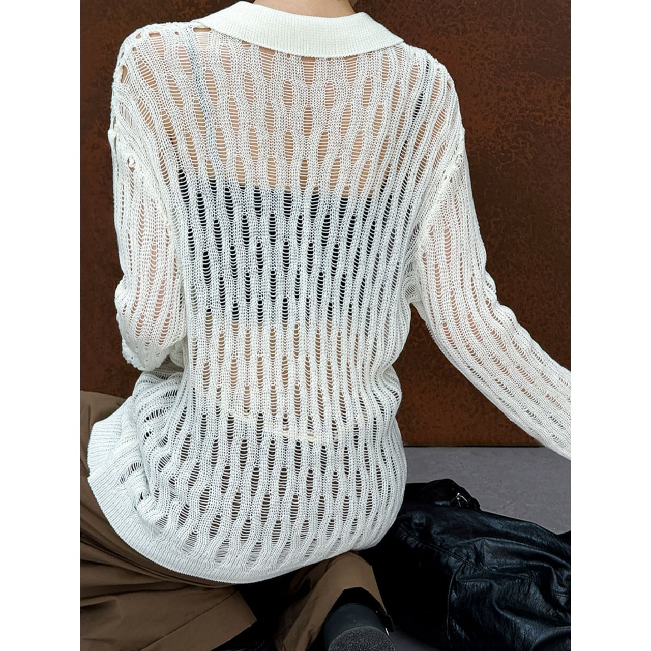 上品なポロネックと繊細な透かし編みが、大人の女性らしさを演出します。