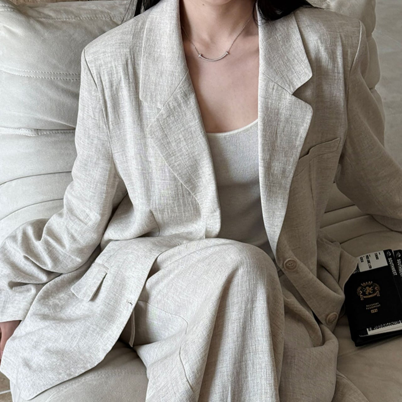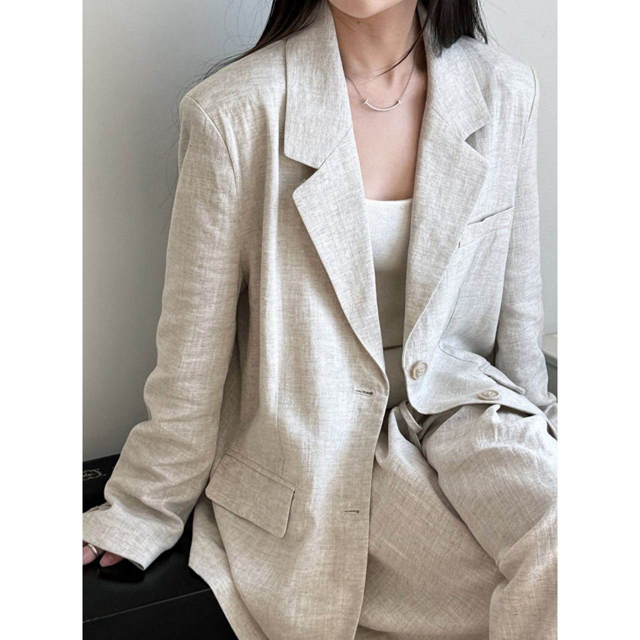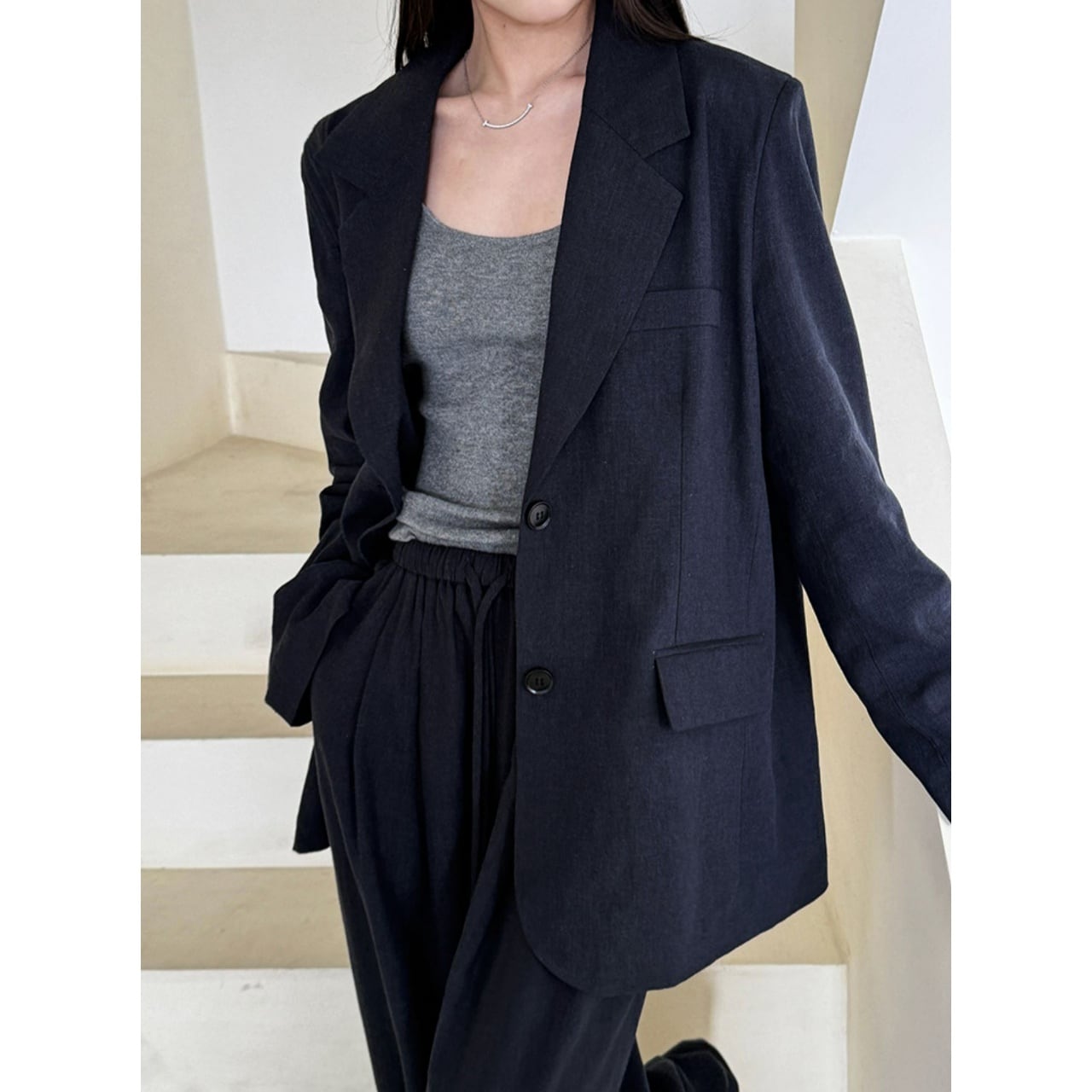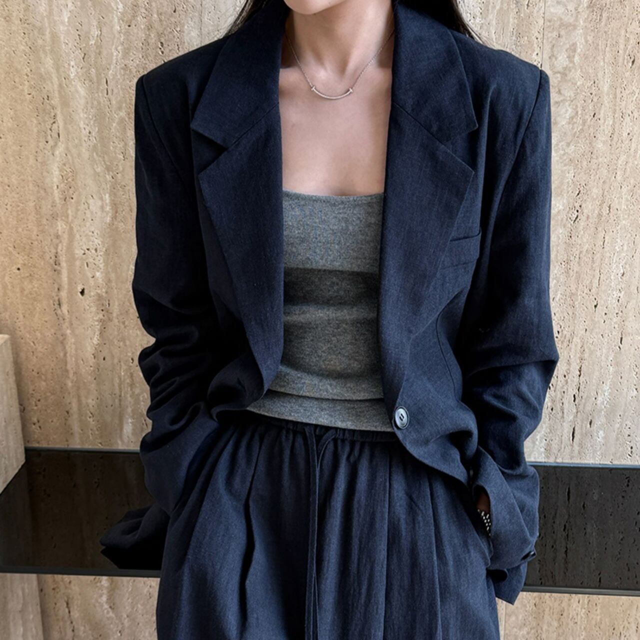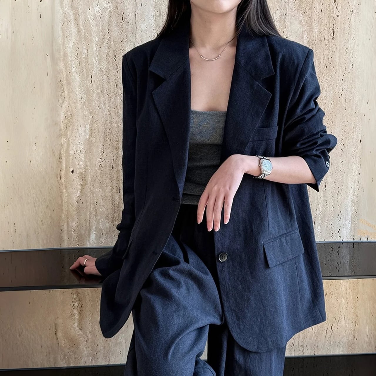 堅苦しくなりすぎない絶妙なシルエットと、落ち着いたカラーが洗練された印象を与えます。