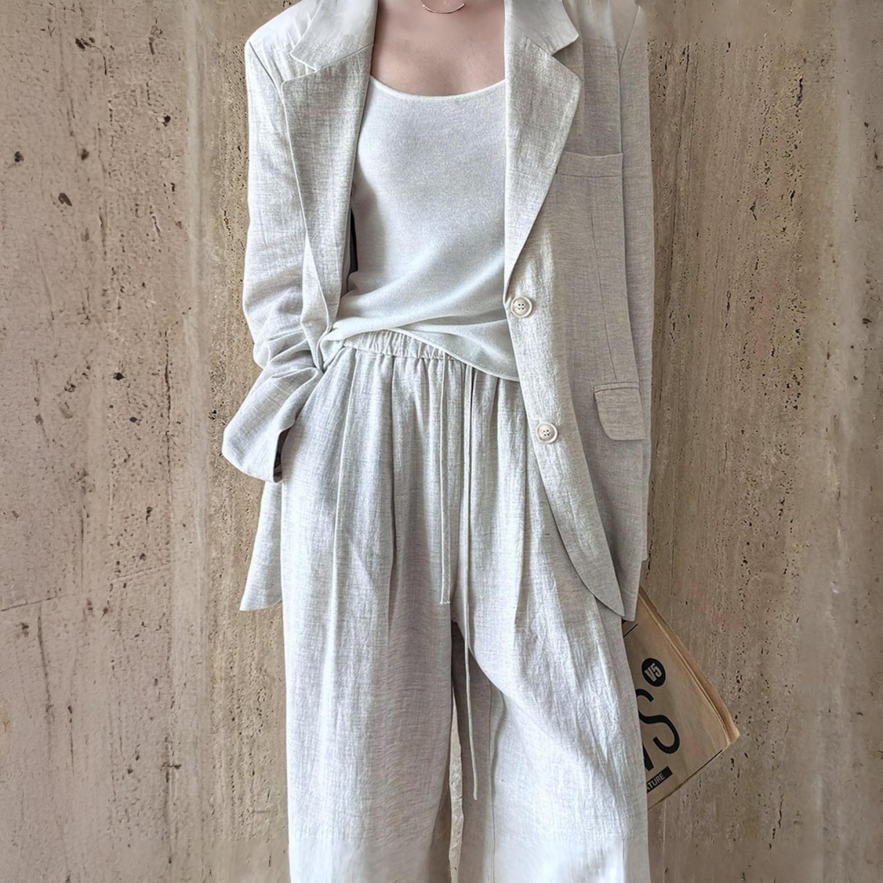 同素材のボトムスと合わせれば、セットアップでの着こなしも楽しめます。