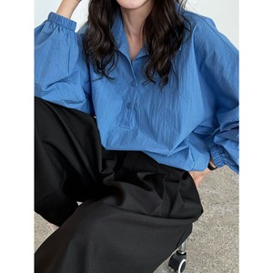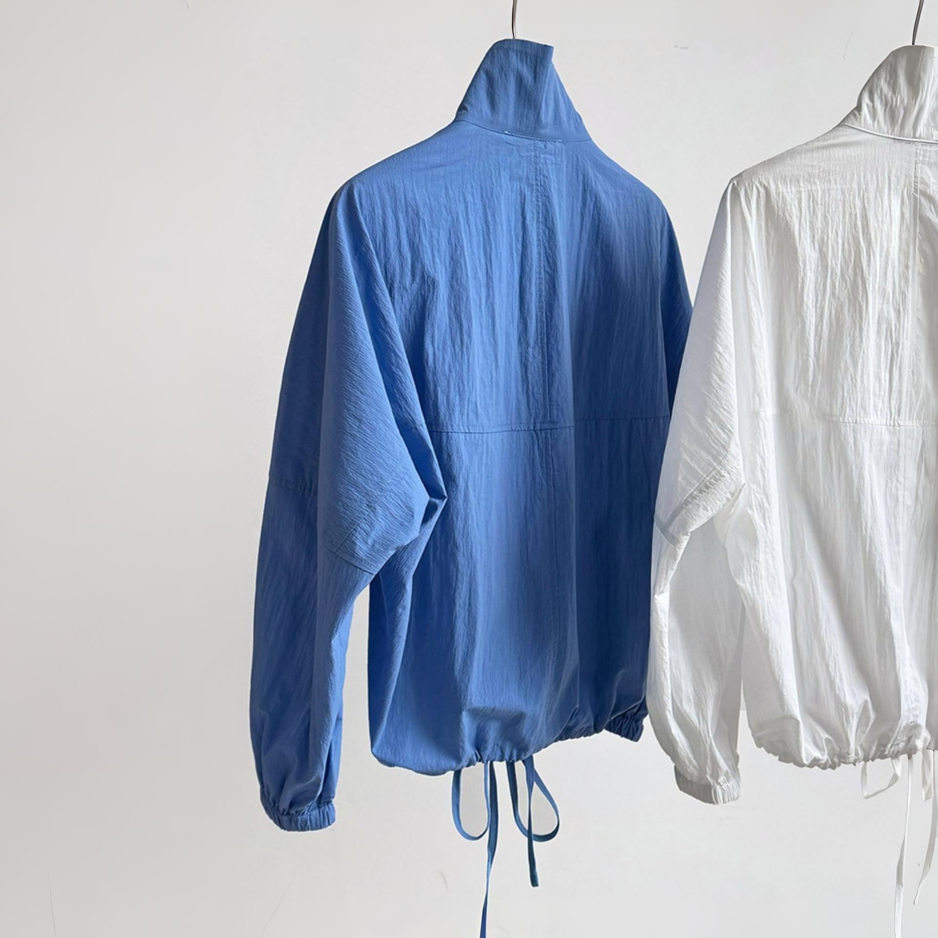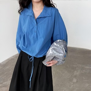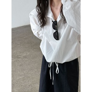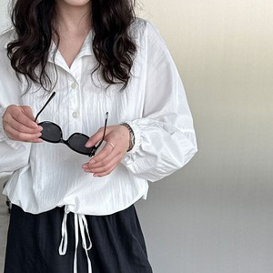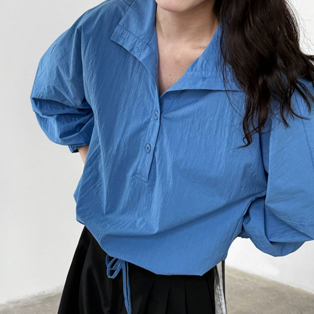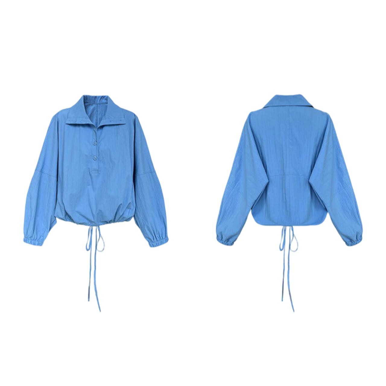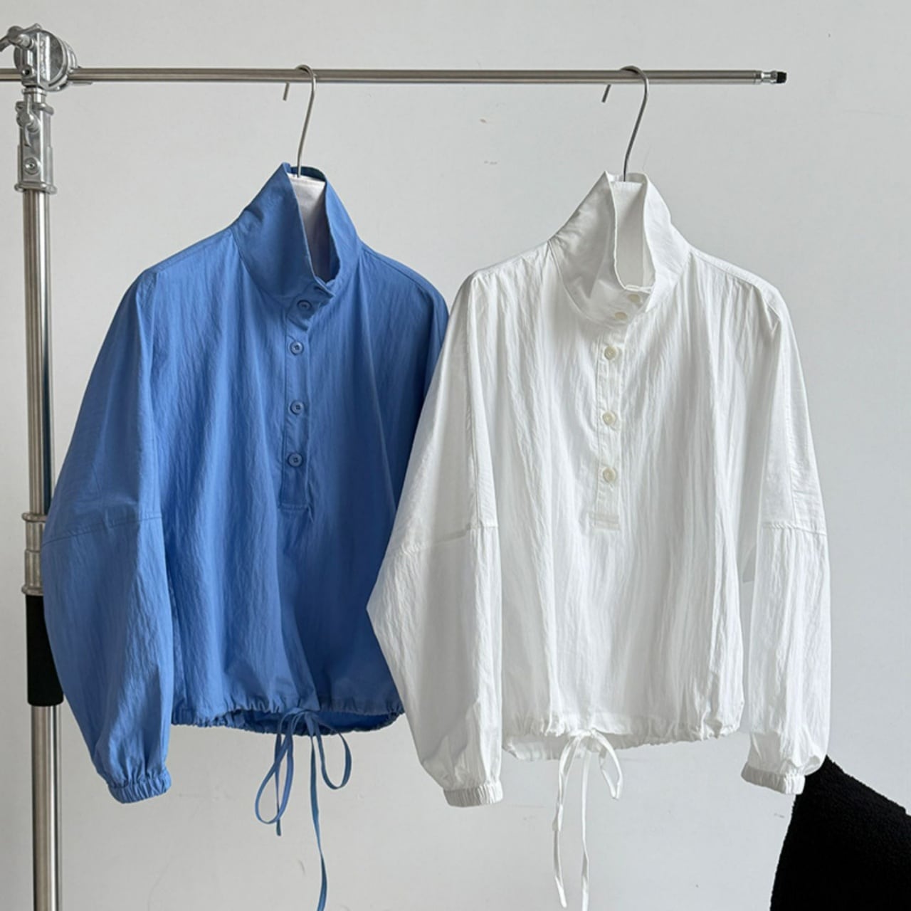 スタンドカラーとドローストリングがアクセントのブラウス。
