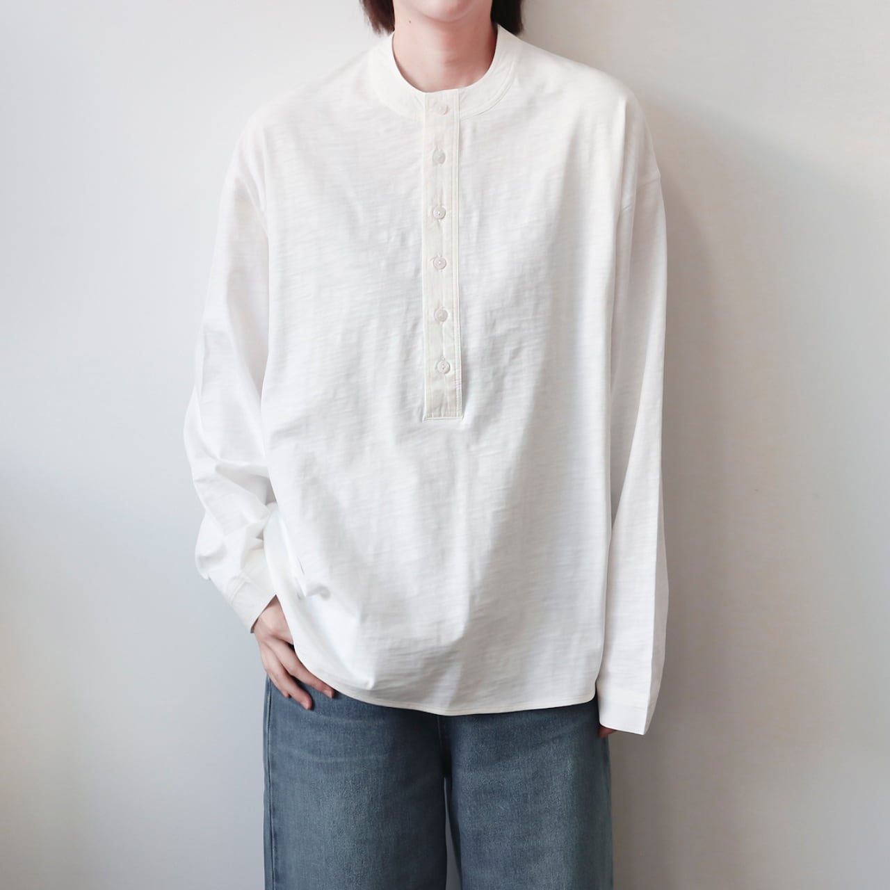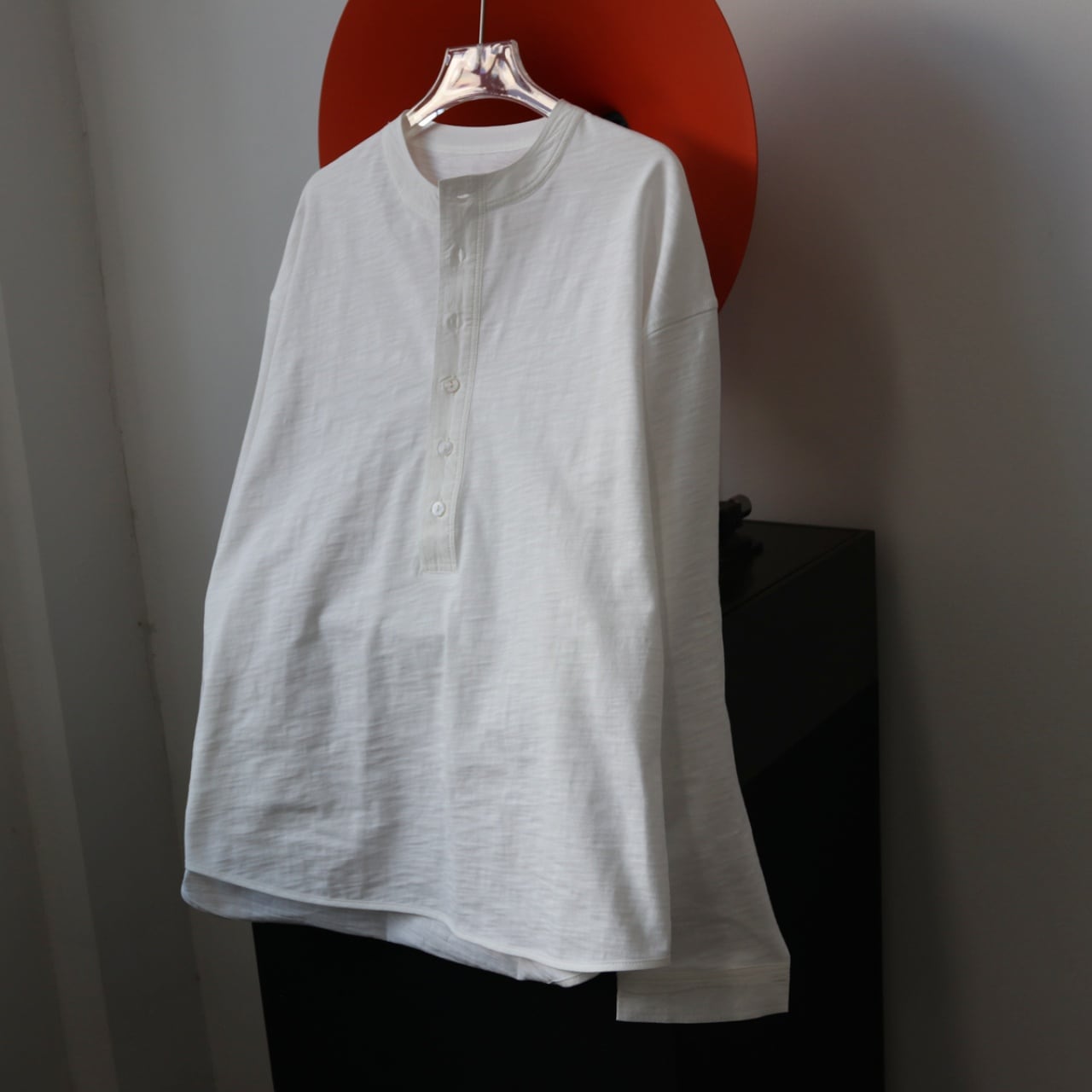 トレンド感のあるオーバーサイズシルエットが魅力のヘンリーネックTシャツ。