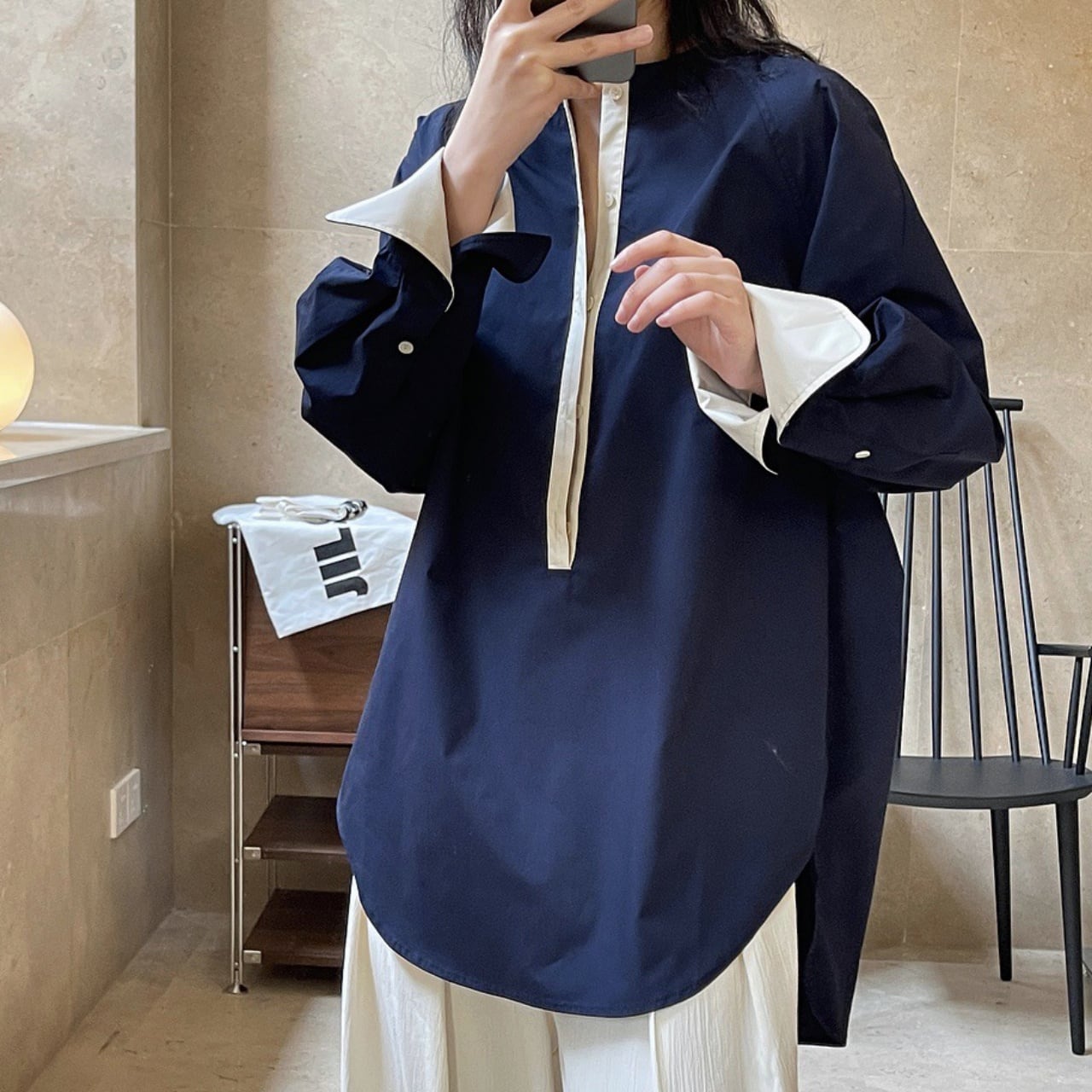 大人のこなれ感を演出する、洗練されたバイカラーシャツ。