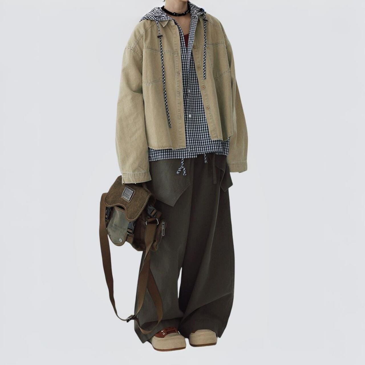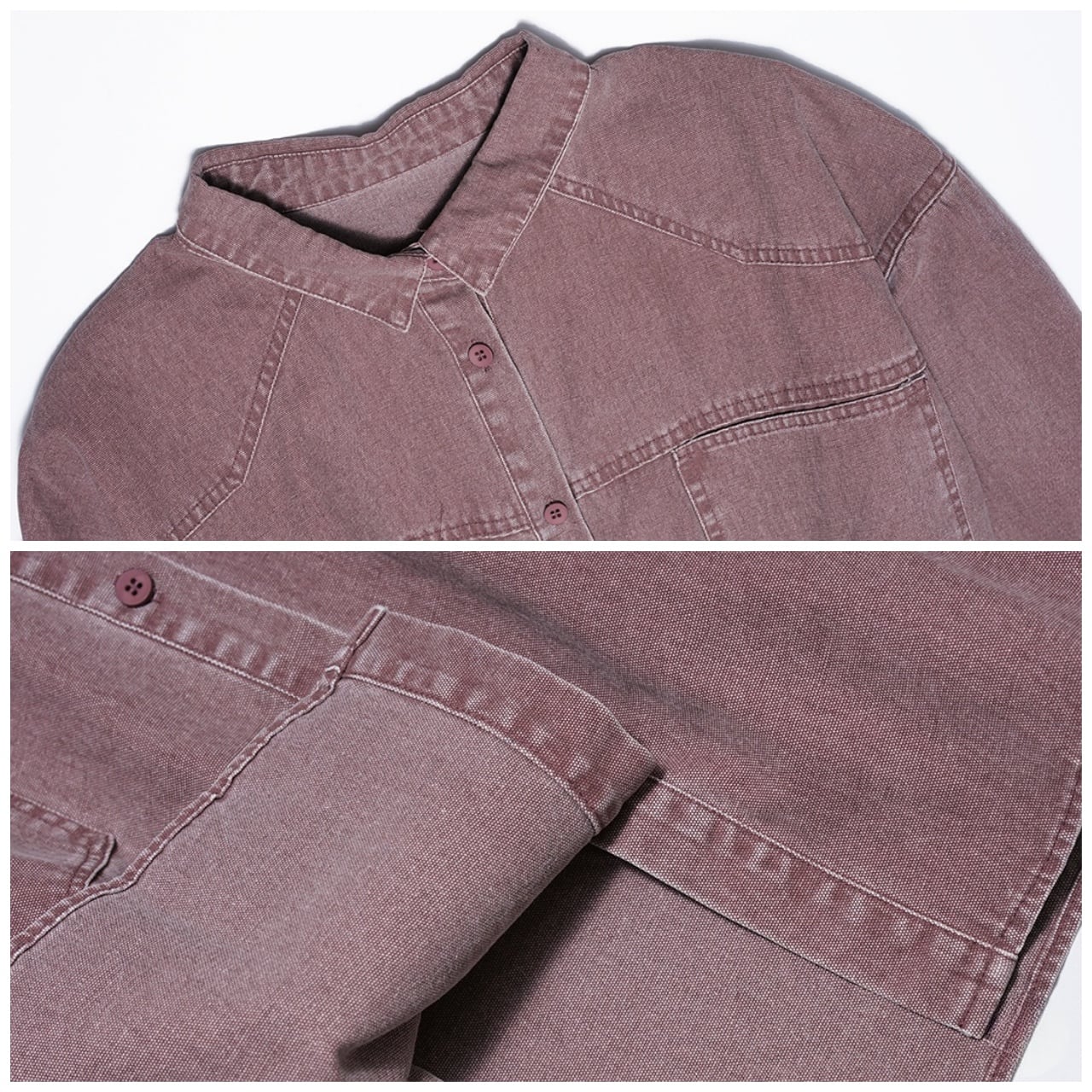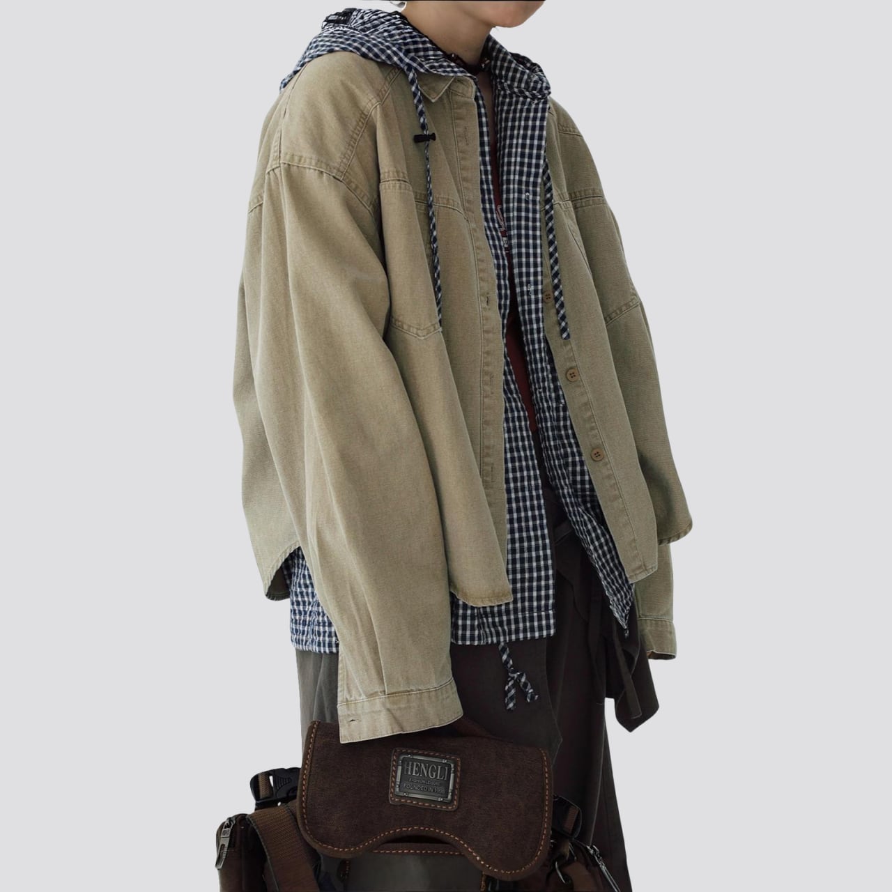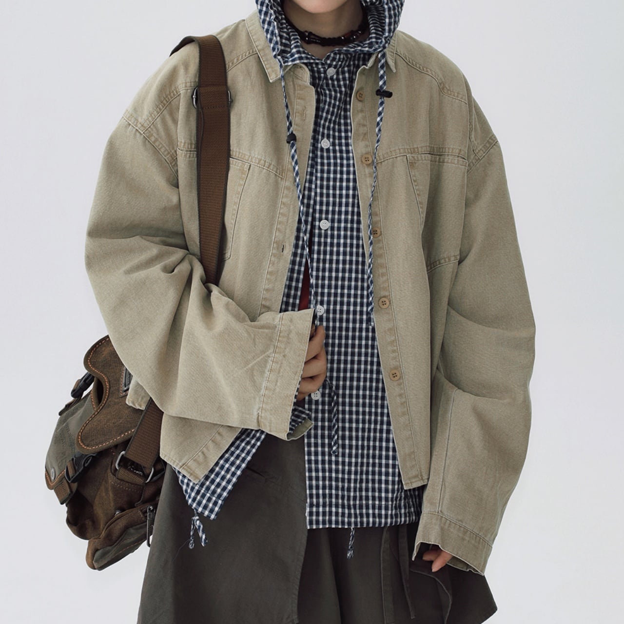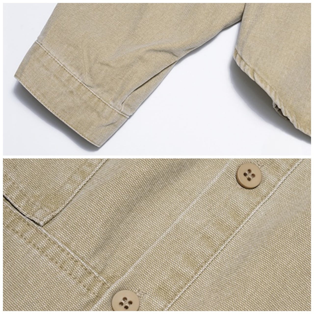 ワークジャケットのタフなつくりに、襟元のラペルが加わり、武骨さと上品さを両立。
