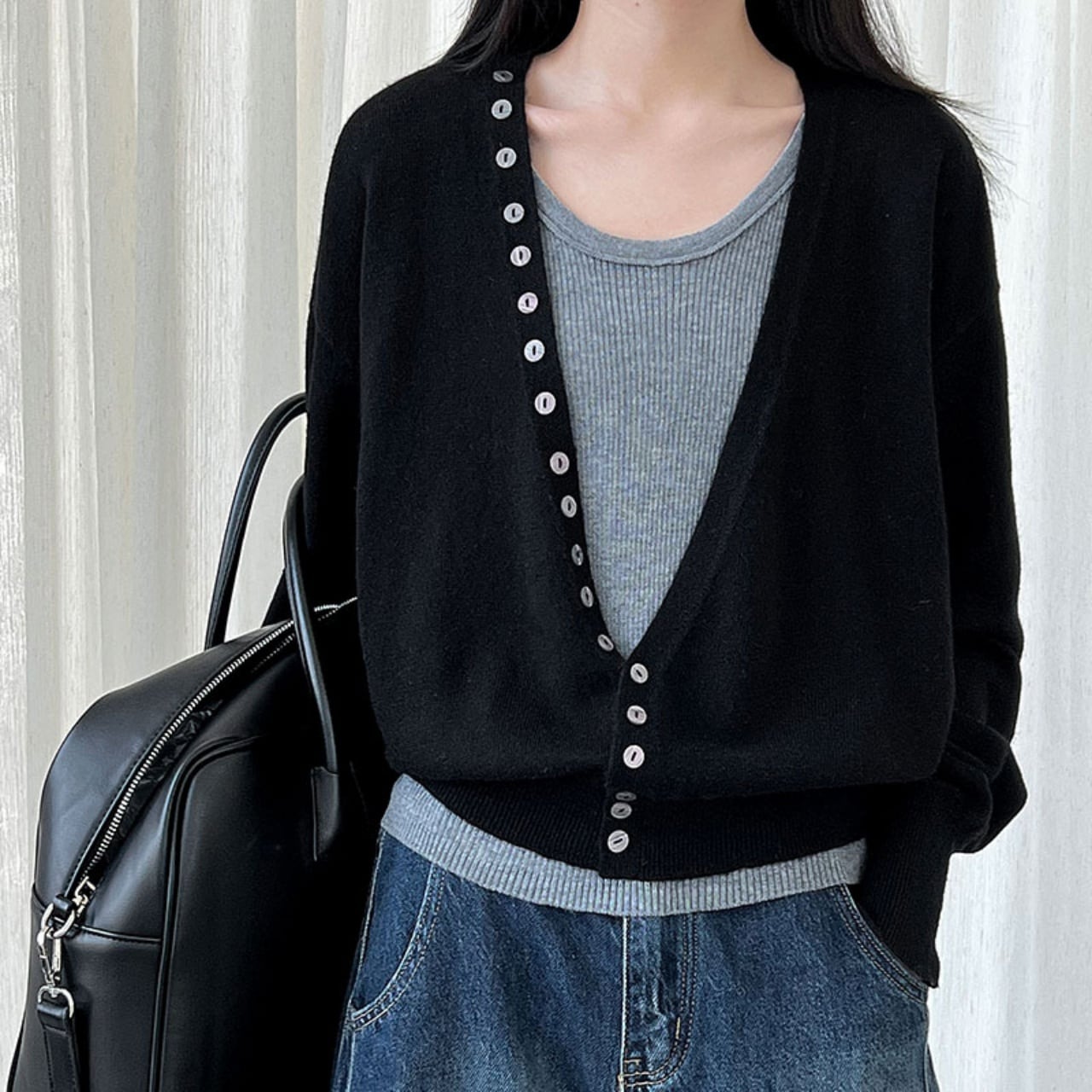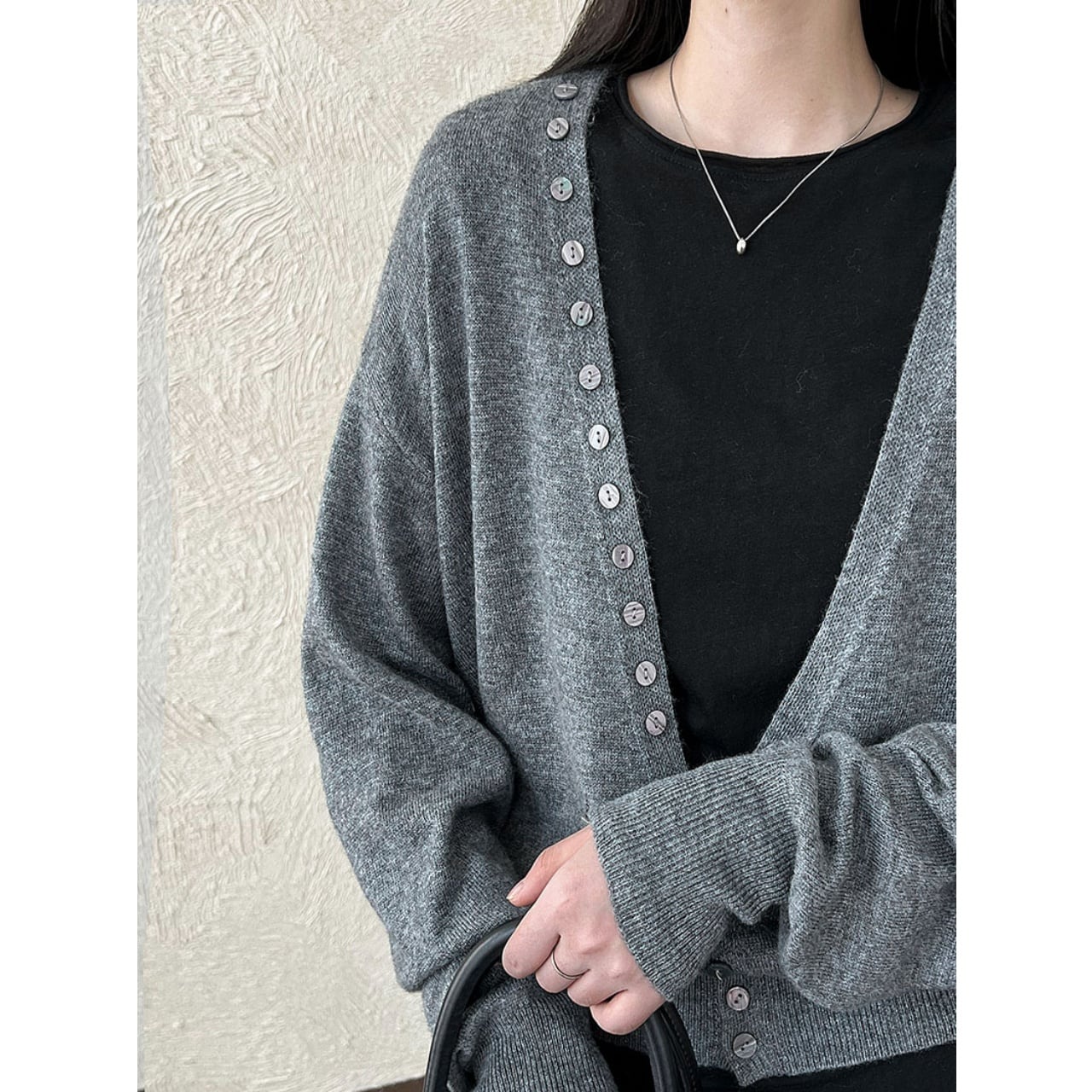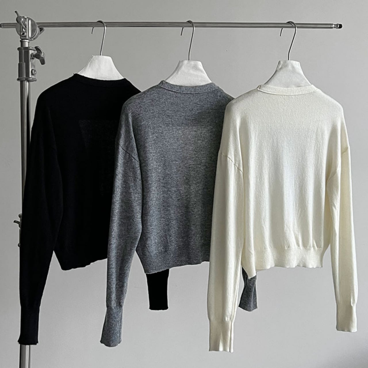 深めのVネックがデコルテを美しく見せ、インナーとのレイヤードも自由自在。