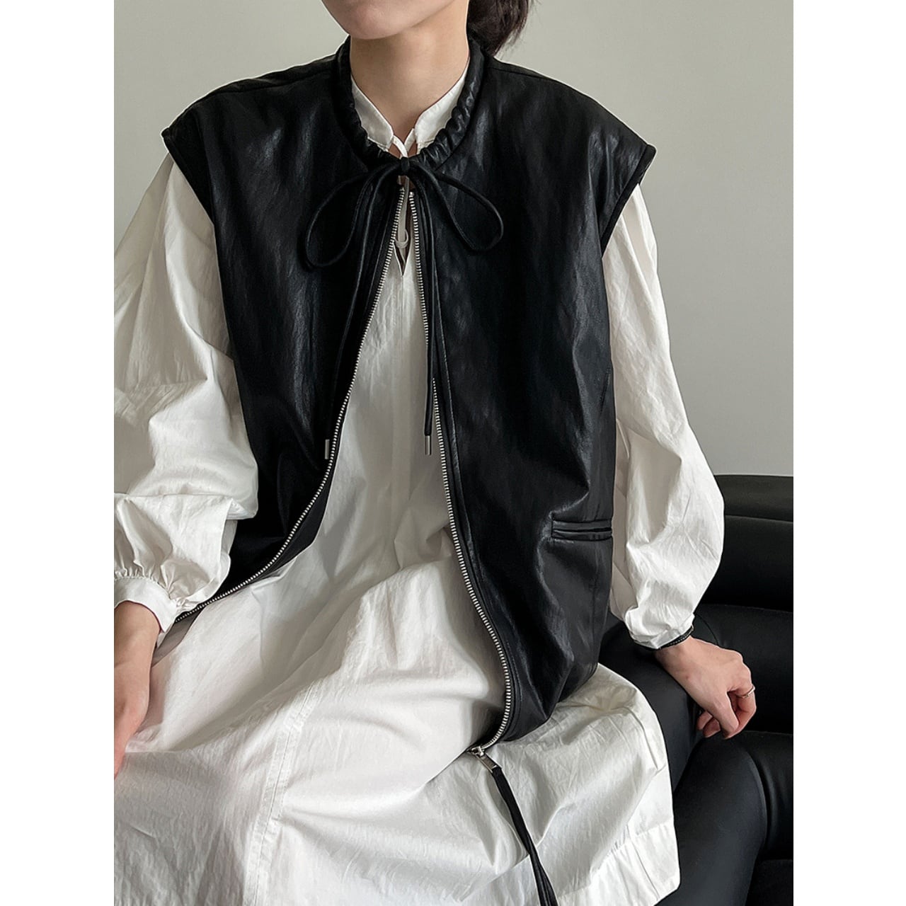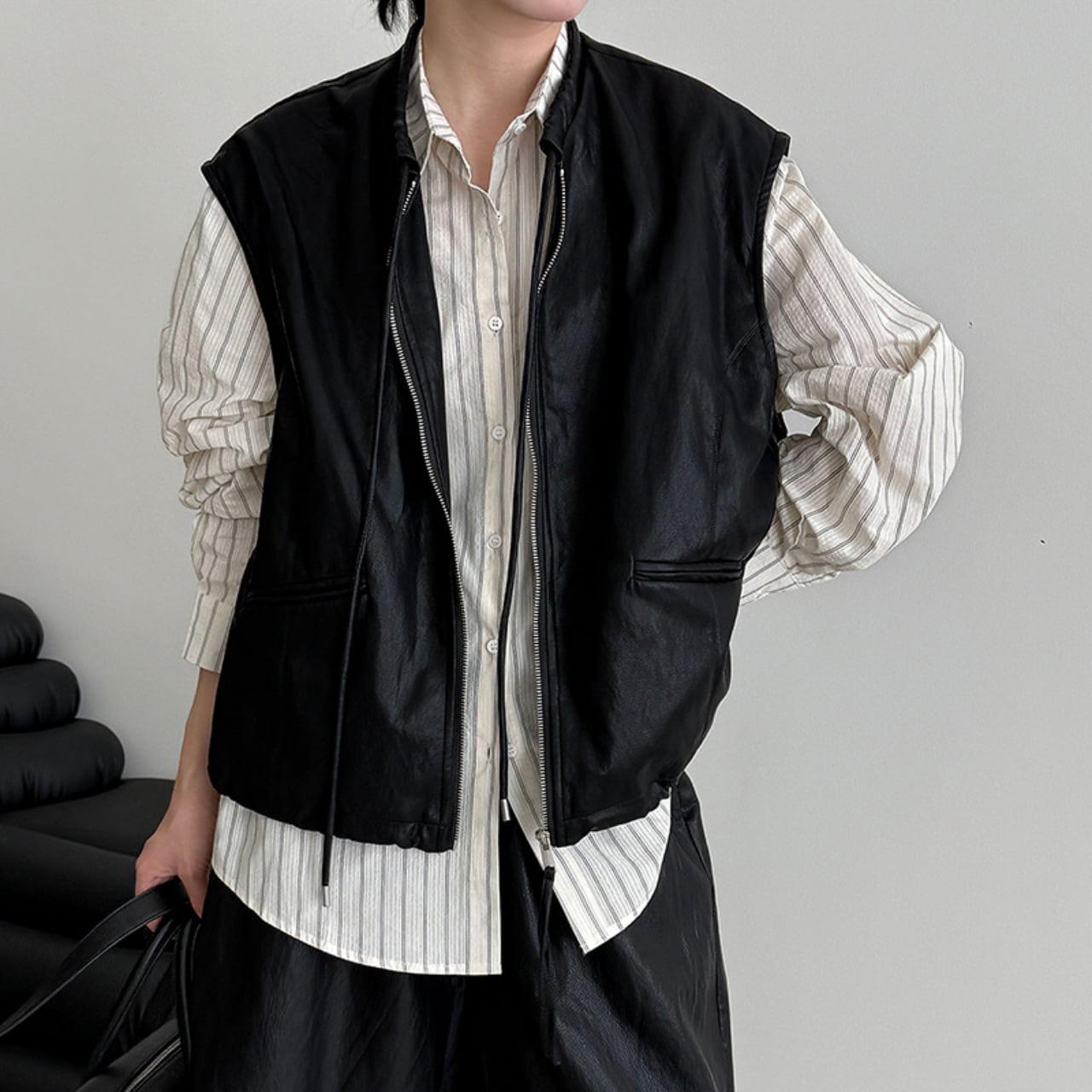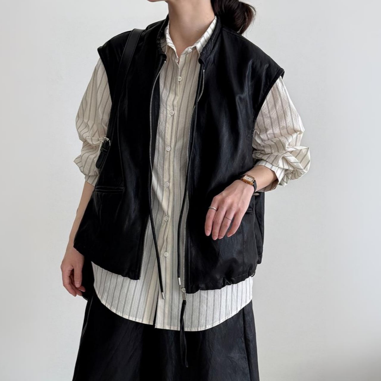 シャツやニットの上に重ねるだけで決まる、レザーライクベスト。