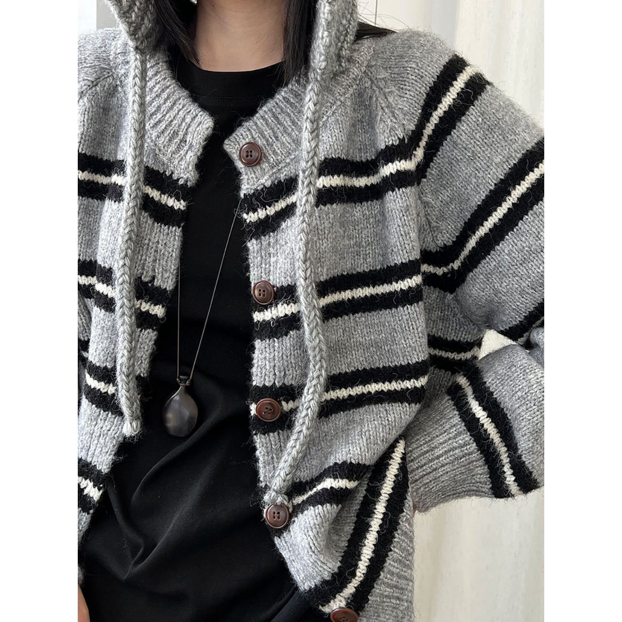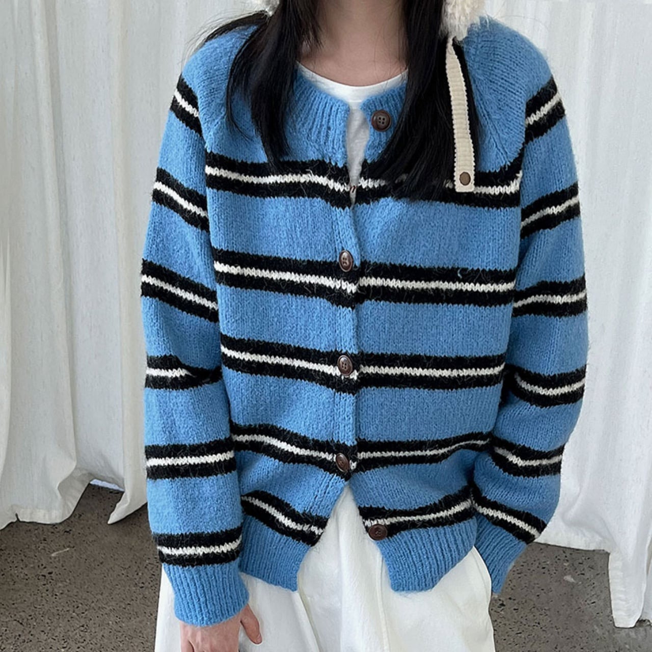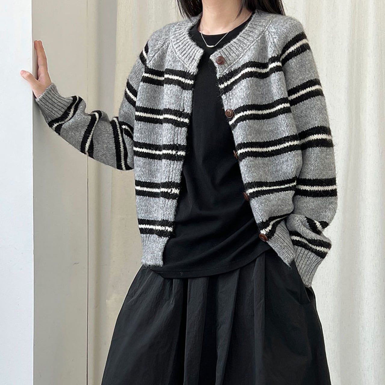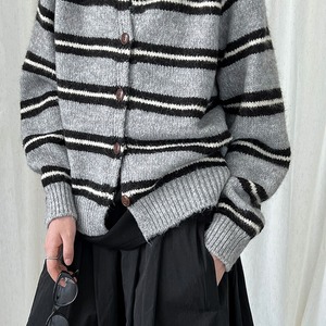 ボーダーラウンドネックニットカーディガン A01819