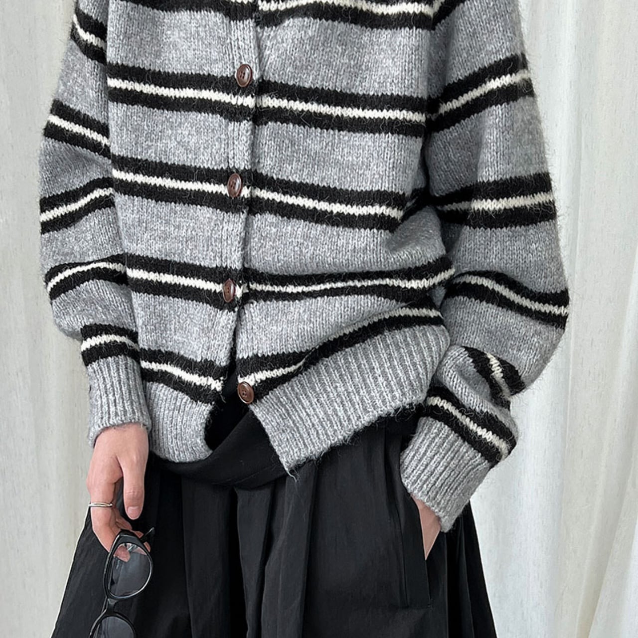 ワードローブに一枚あると着回し抜群のカーディガンです。