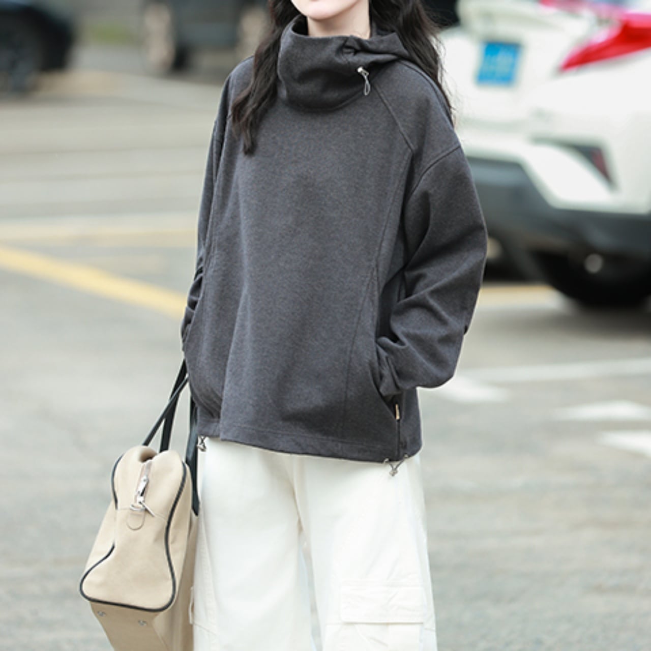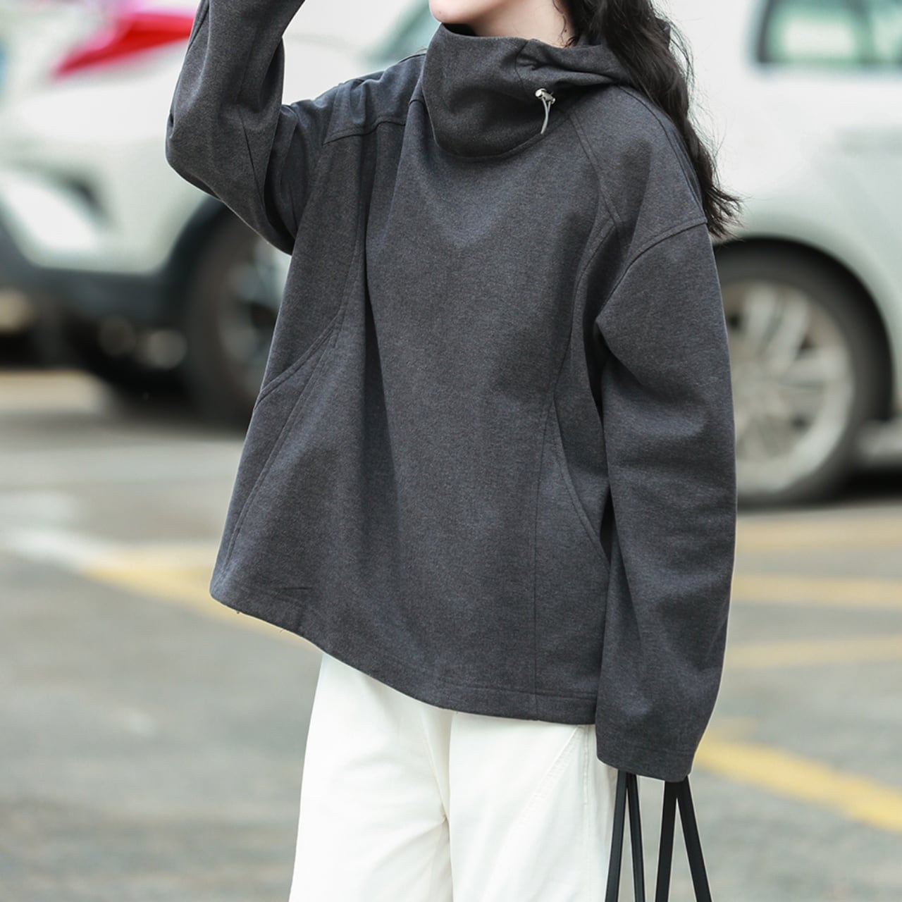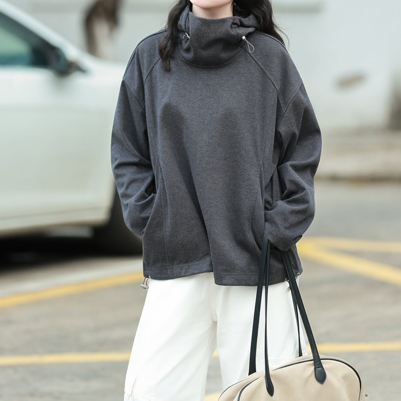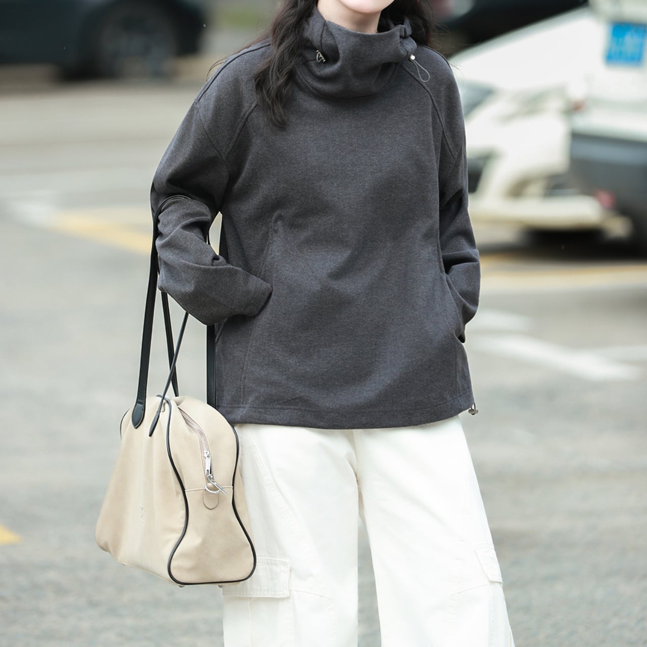 寒さから守ってくれるドロスト付きの立体的なハイネックと、肩のラインを拾わないゆったりとしたラグランスリーブが特徴。