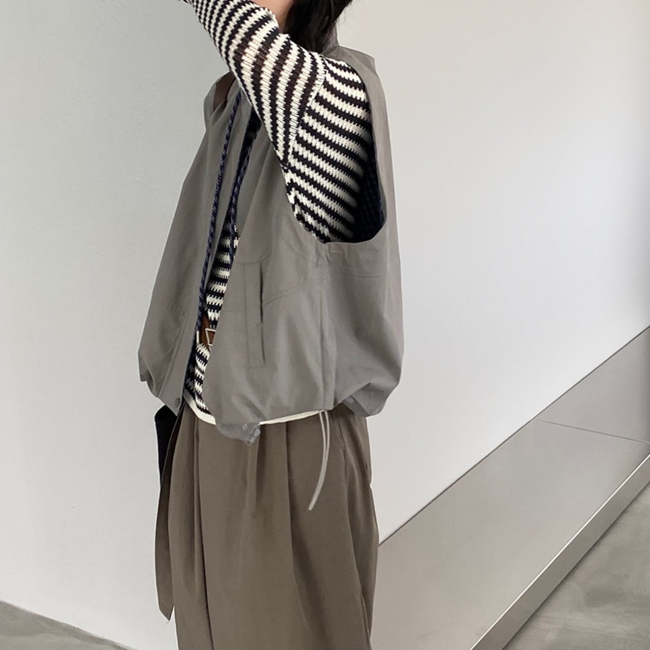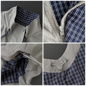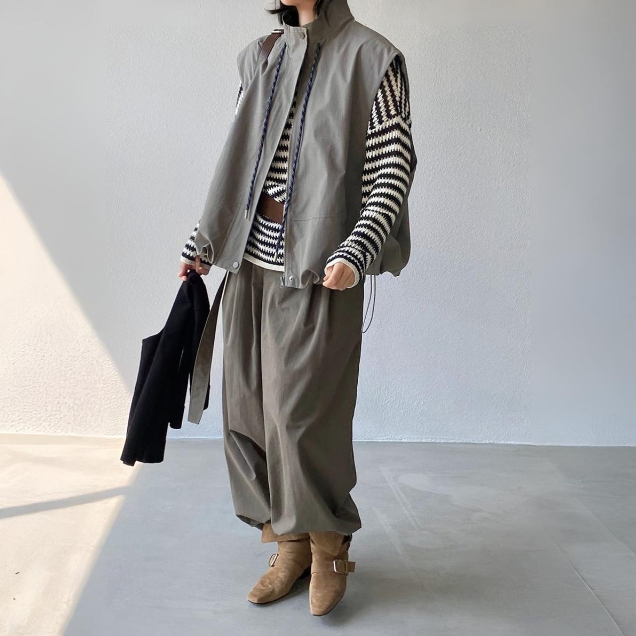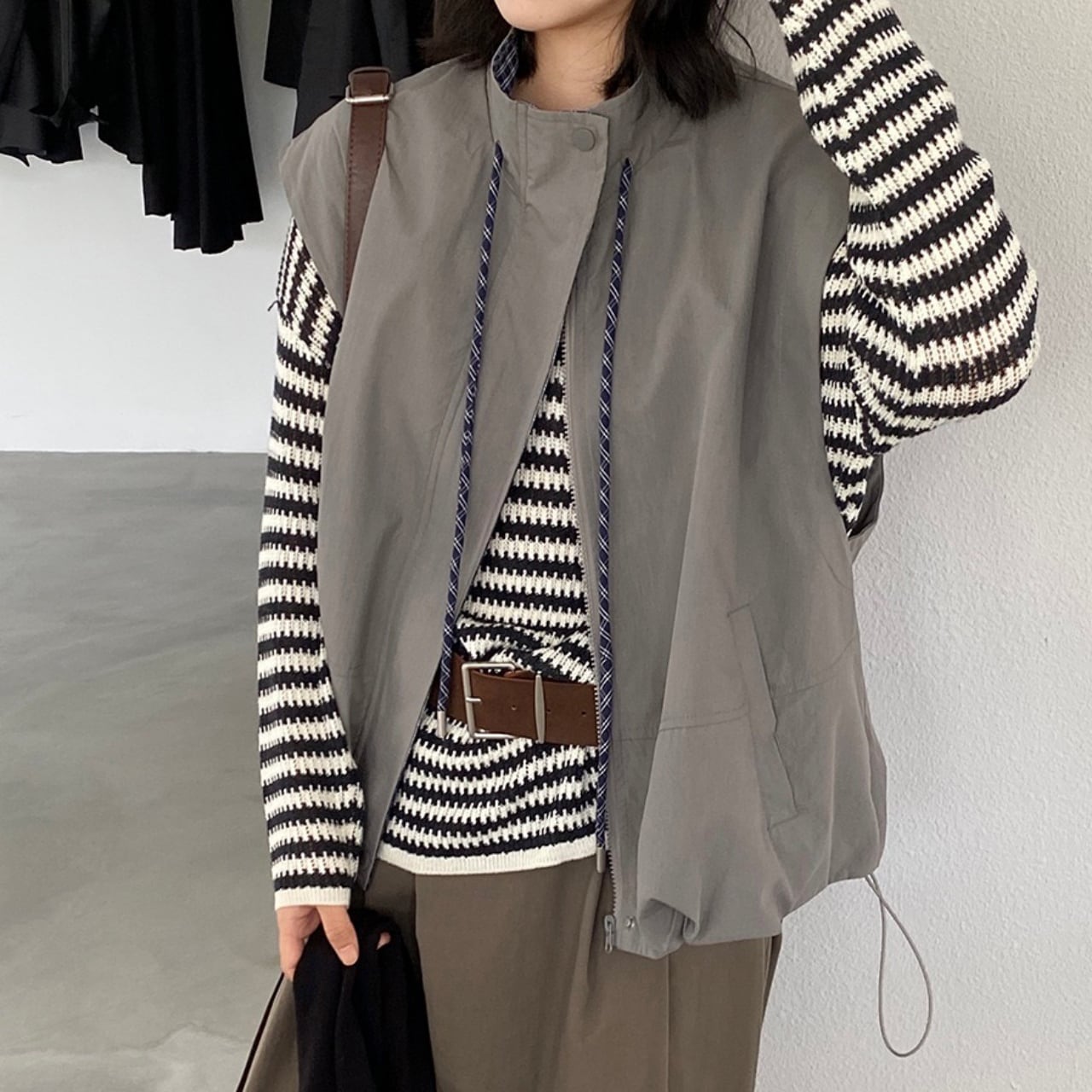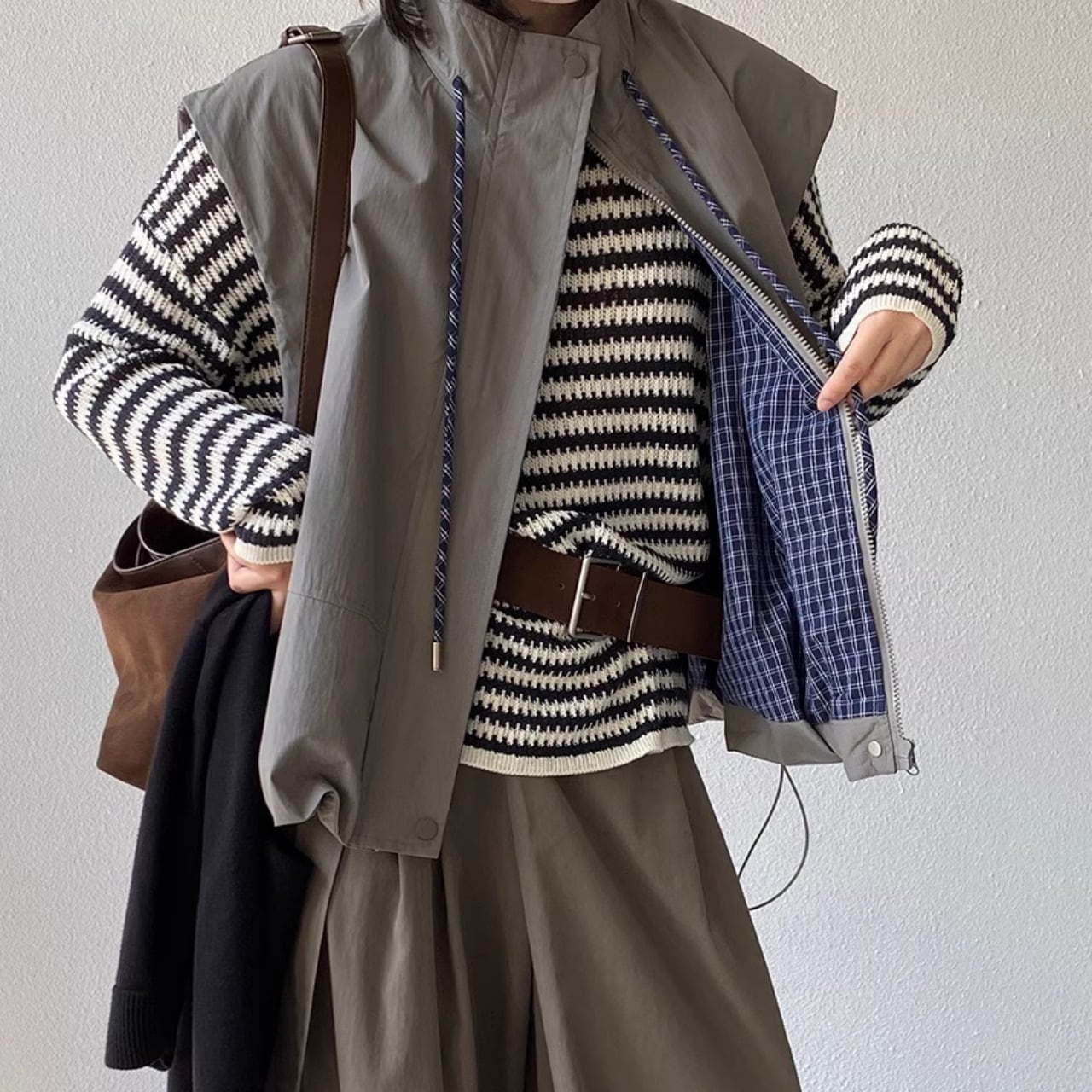 チラリと覗くネイビーチェックの裏地がポイントのスタンドカラーベスト。