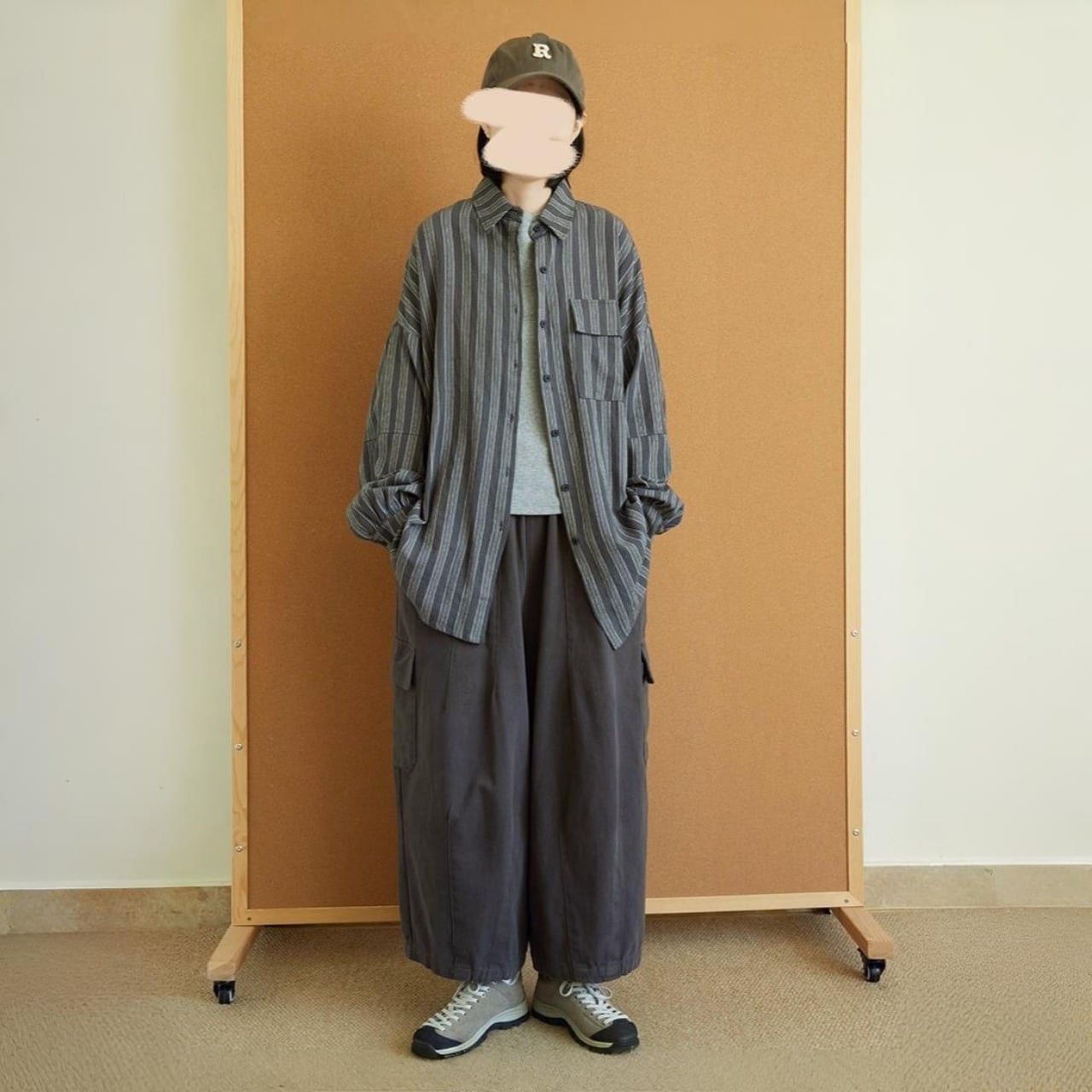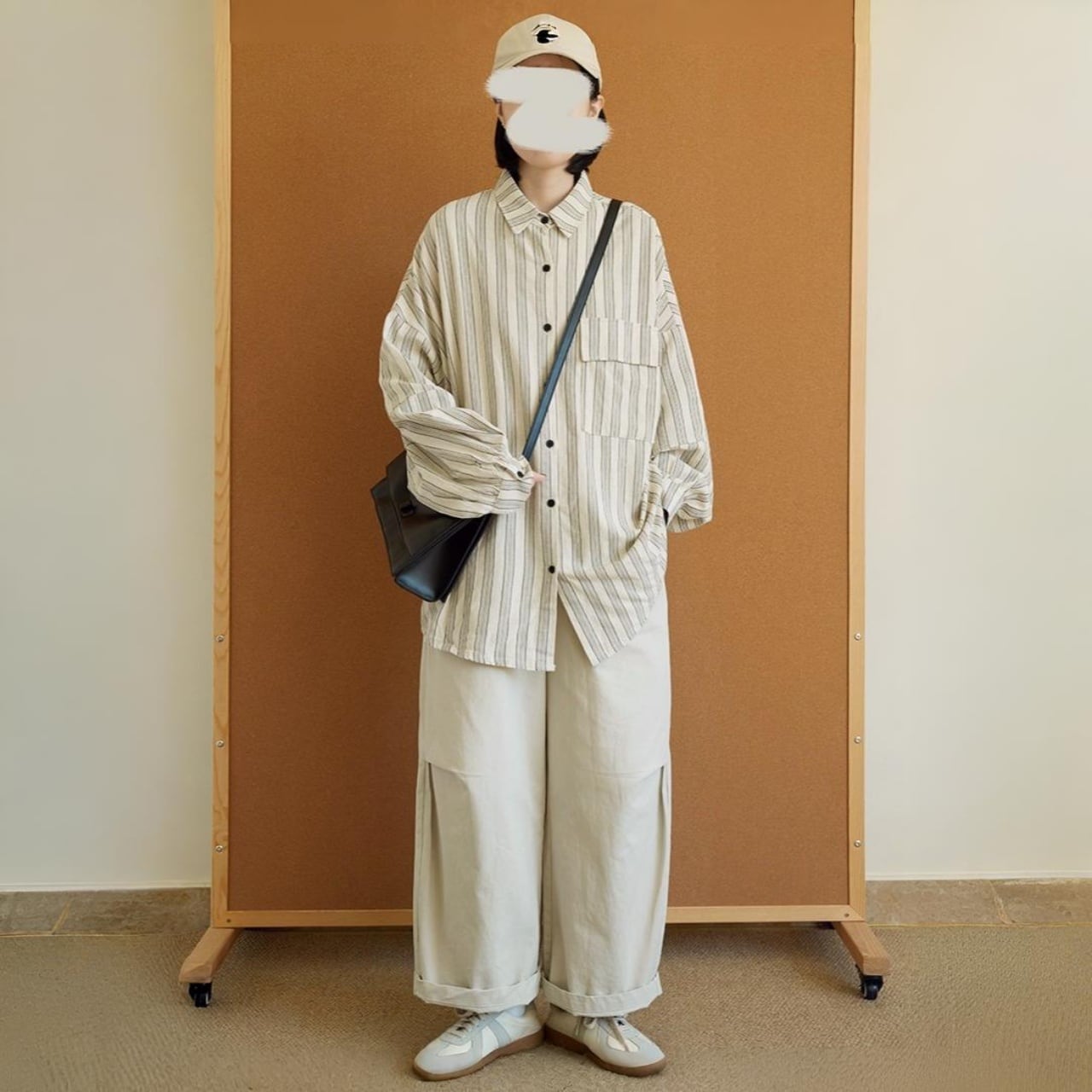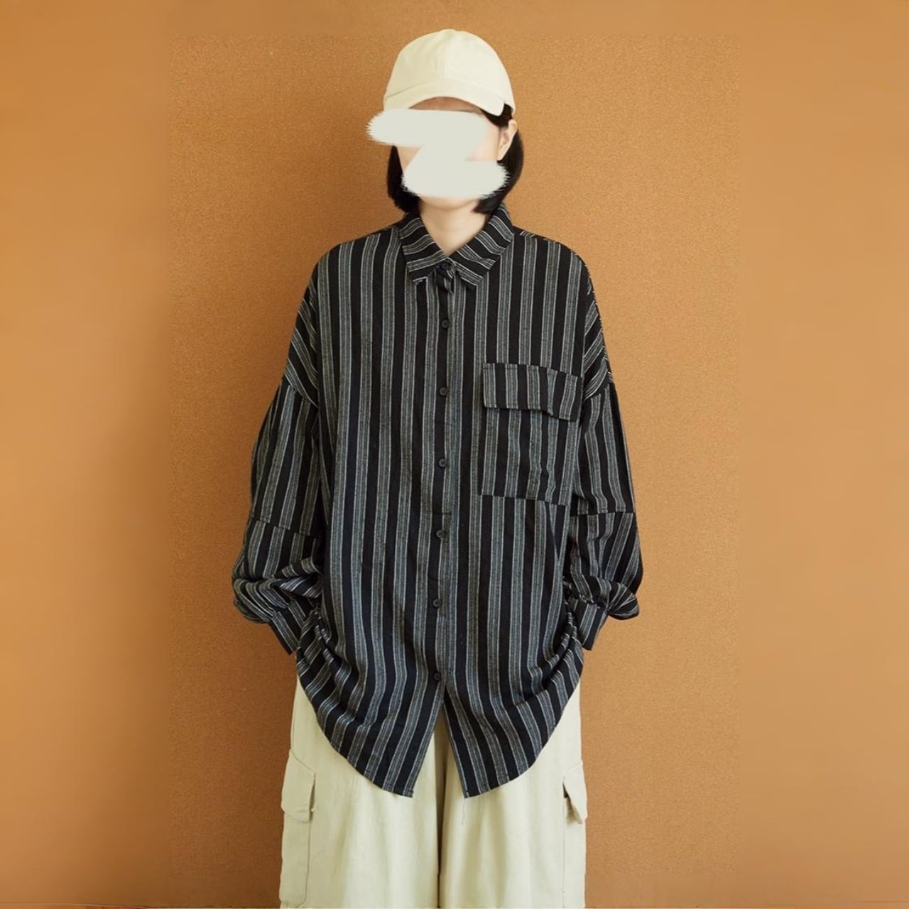 ストライプ柄が縦ラインを強調し、すっきり見えを叶えるビッグシャツ。