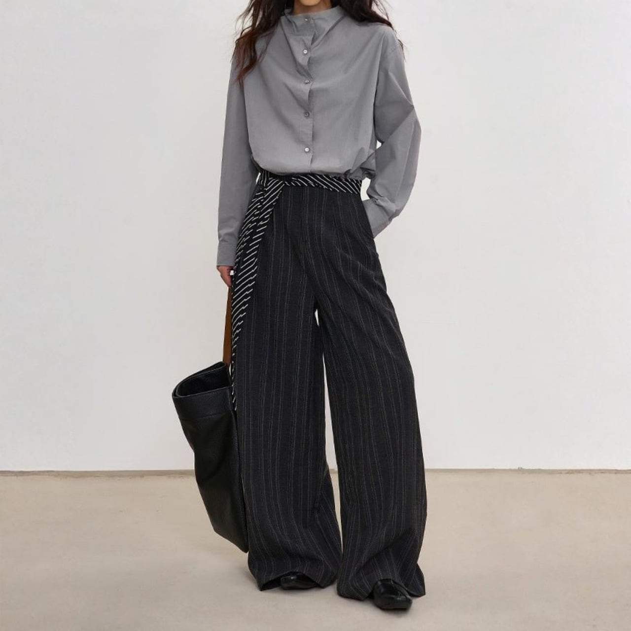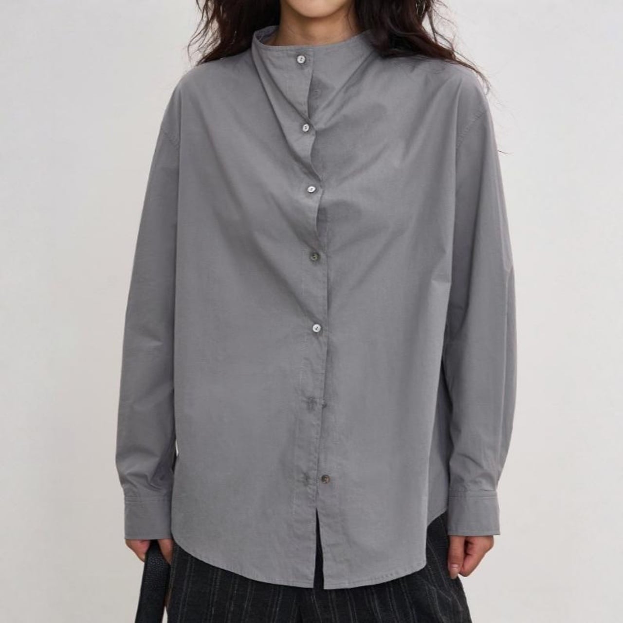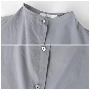 スタンドカラーで首元をすっきり見せ、上品な印象に。