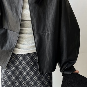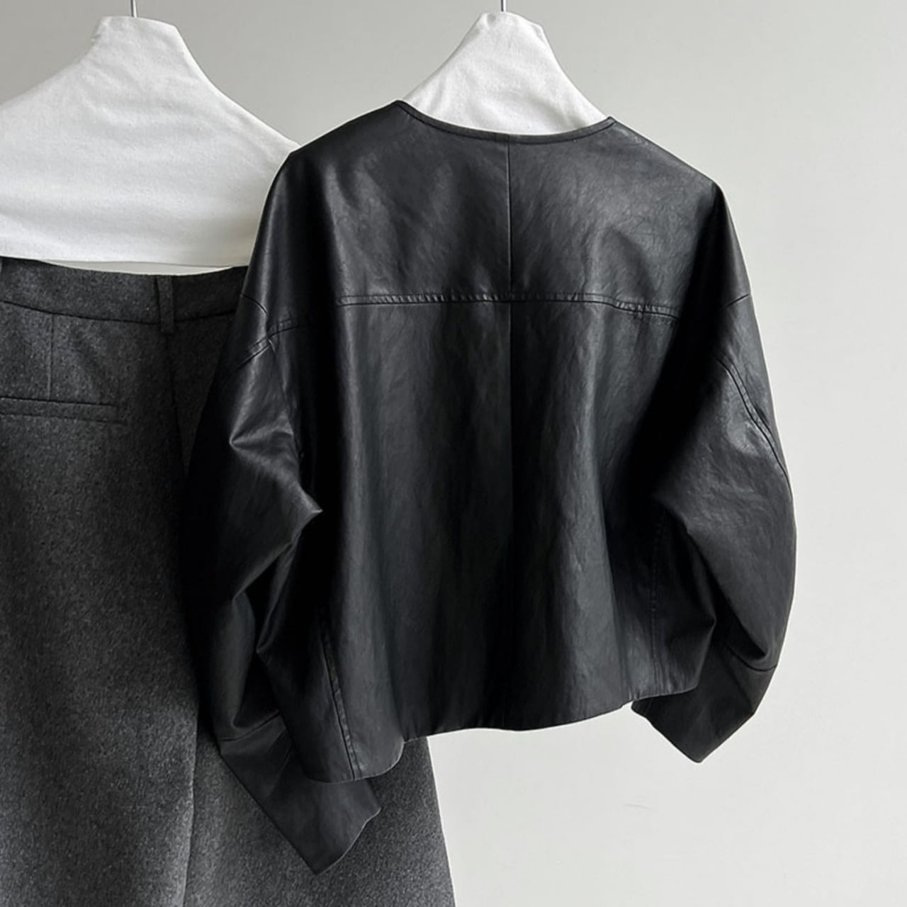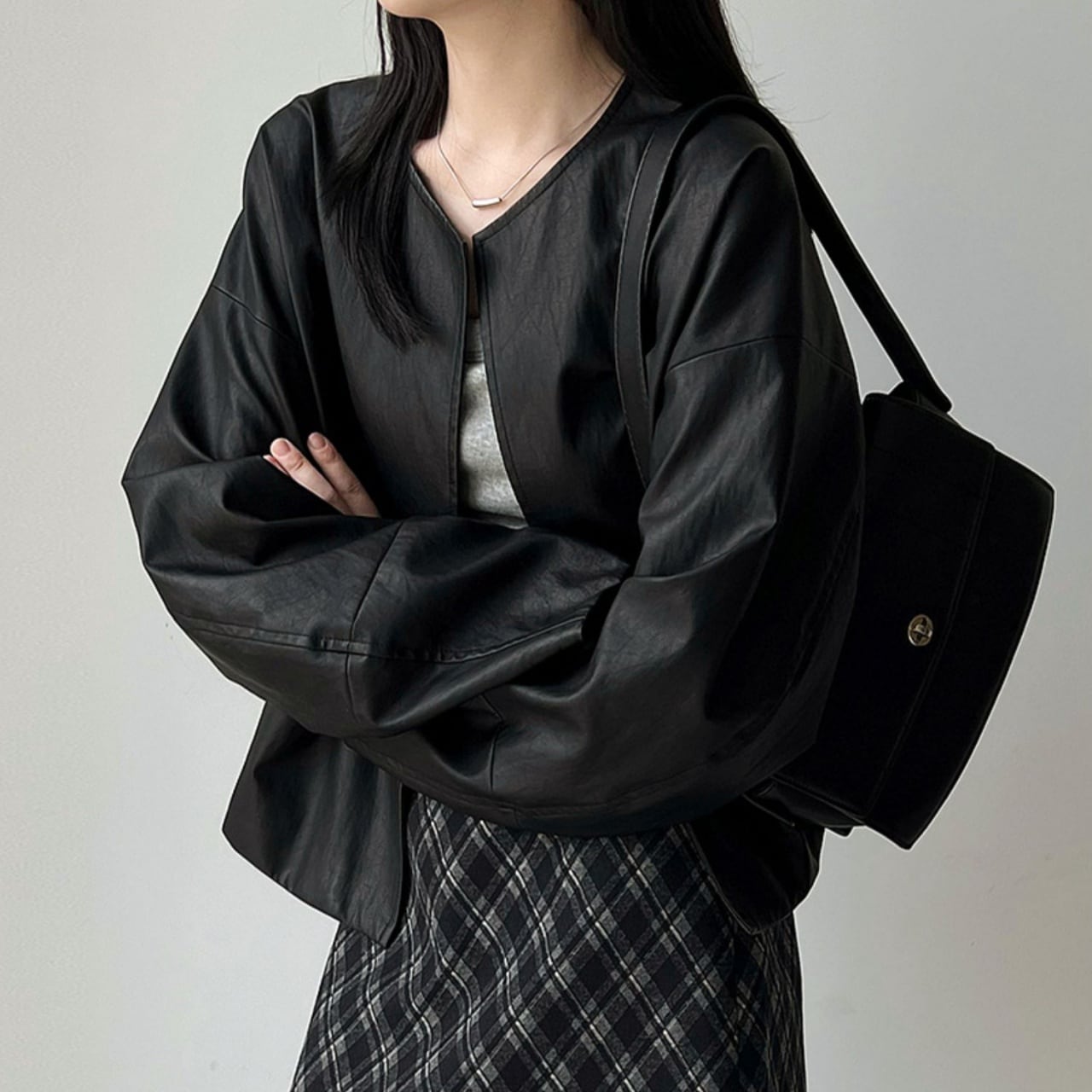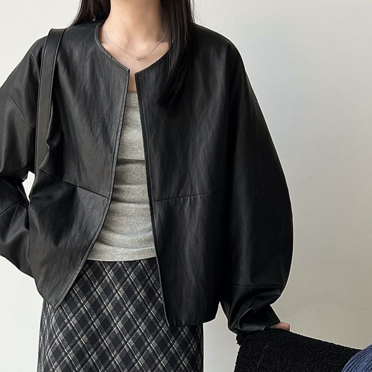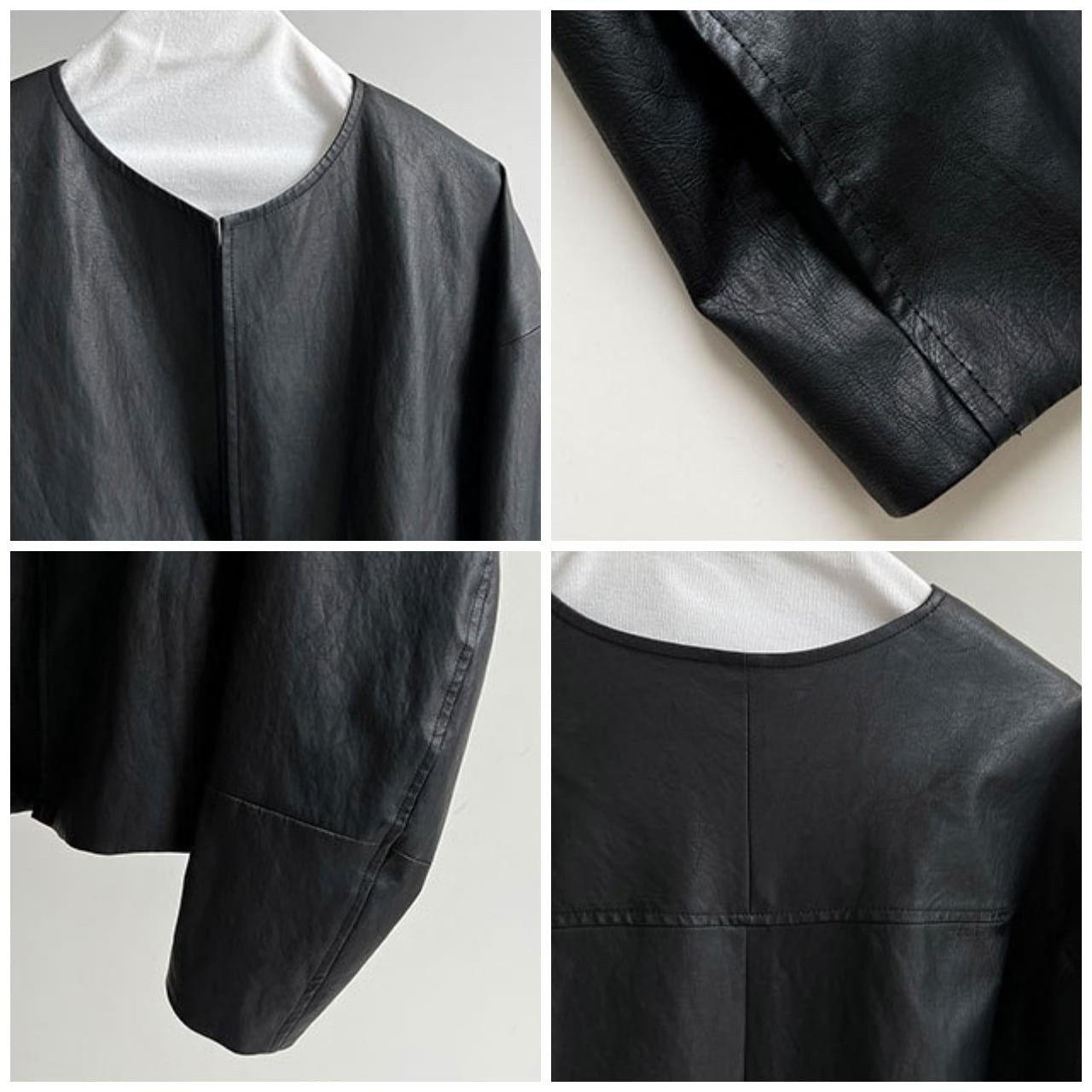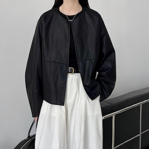 ノーカラードロップショルダーレザーライクジャケット A01857