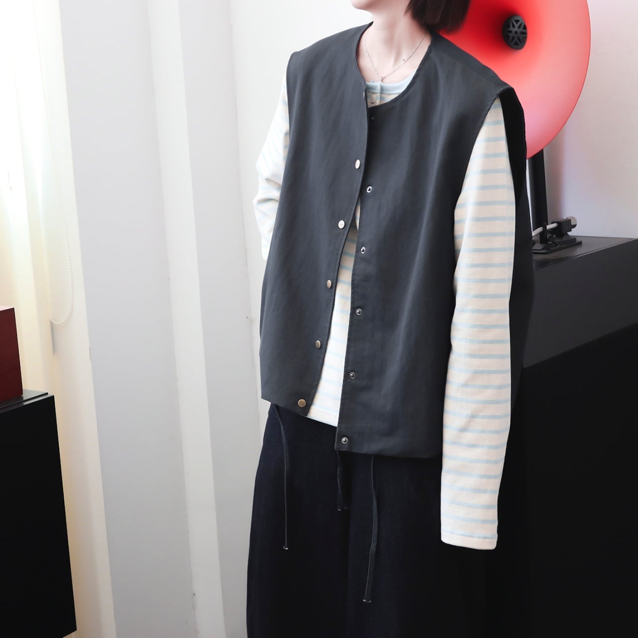 ラフに羽織れて今っぽくキマるノーカラーベスト。