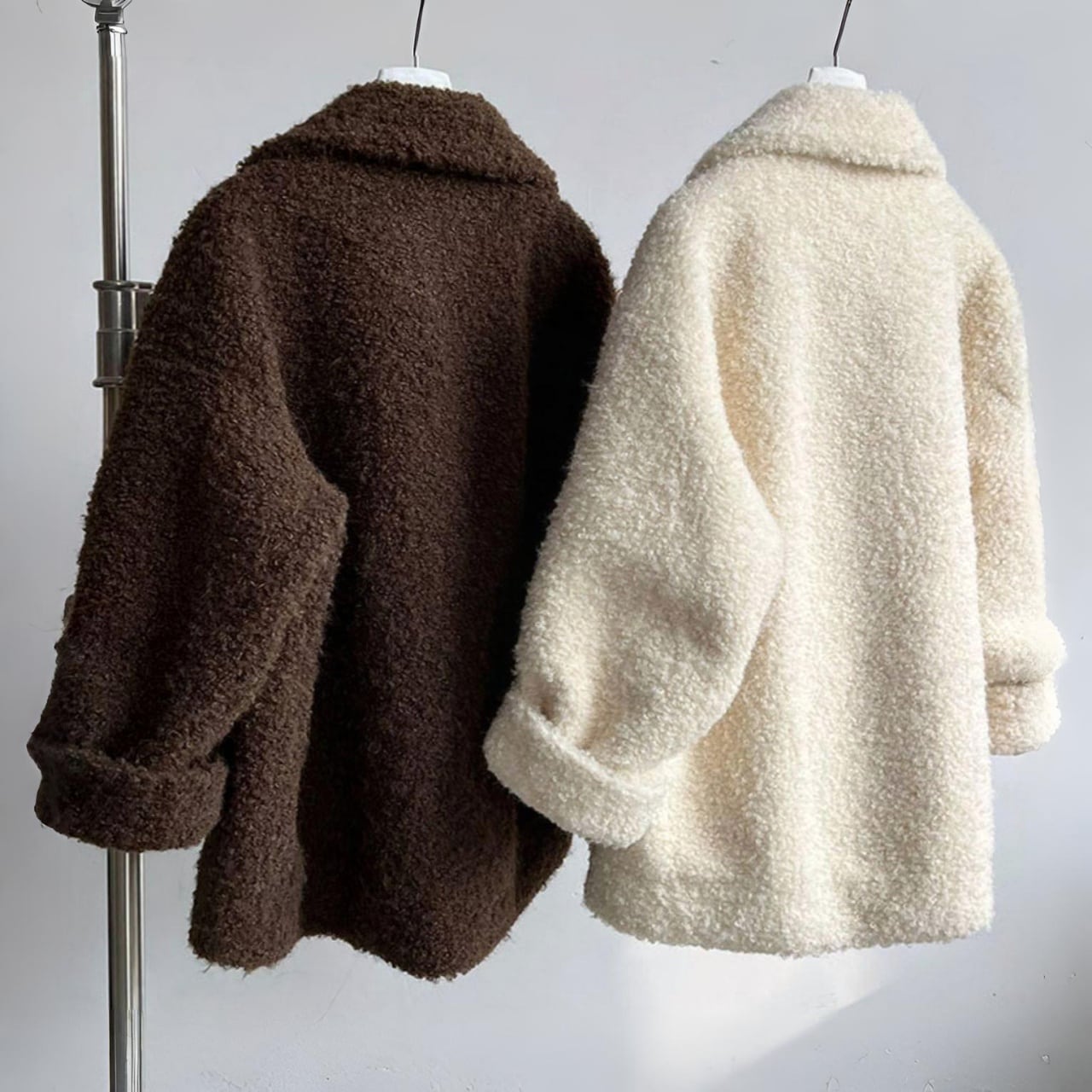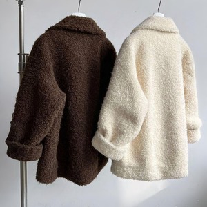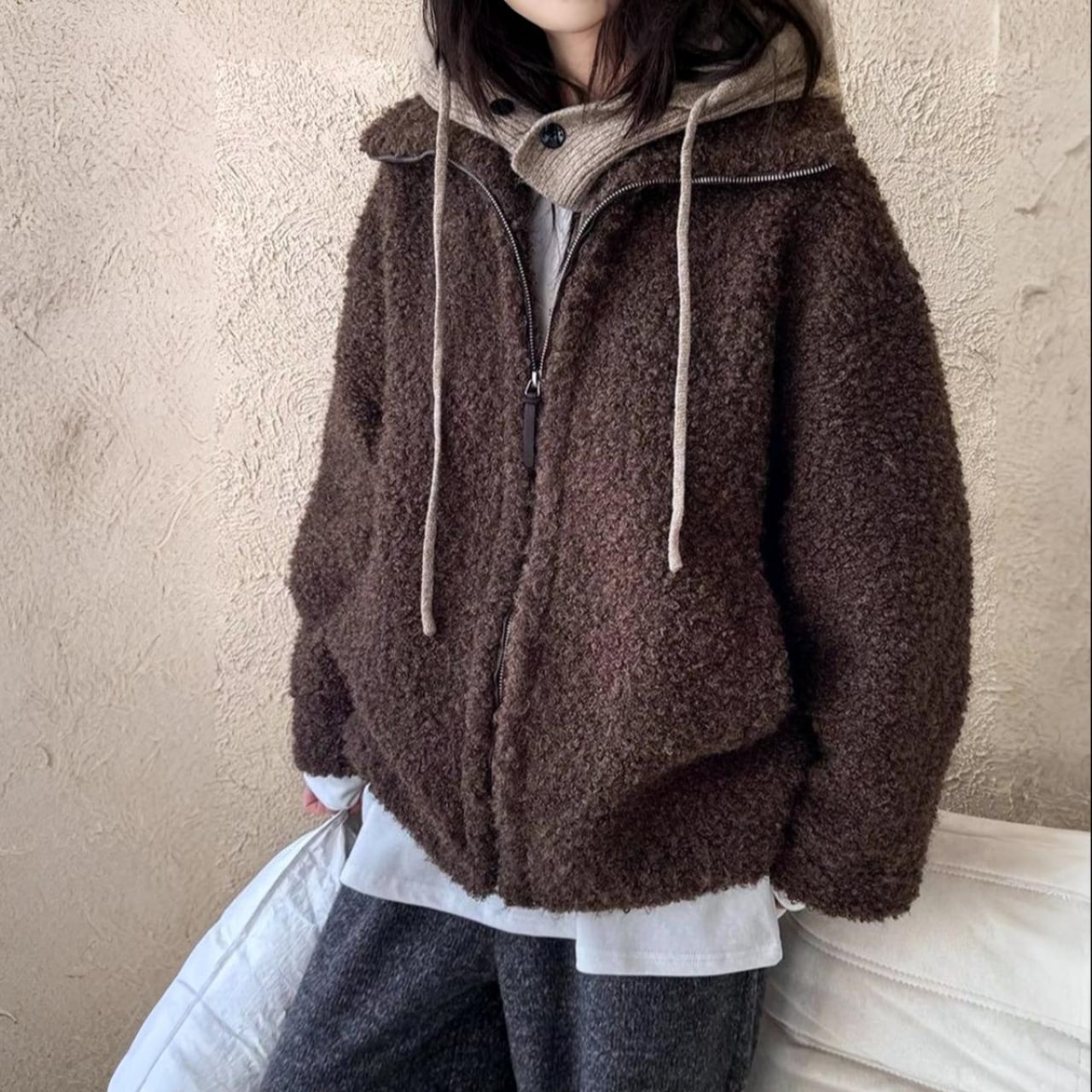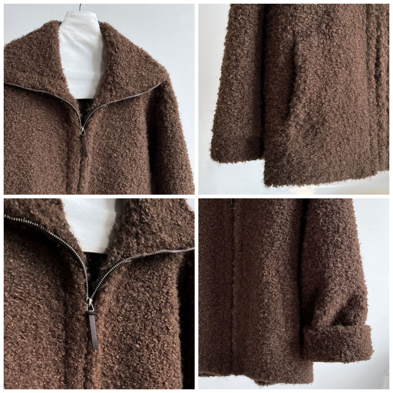 くるくるとしたブークレで、見た目も着心地もふんわり暖か。