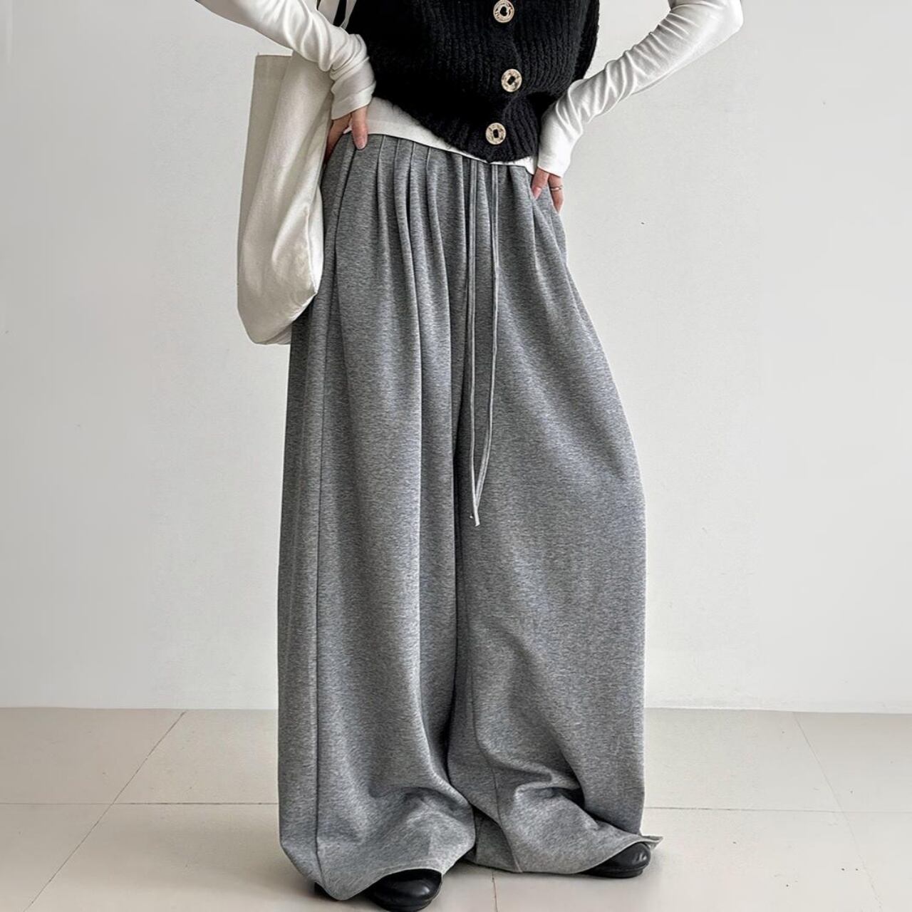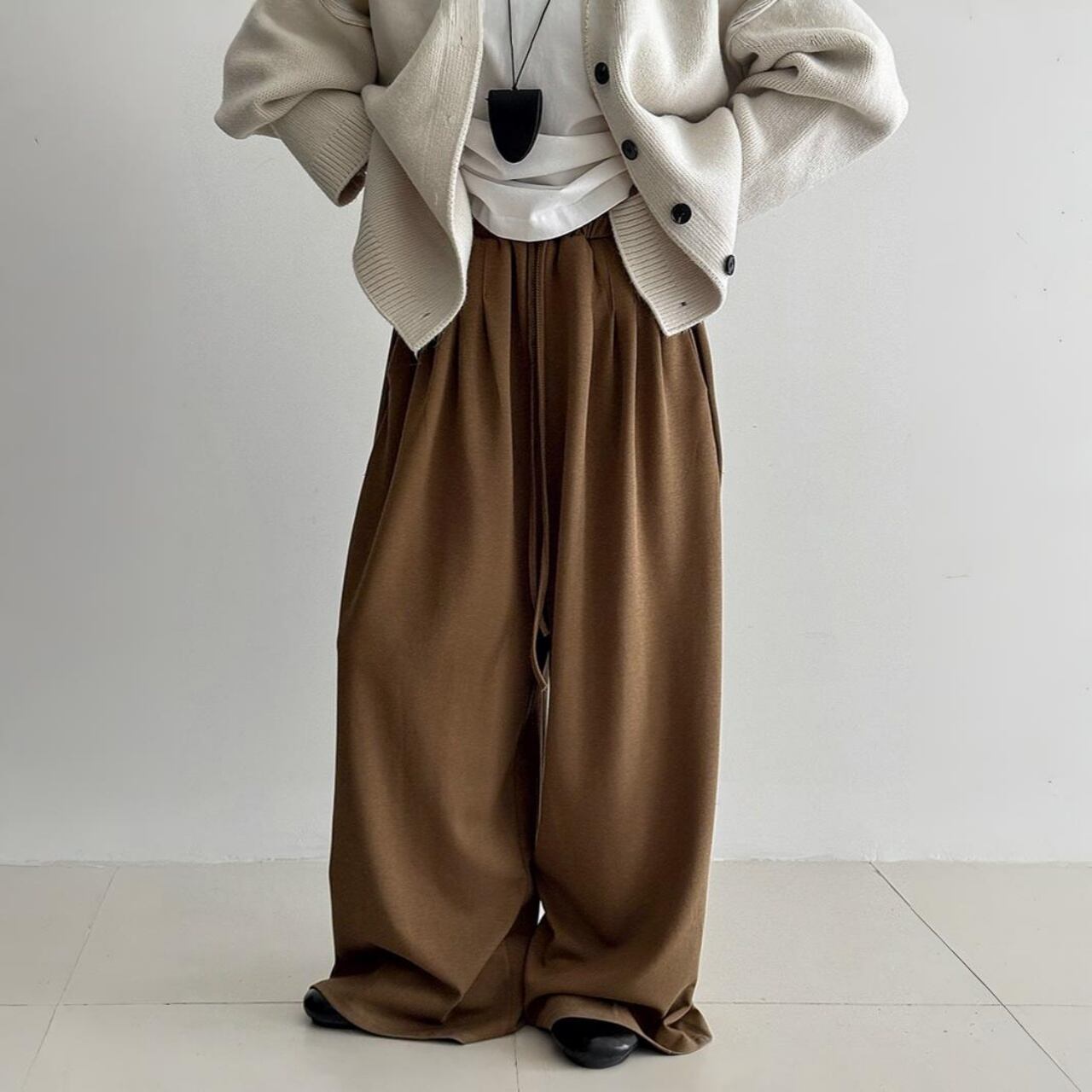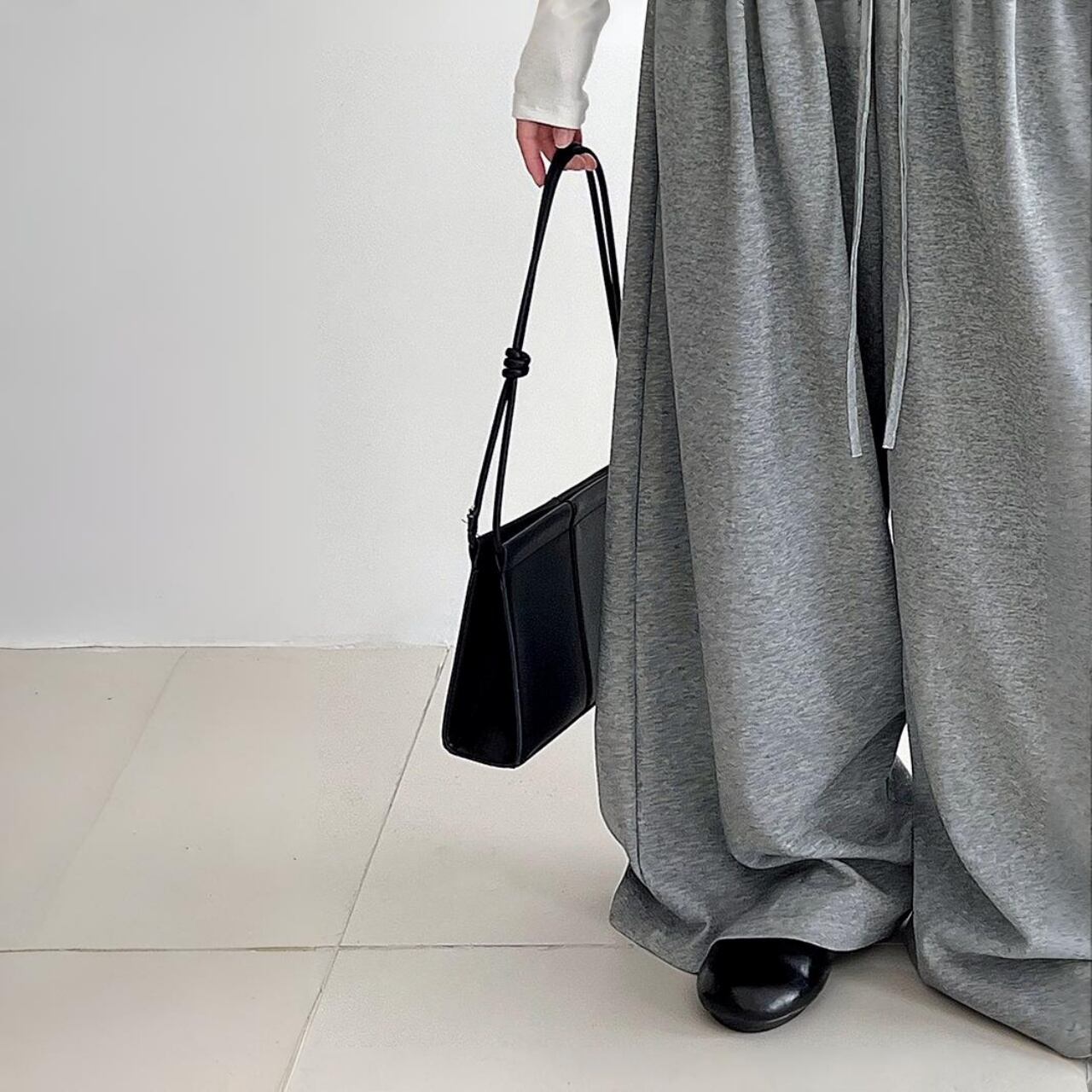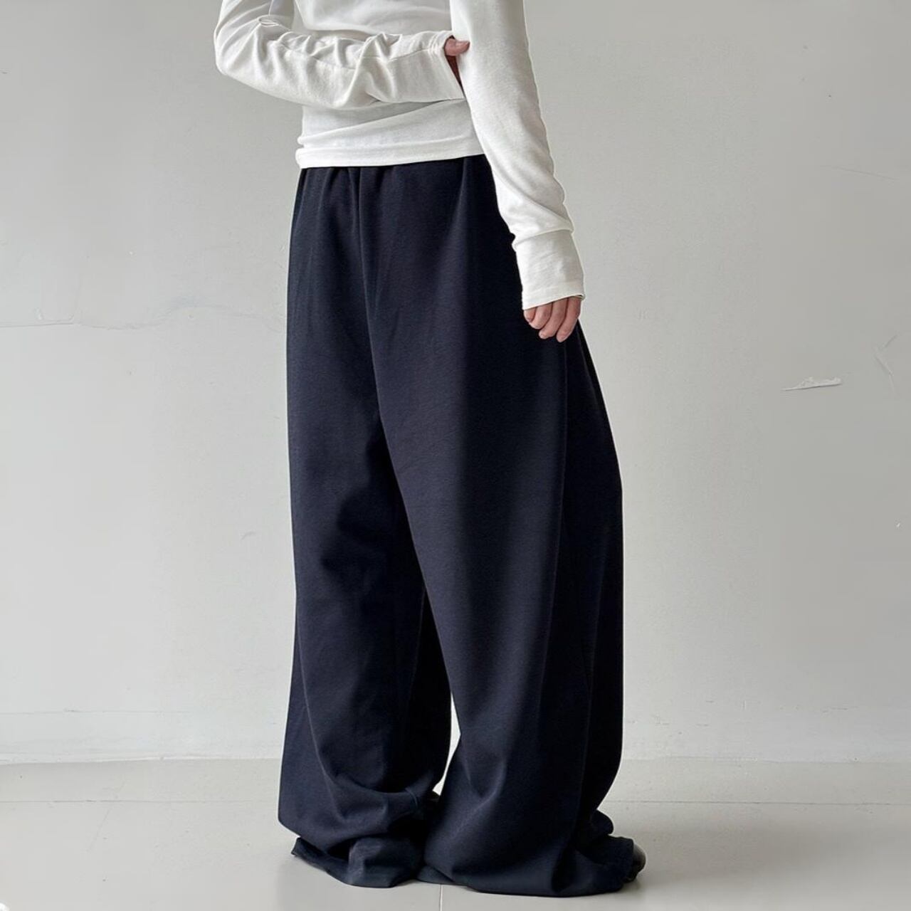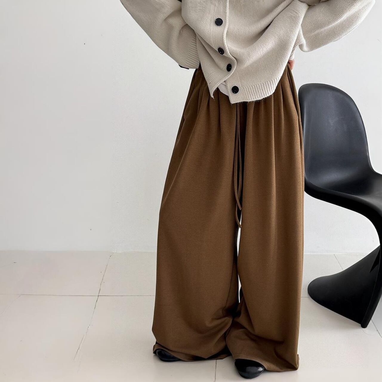 体型を拾わず、そのまま旬のシルエットを叶えるモップパンツスタイル。