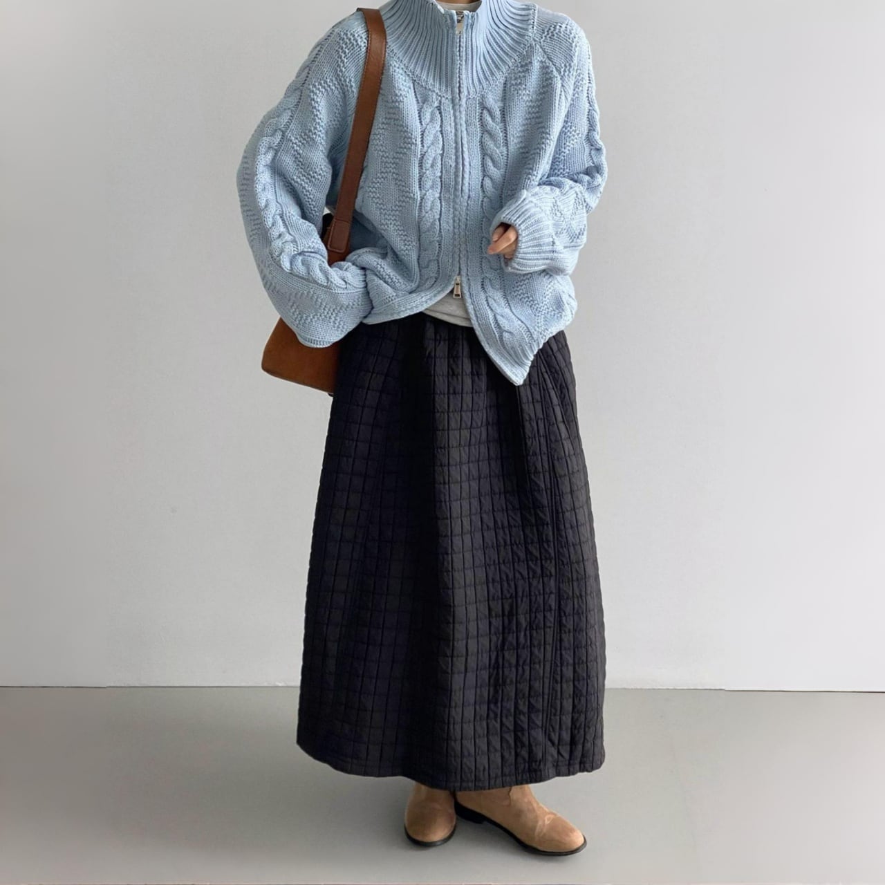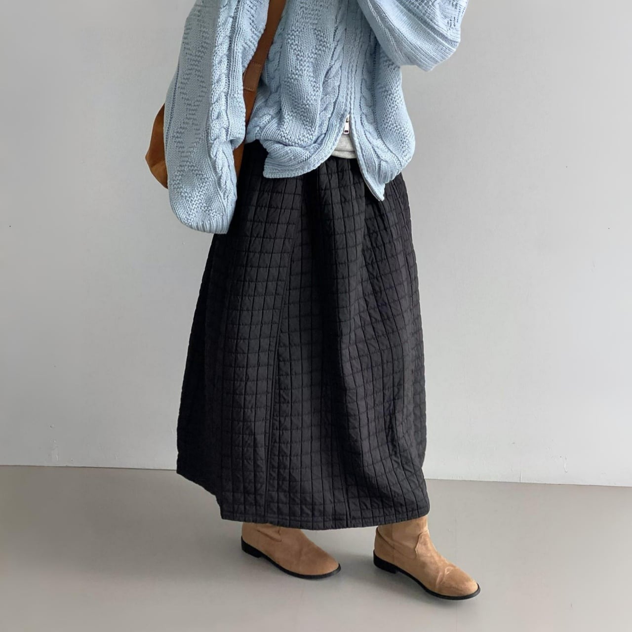チェック柄のキルティングが、季節感と暖かさを感じさせるマキシスカート。