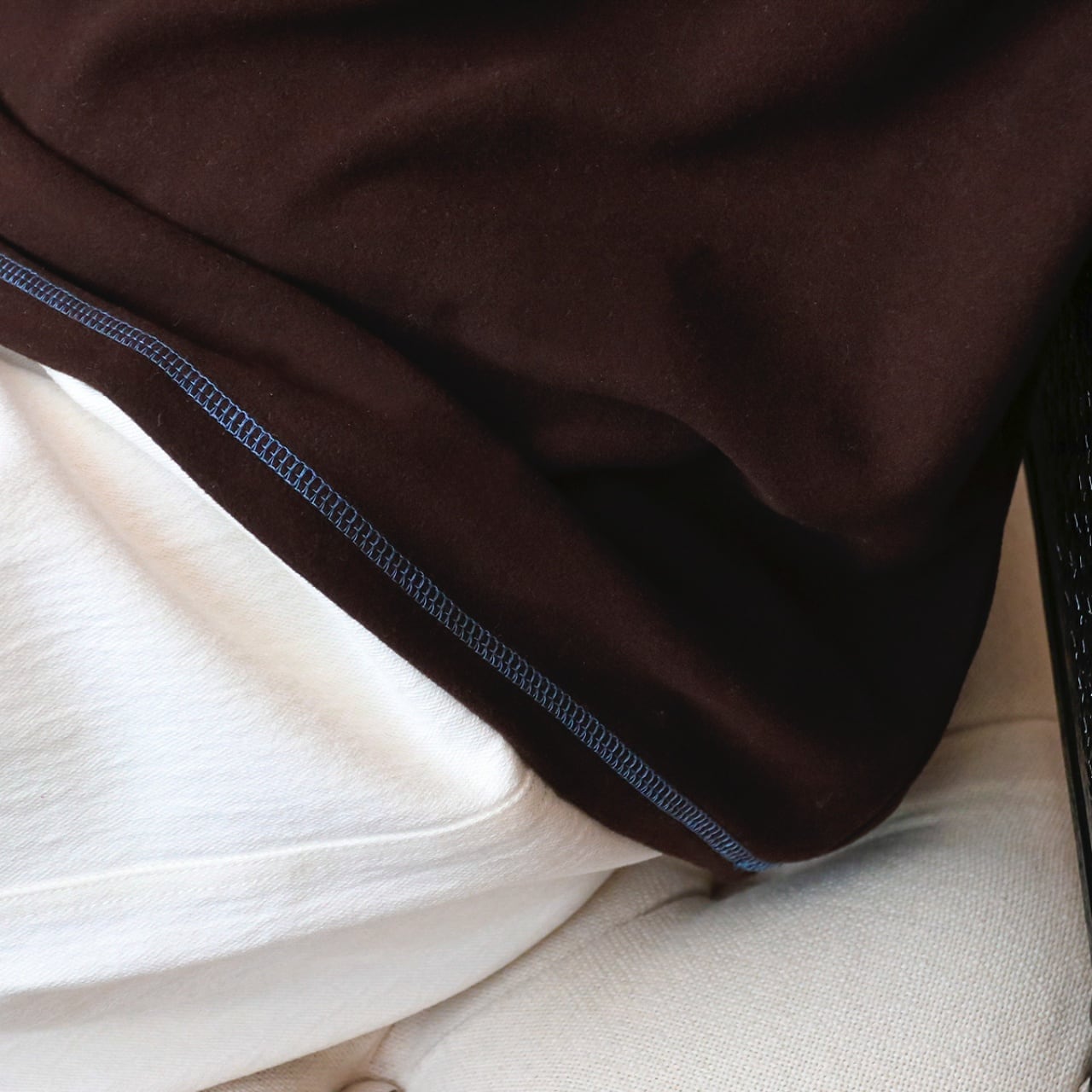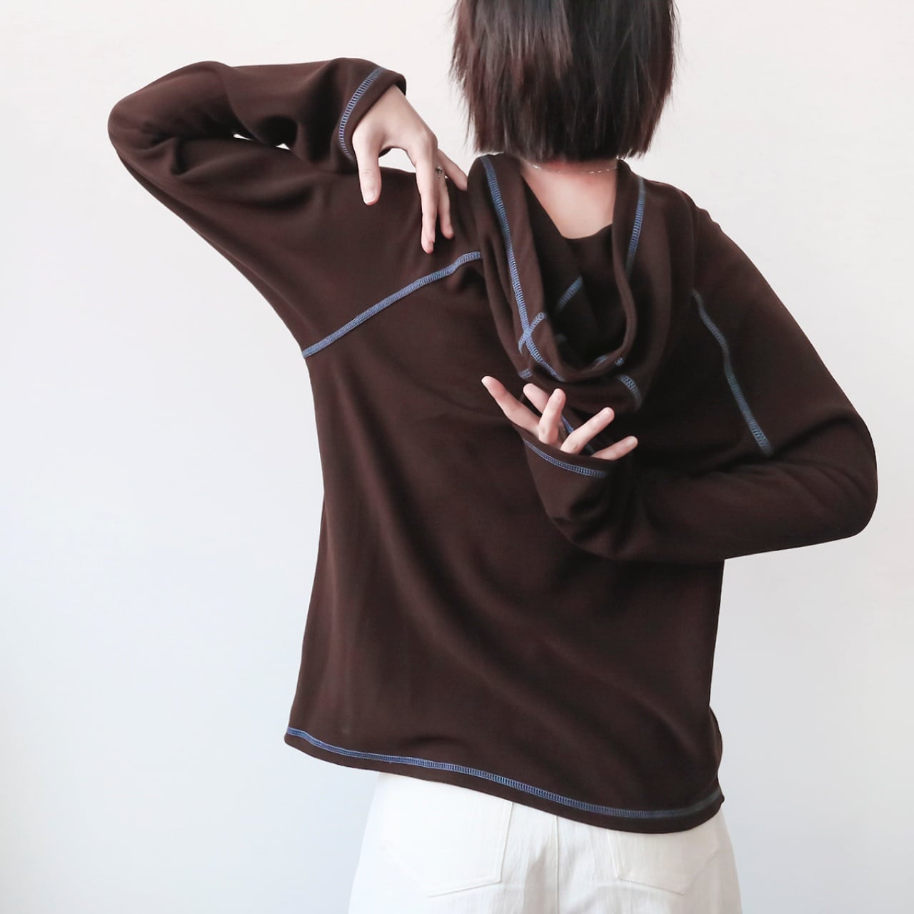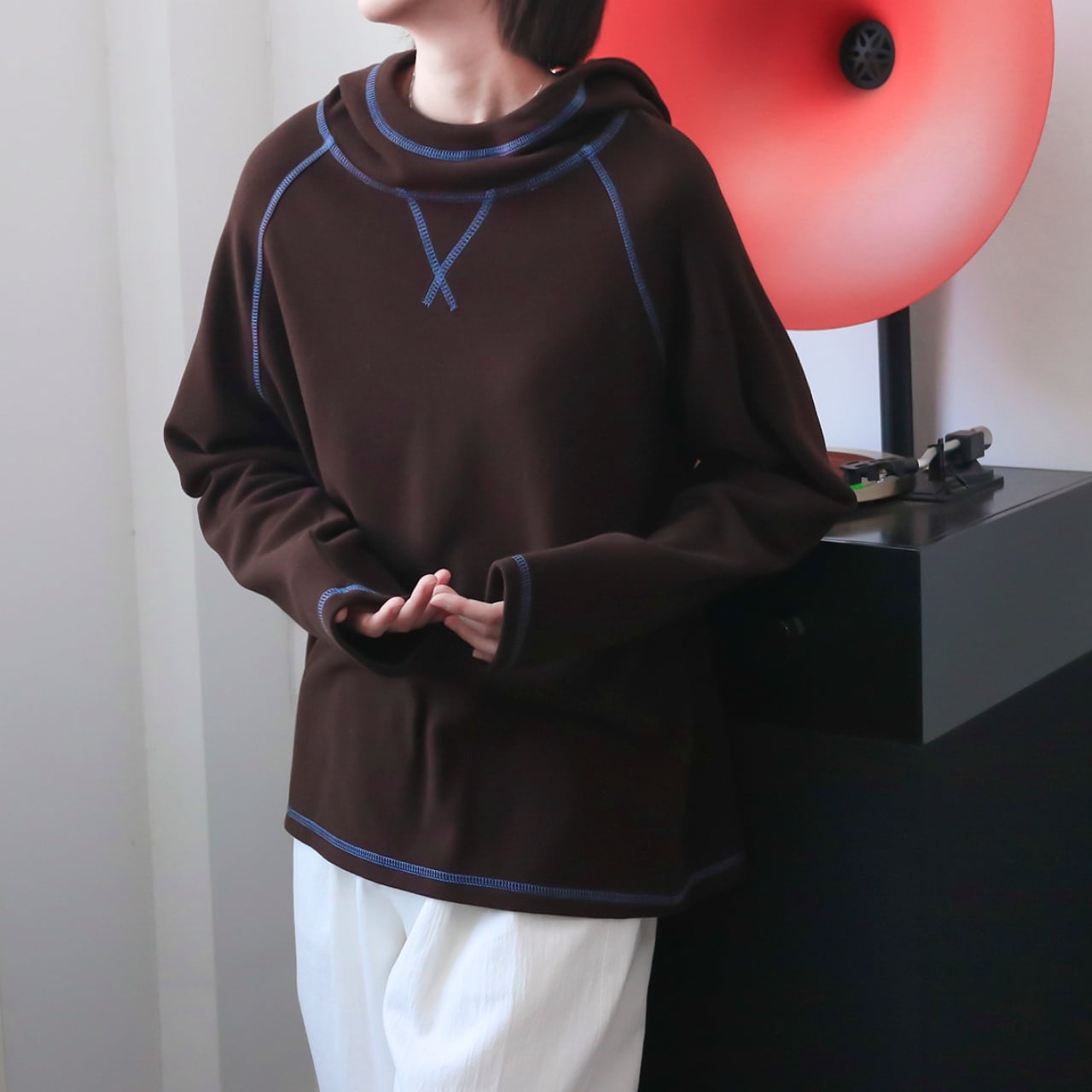 ビターなブラウンにブルーのアクセントが映える、ステッチフーディ。