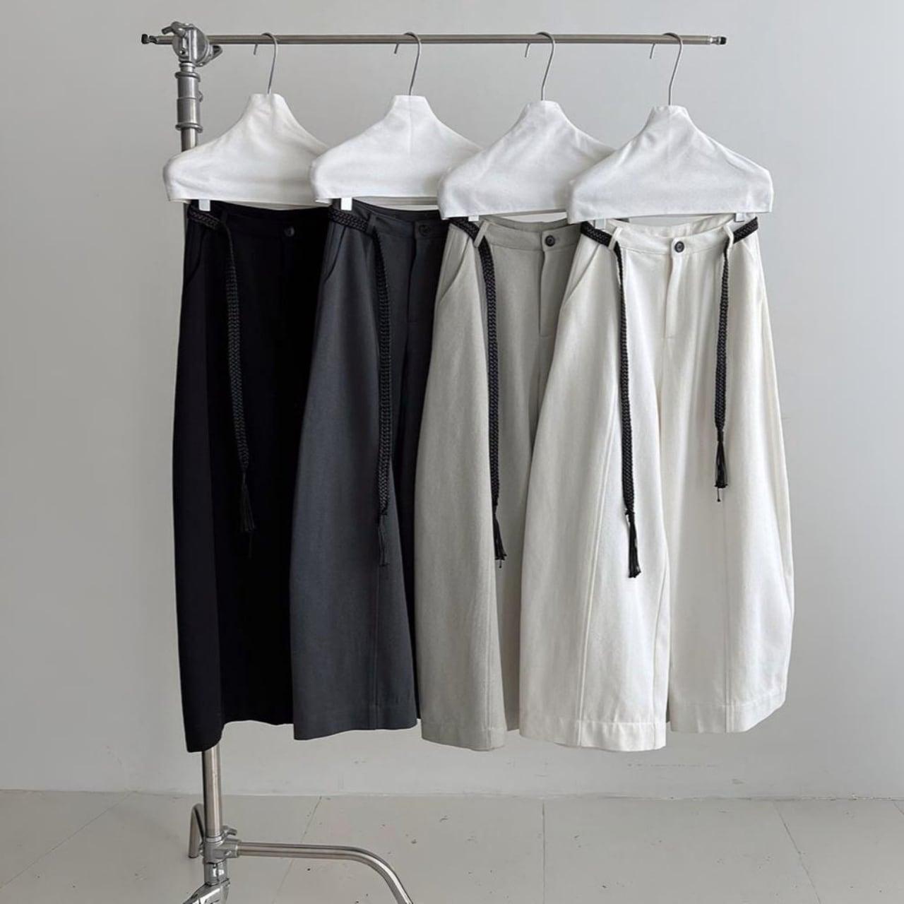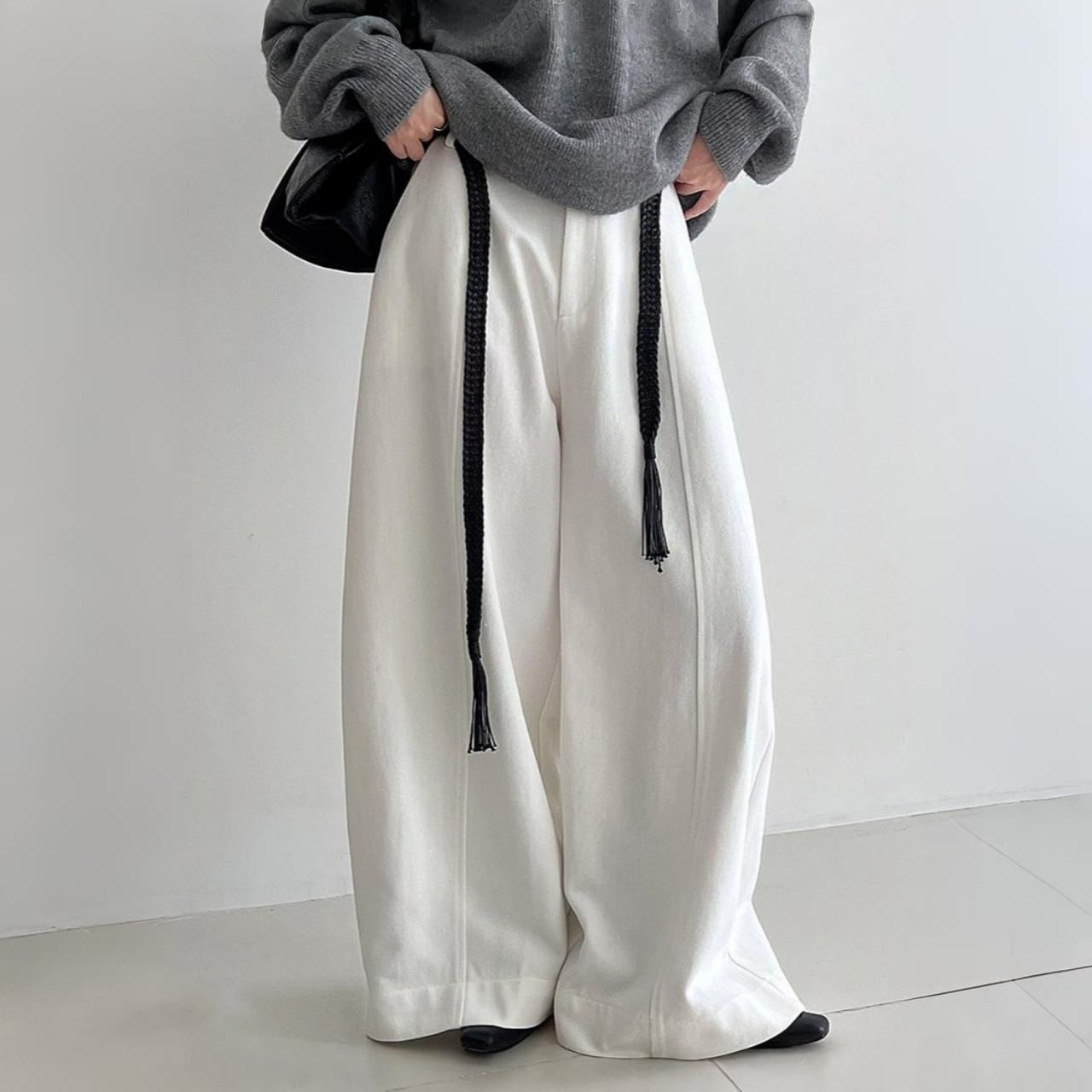 ブレードデザインのベルトがアクセントになった、ハイセンスなワイドパンツ。