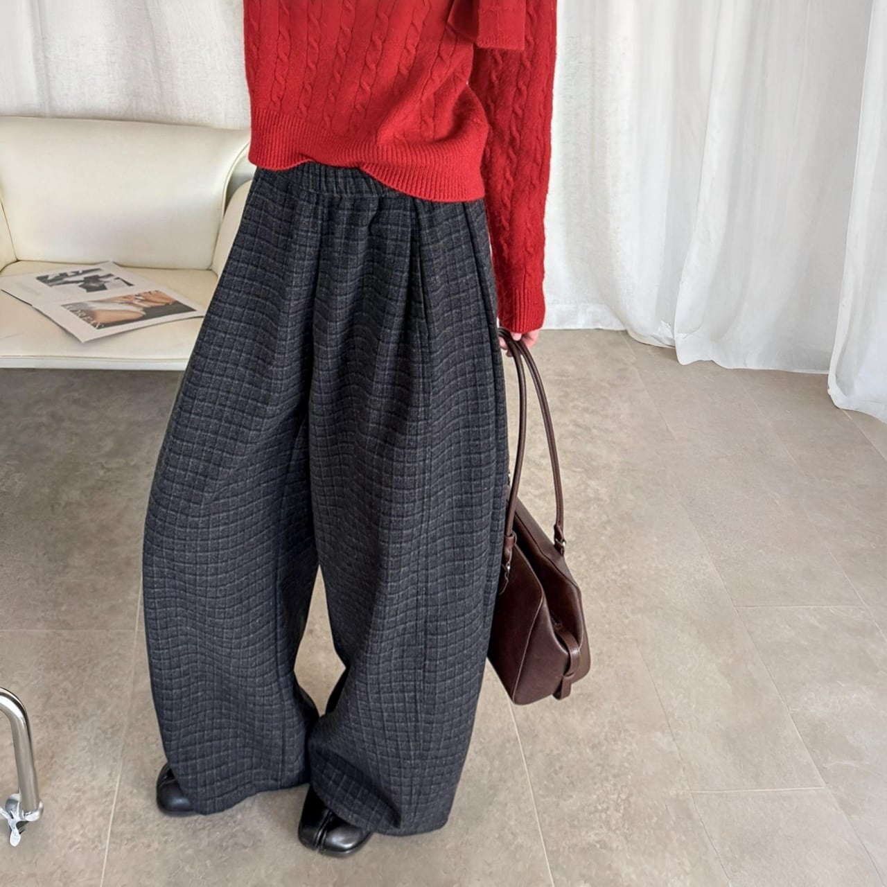 落ち着いた色合いのチェック柄が魅力的なカーブパンツ。