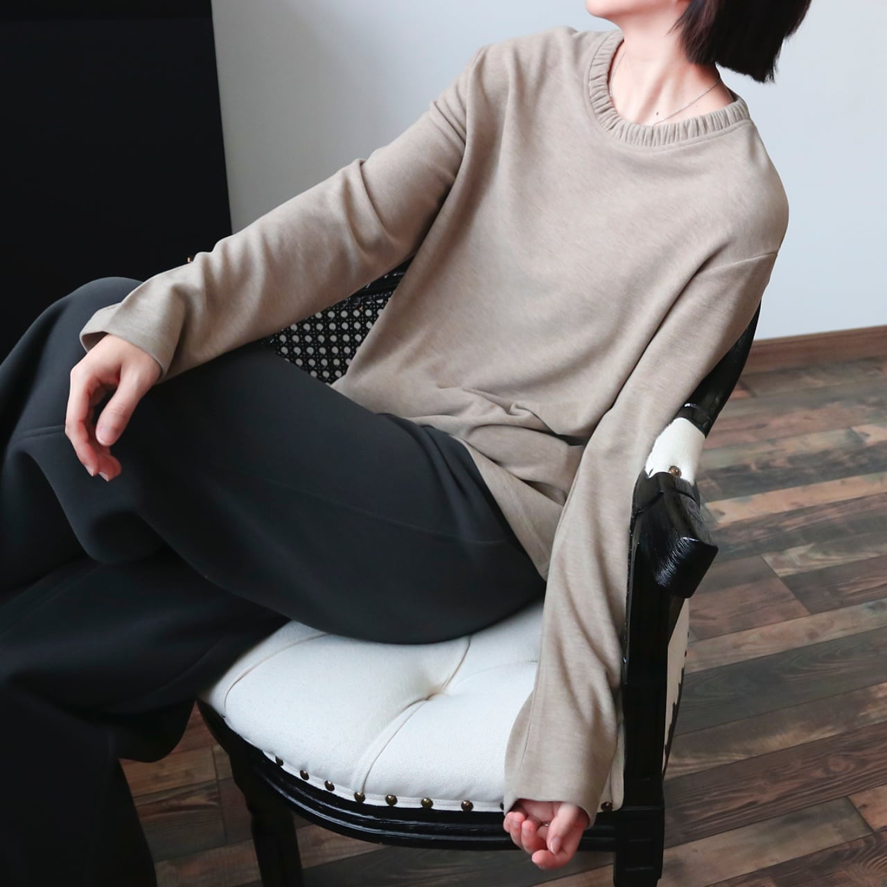 首元に施した繊細なギャザーが、カジュアルな中に女性らしい柔らかさを添えます。