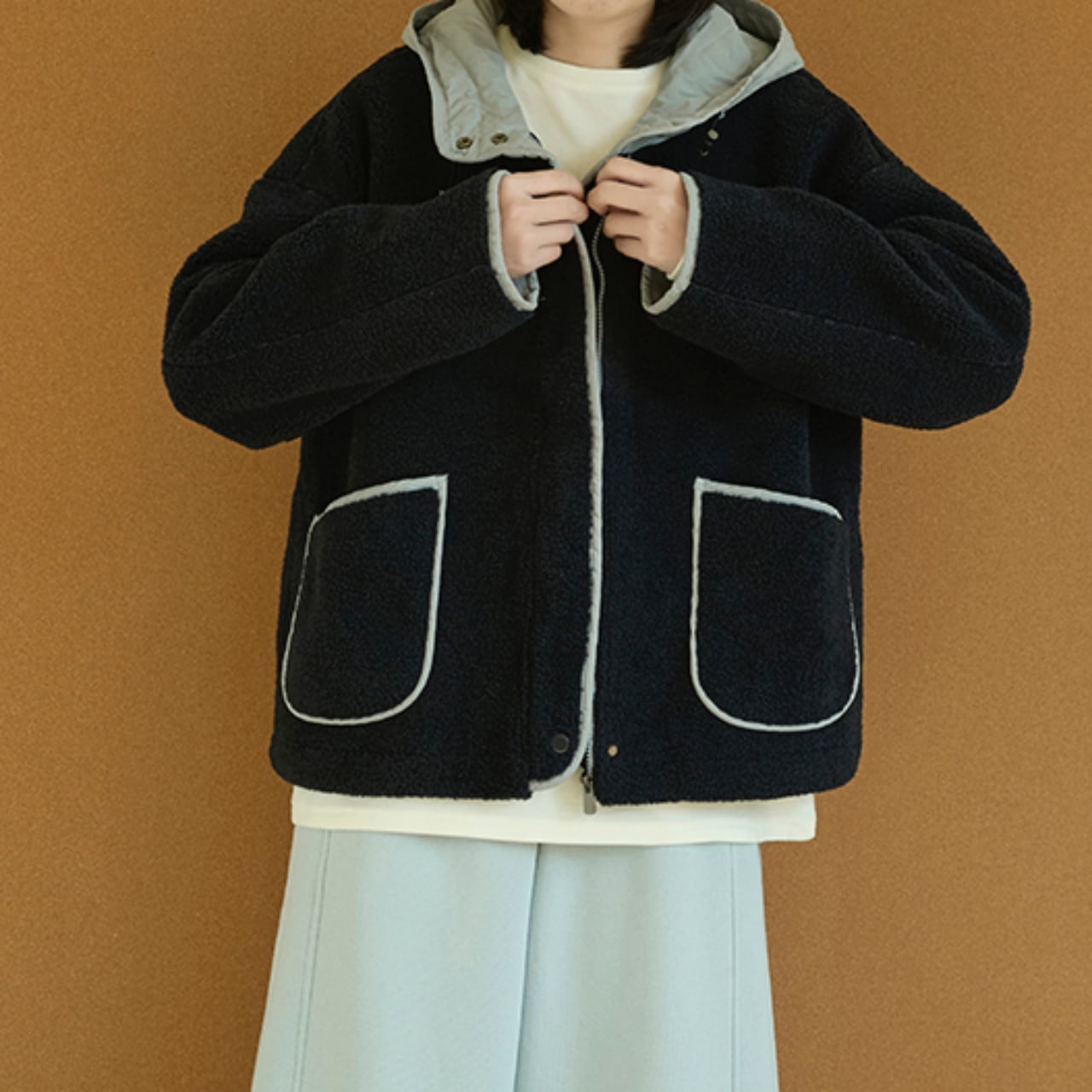 フード付きで首元までしっかり包み込むボアジャケット。
