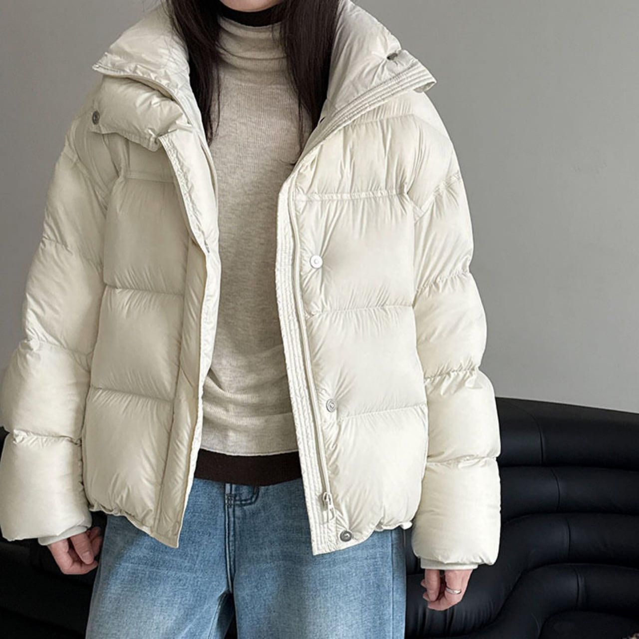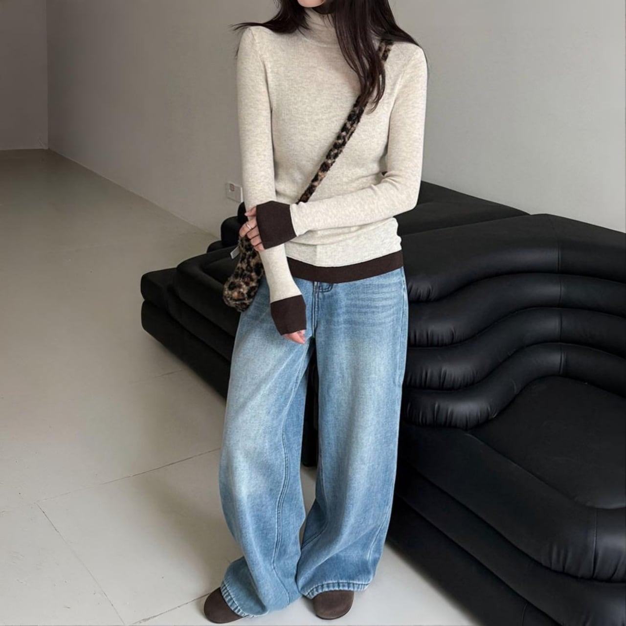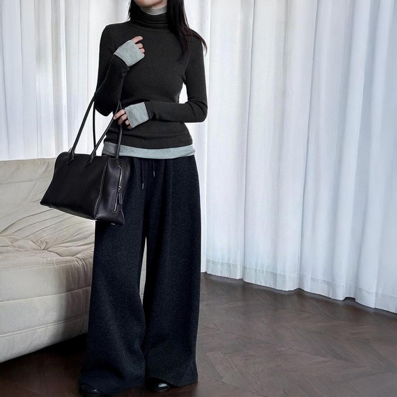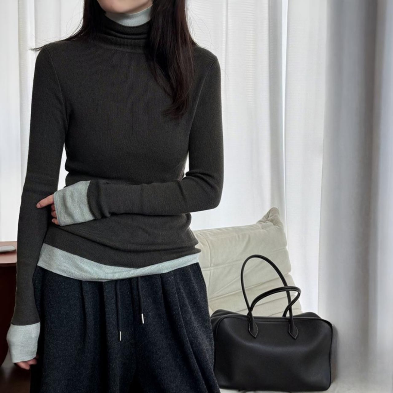 袖口や裾からチラリと覗くバイカラーが、冬コーデに鮮やかなアクセントをプラス。