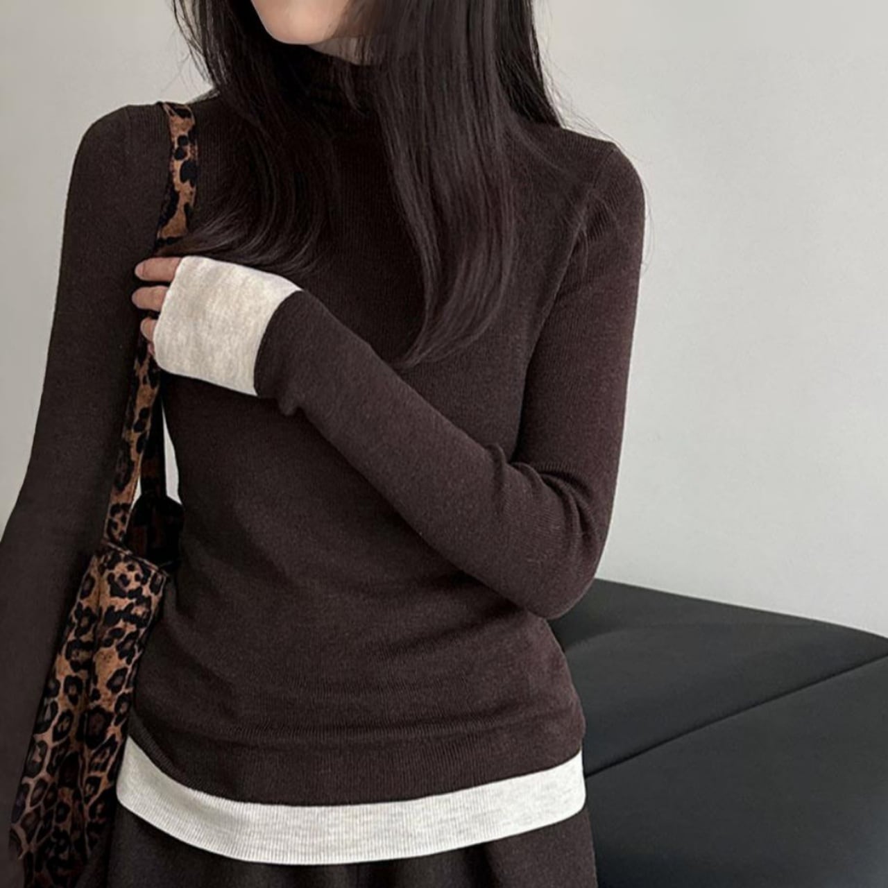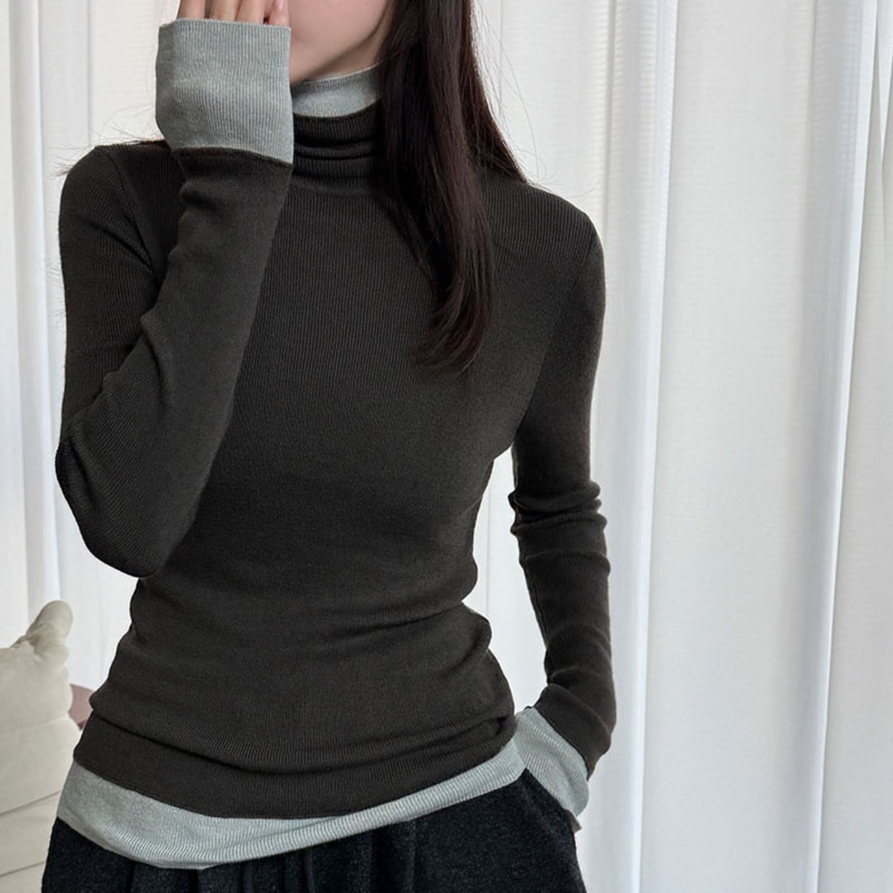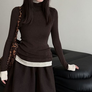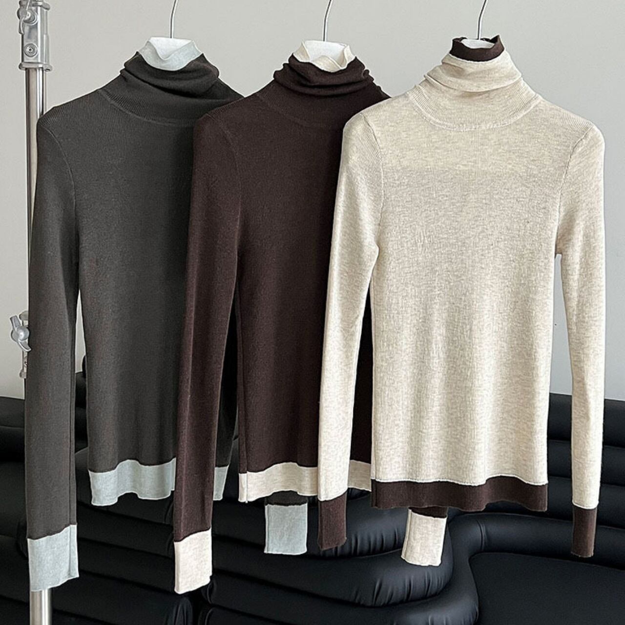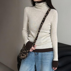 配色デザインを効かせたタートルネックで、顔周りを華やかに彩ります。