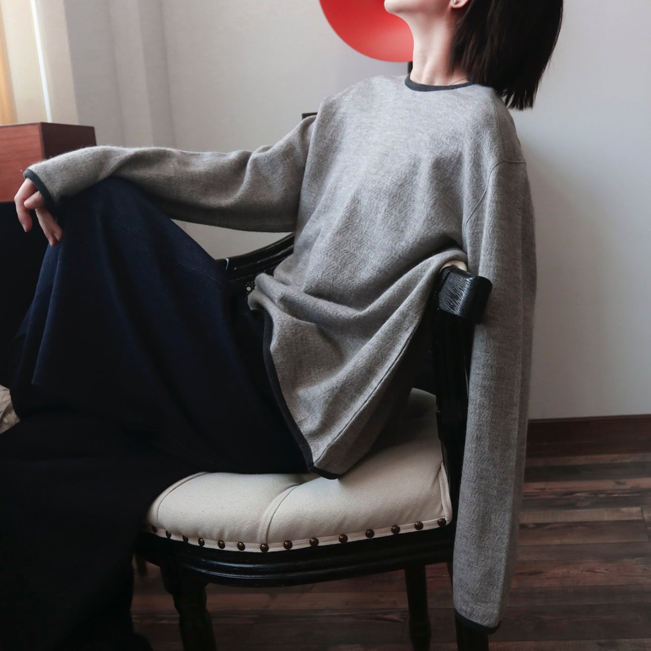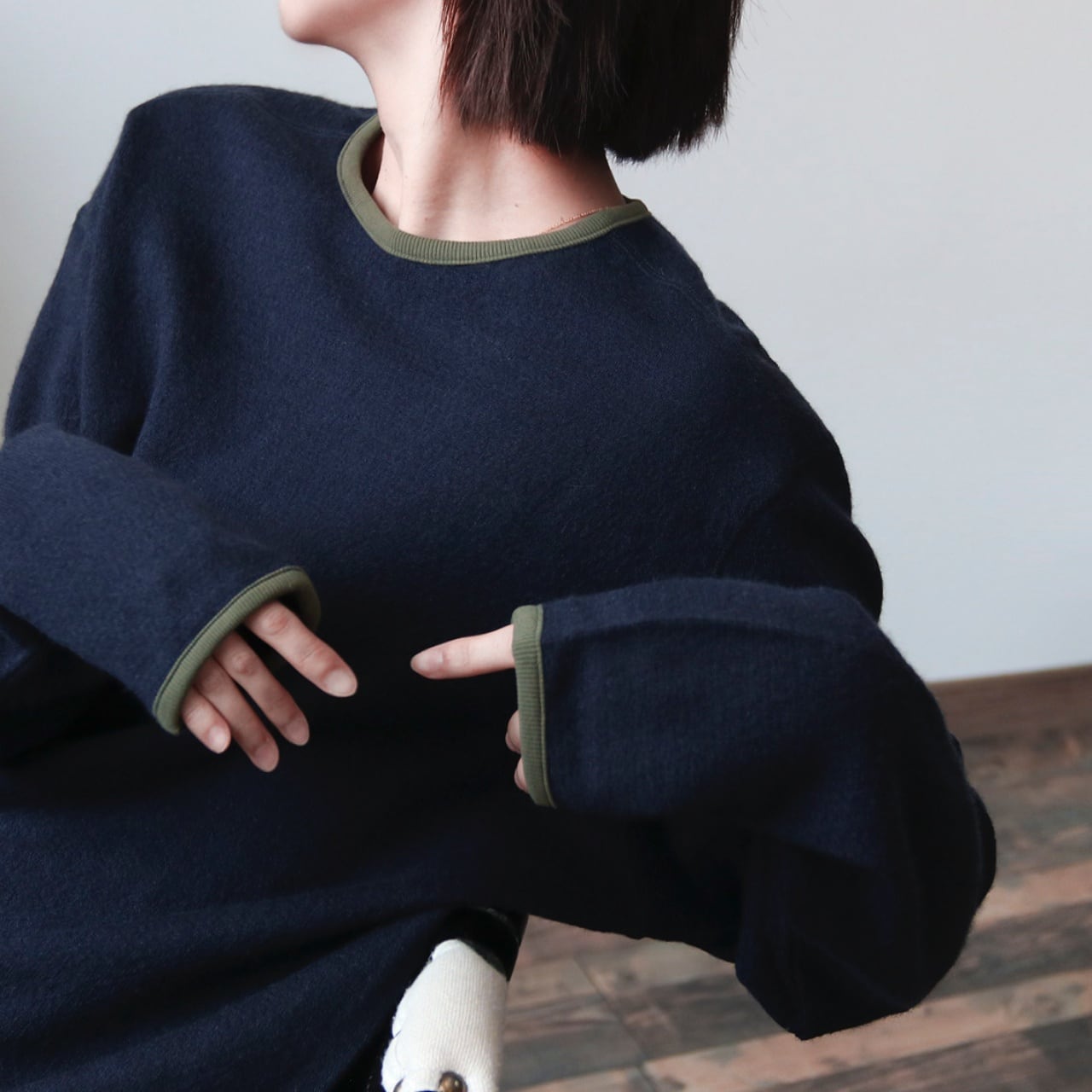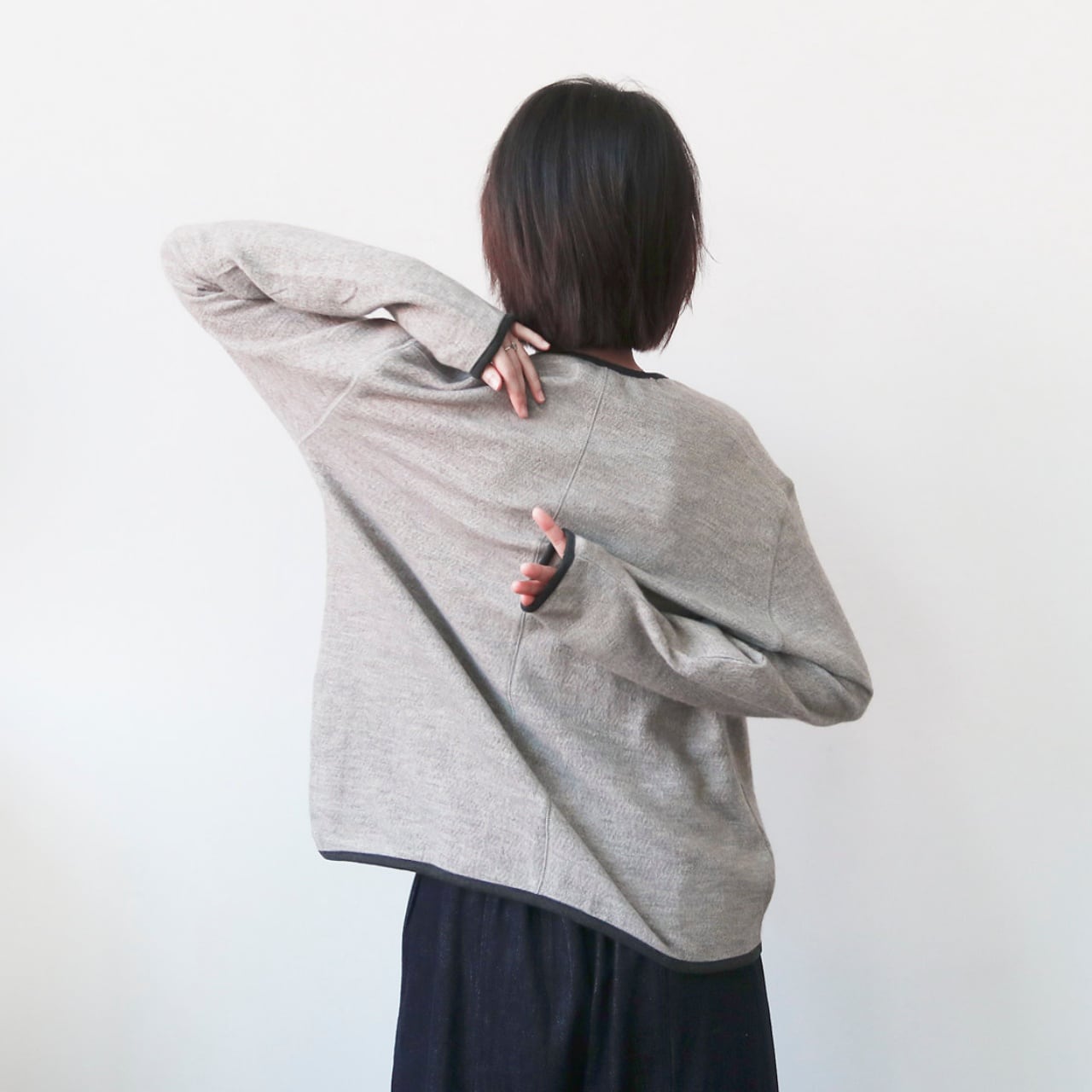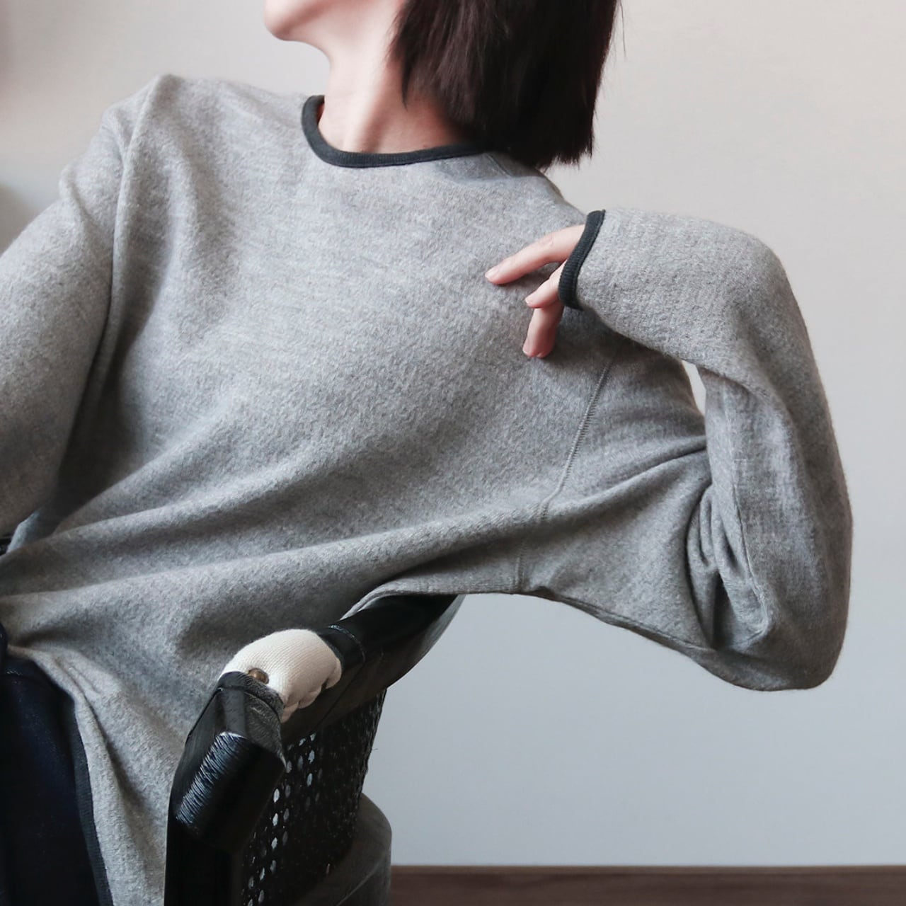 ネックラインや袖口、裾にあしらわれた配色パイピングが、装いのアクセントに。