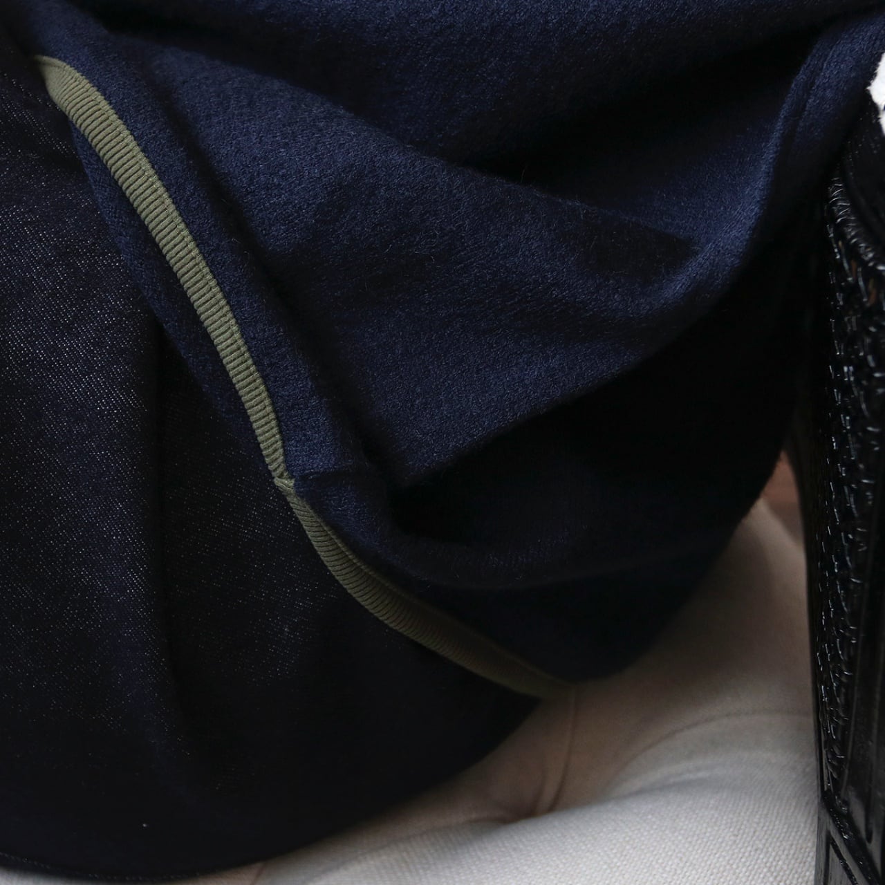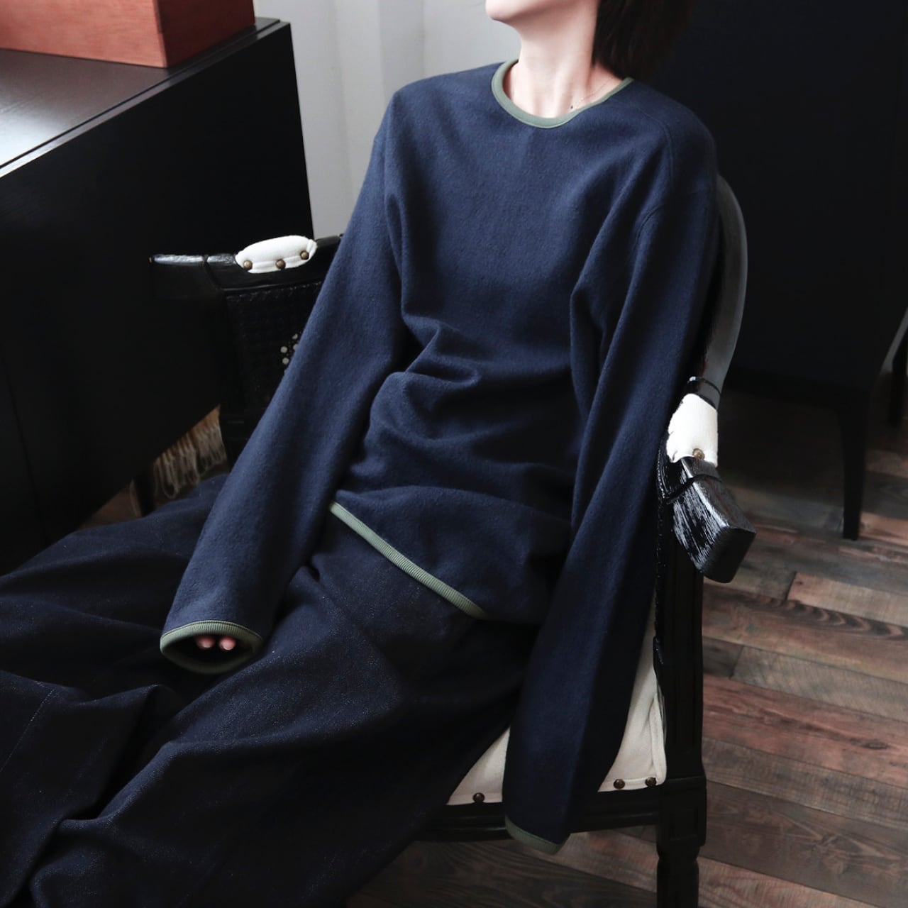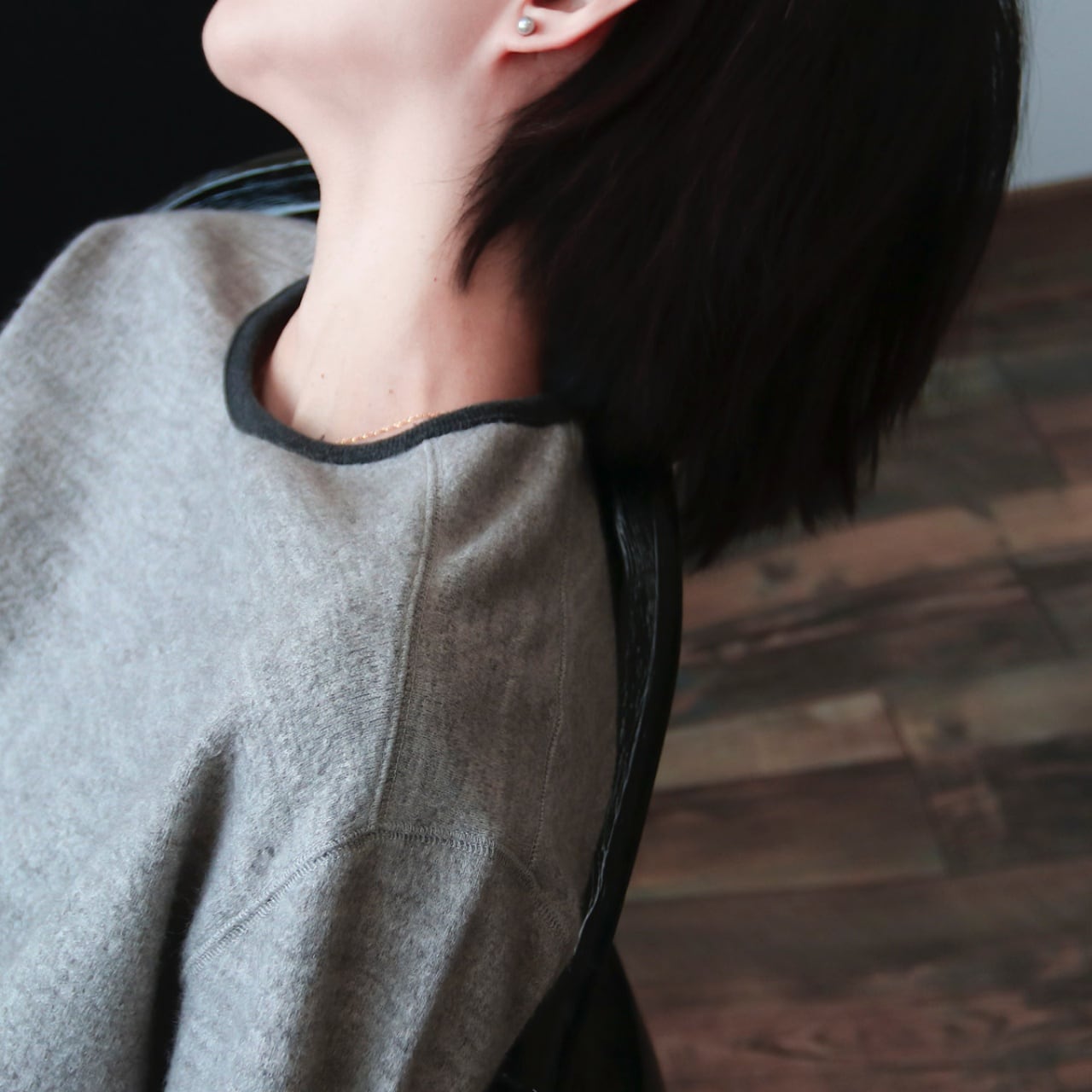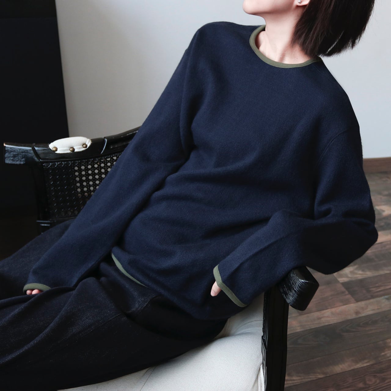 ネックラインや袖口、裾にあしらわれた配色パイピングが、装いのアクセントに。