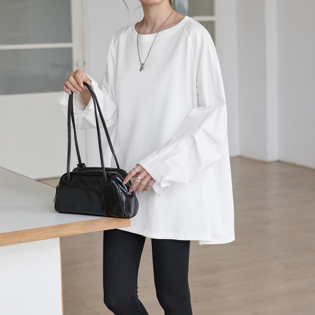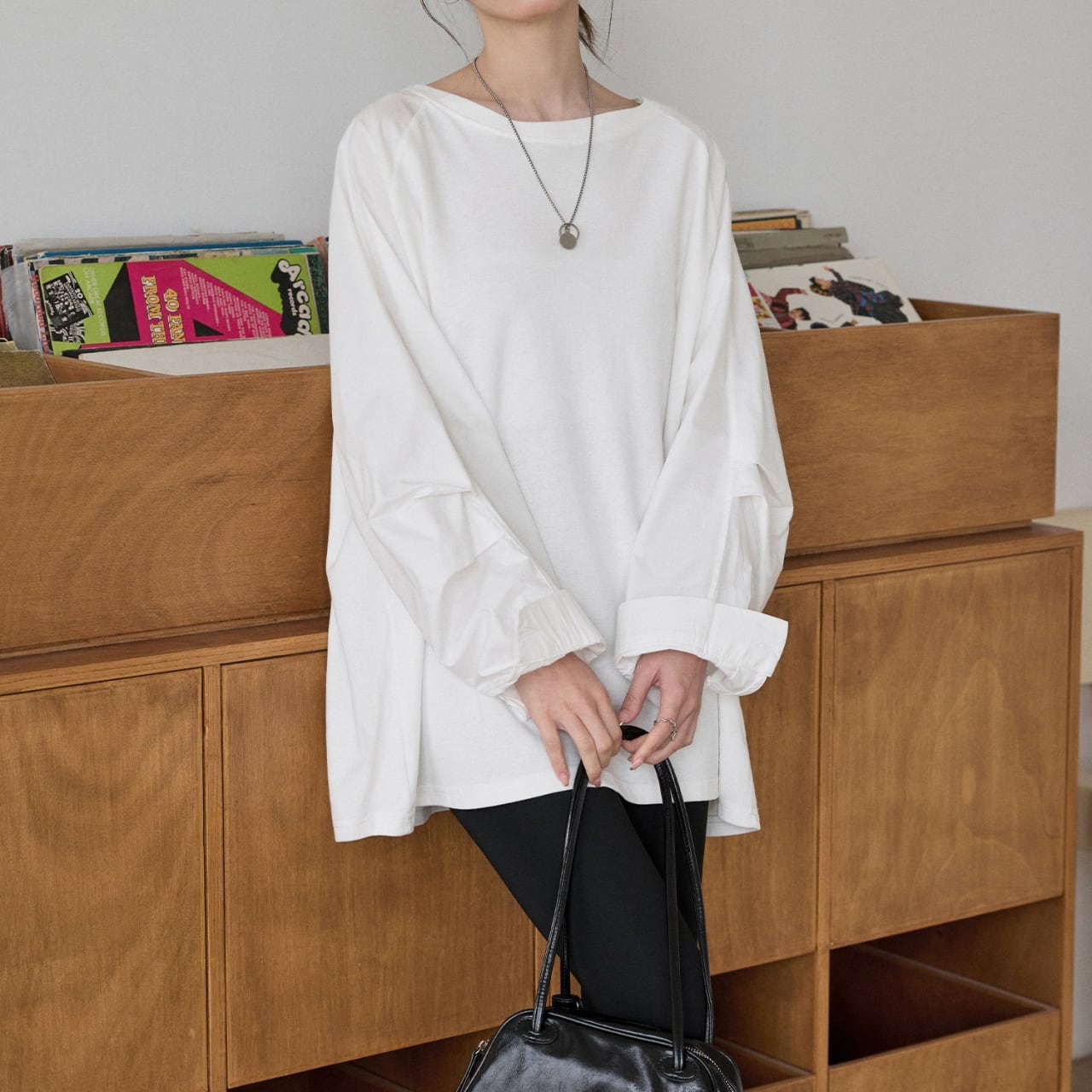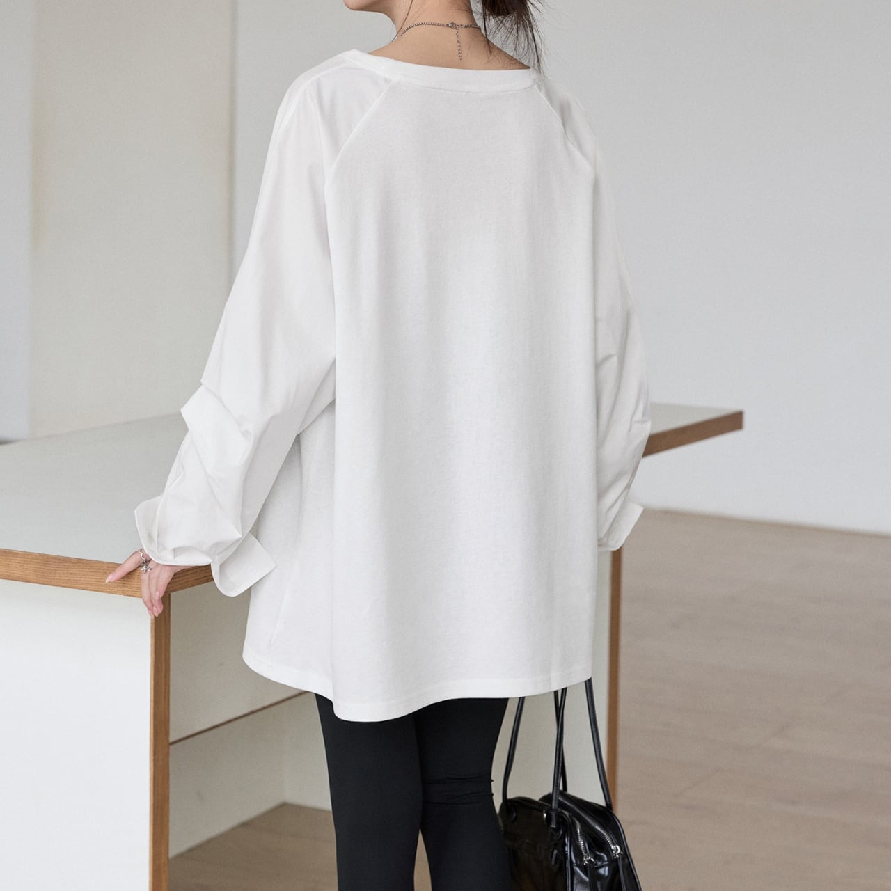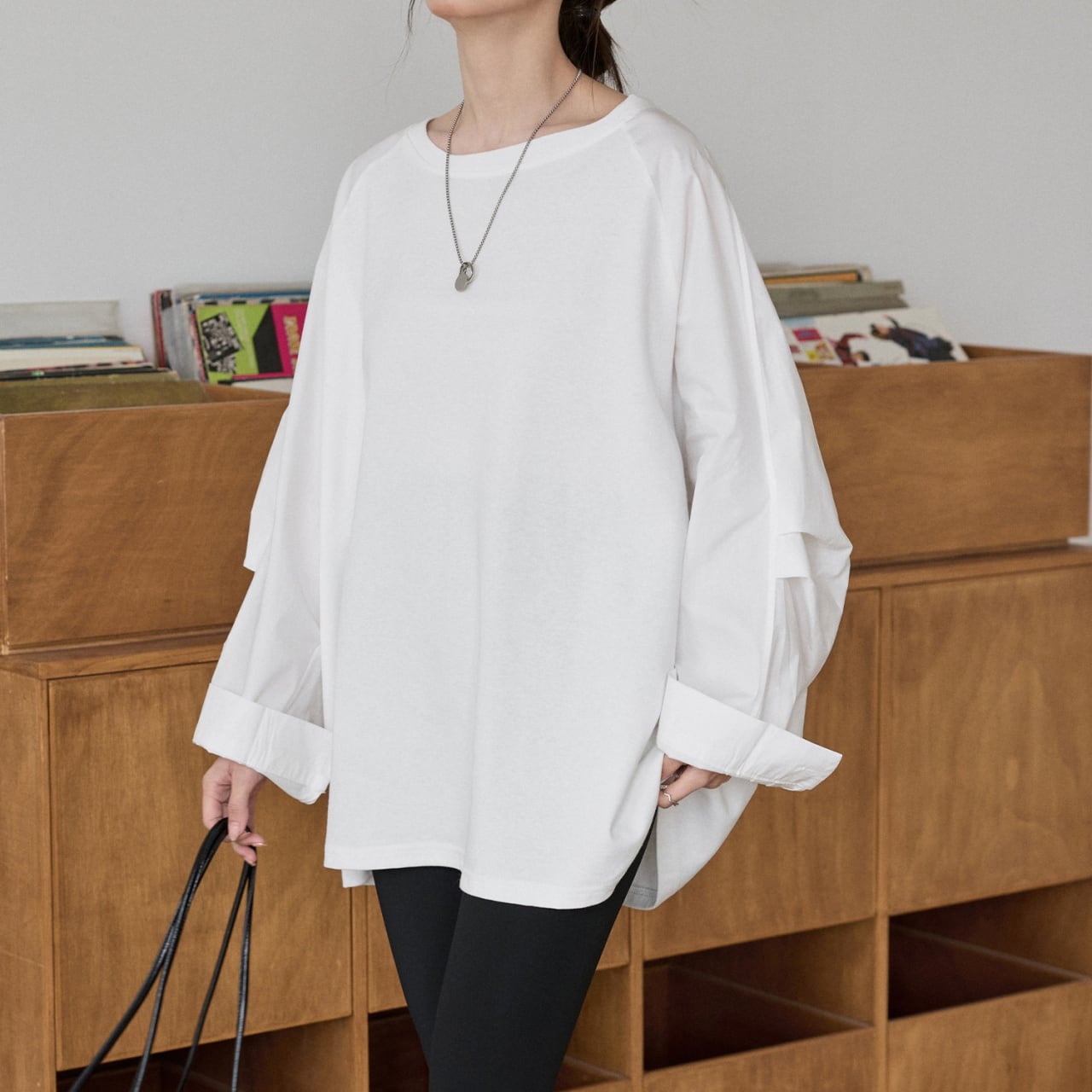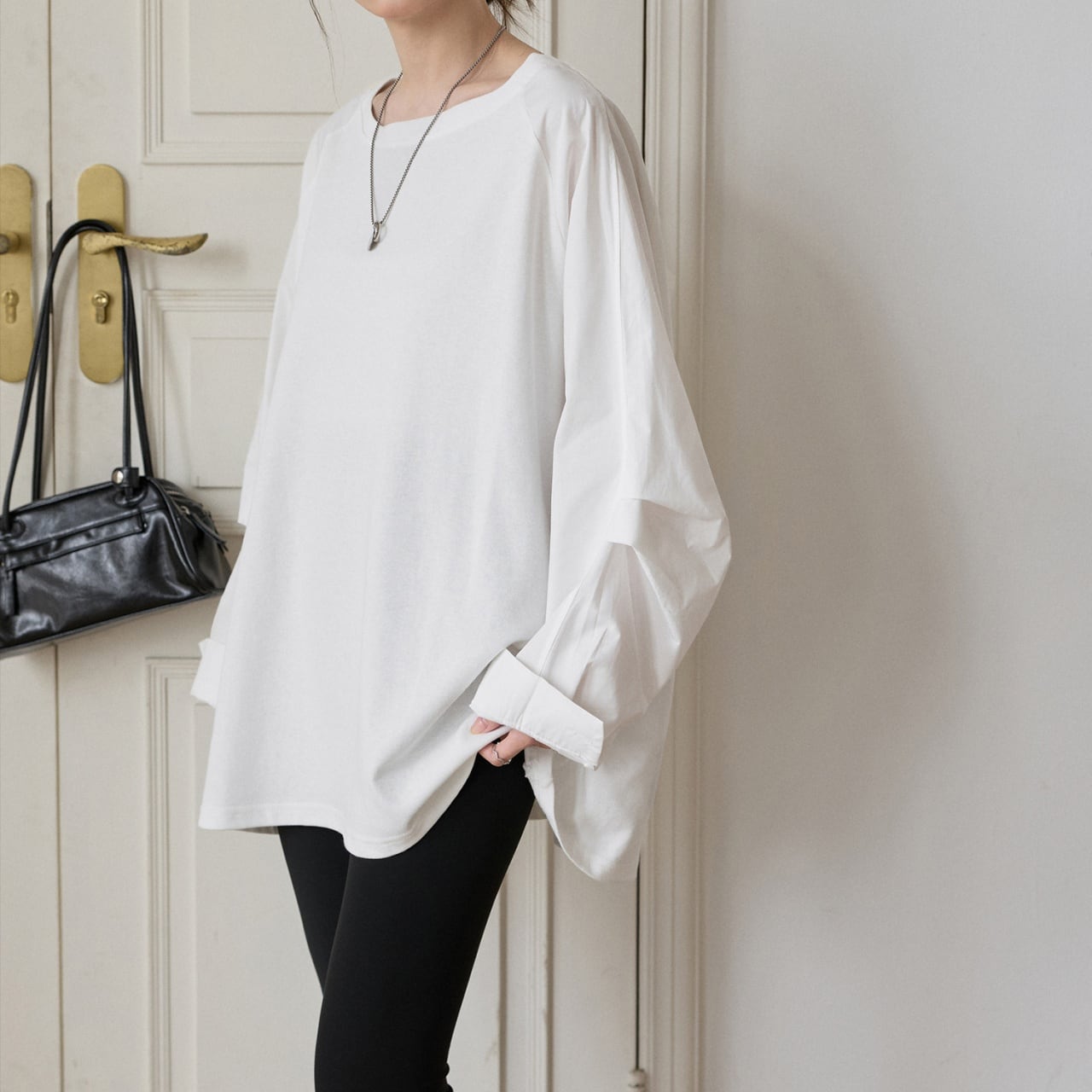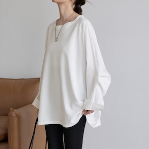 肩の力を抜いたラグランスリーブと、たっぷりとしたボリューム袖が印象的なロングTシャツ。