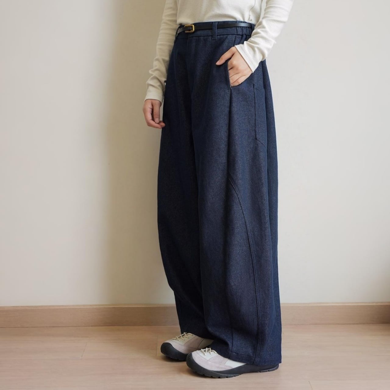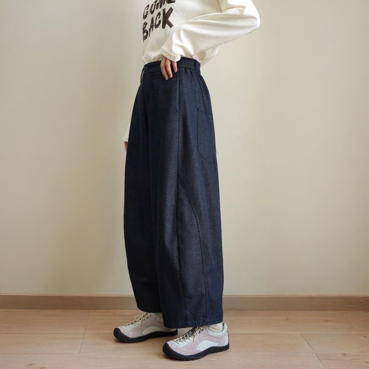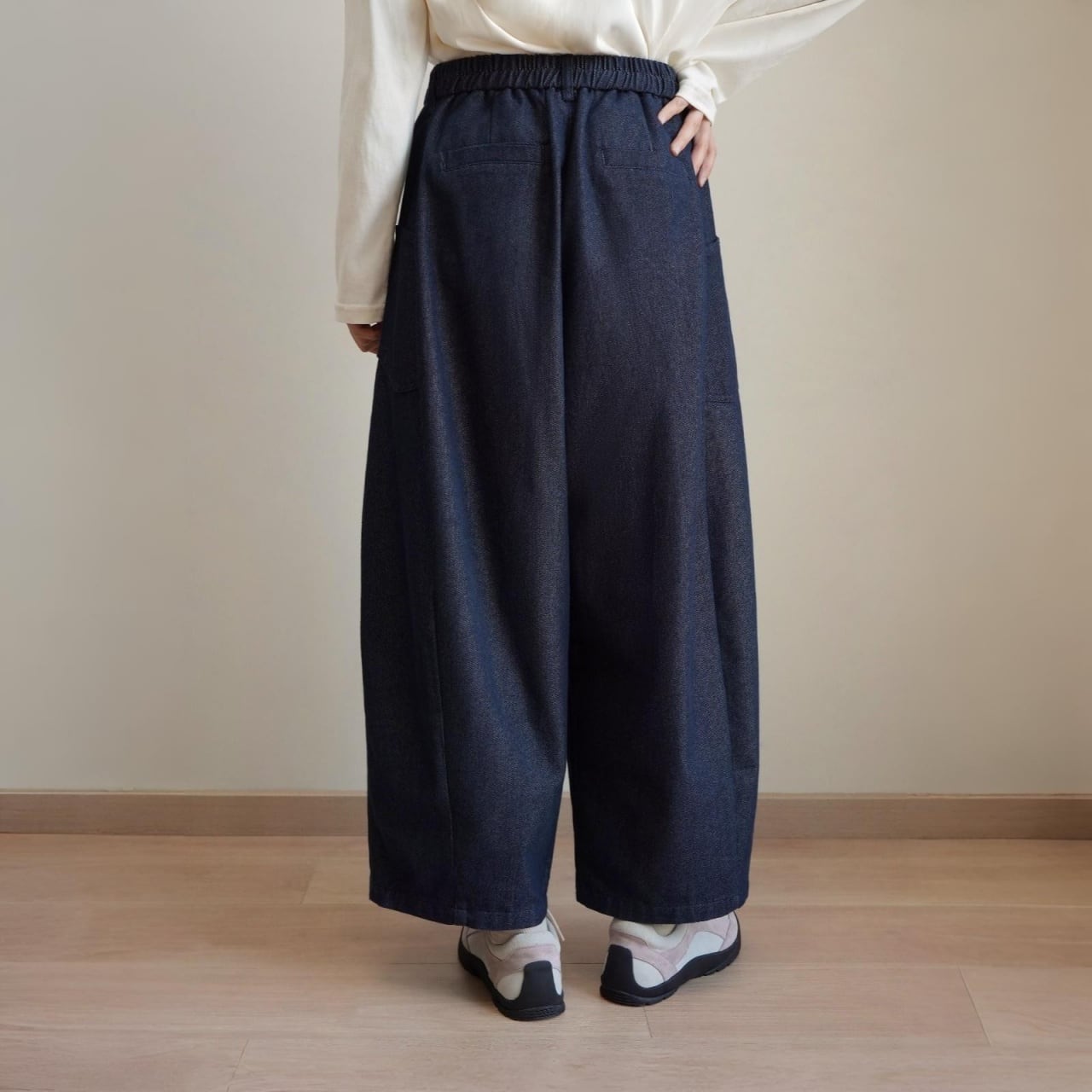 丸みを帯びたコクーンフォルムが印象的な、ワイドレッグデニムパンツ。