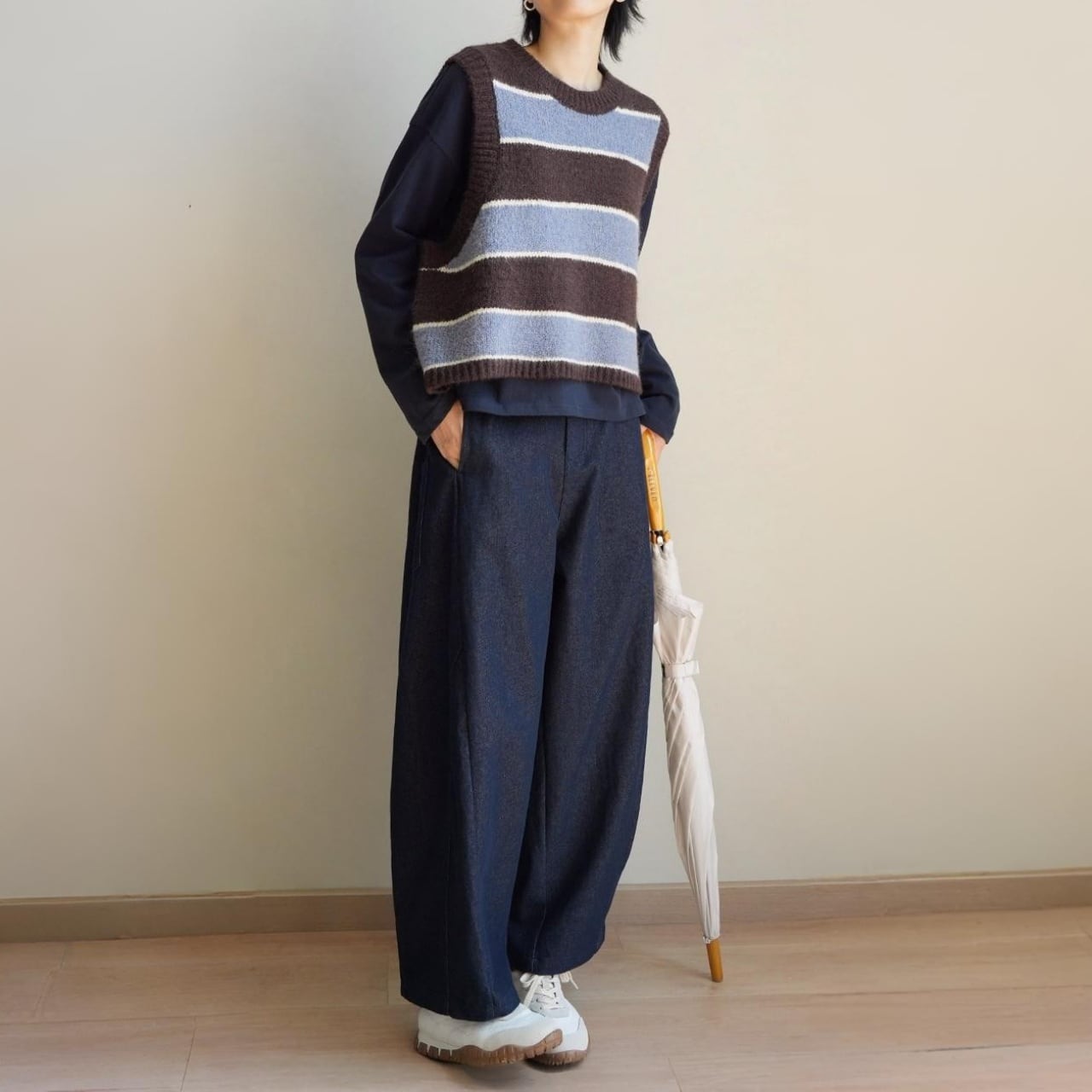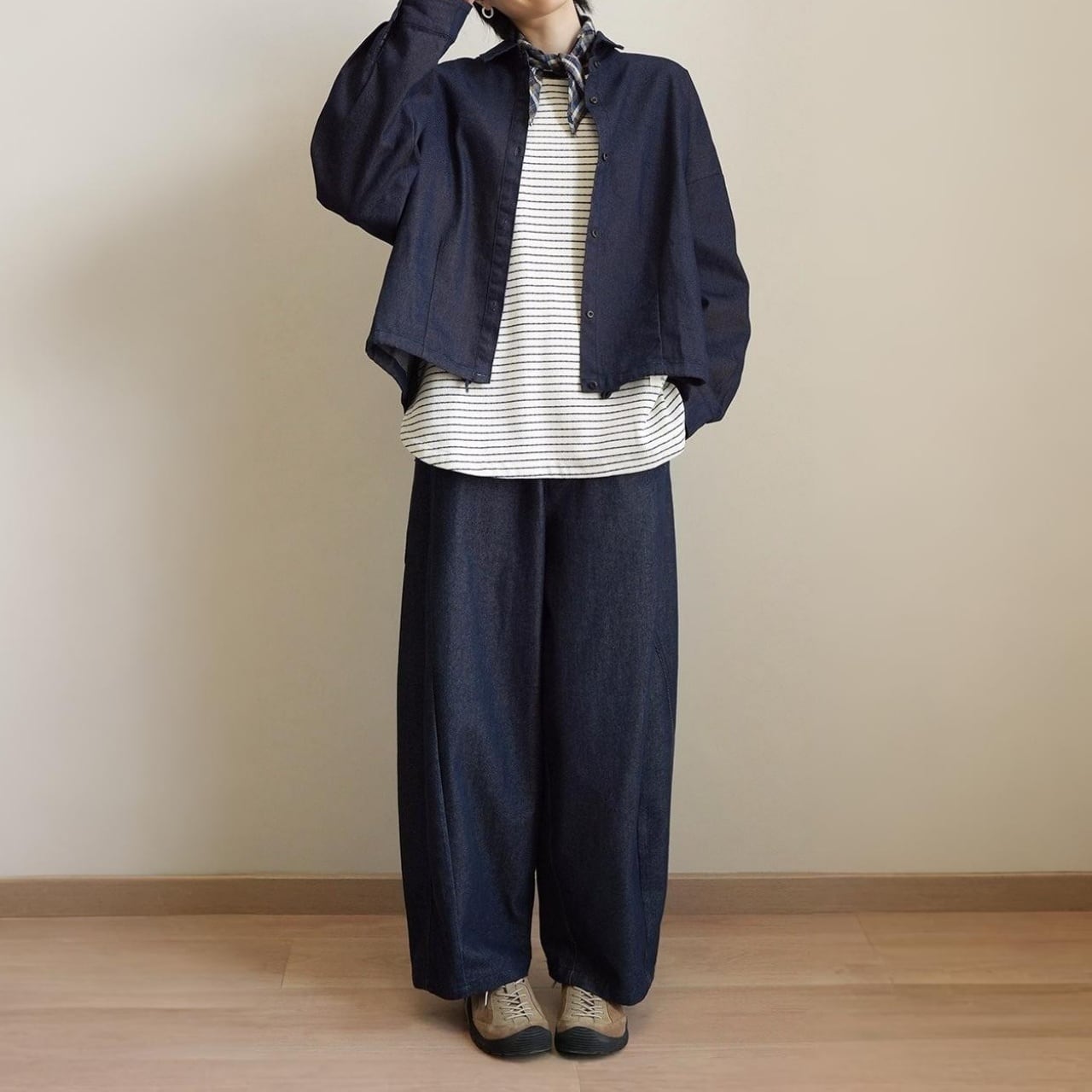 Tシャツやスウェットのラフな装いから、ブラウスやシャツのきれいめコーデまで幅広く楽しめます。