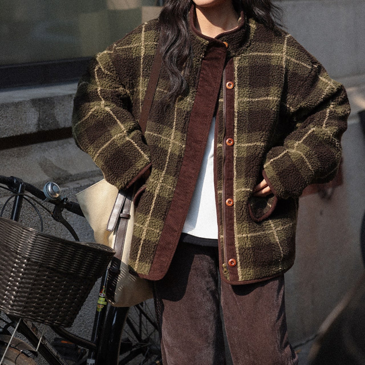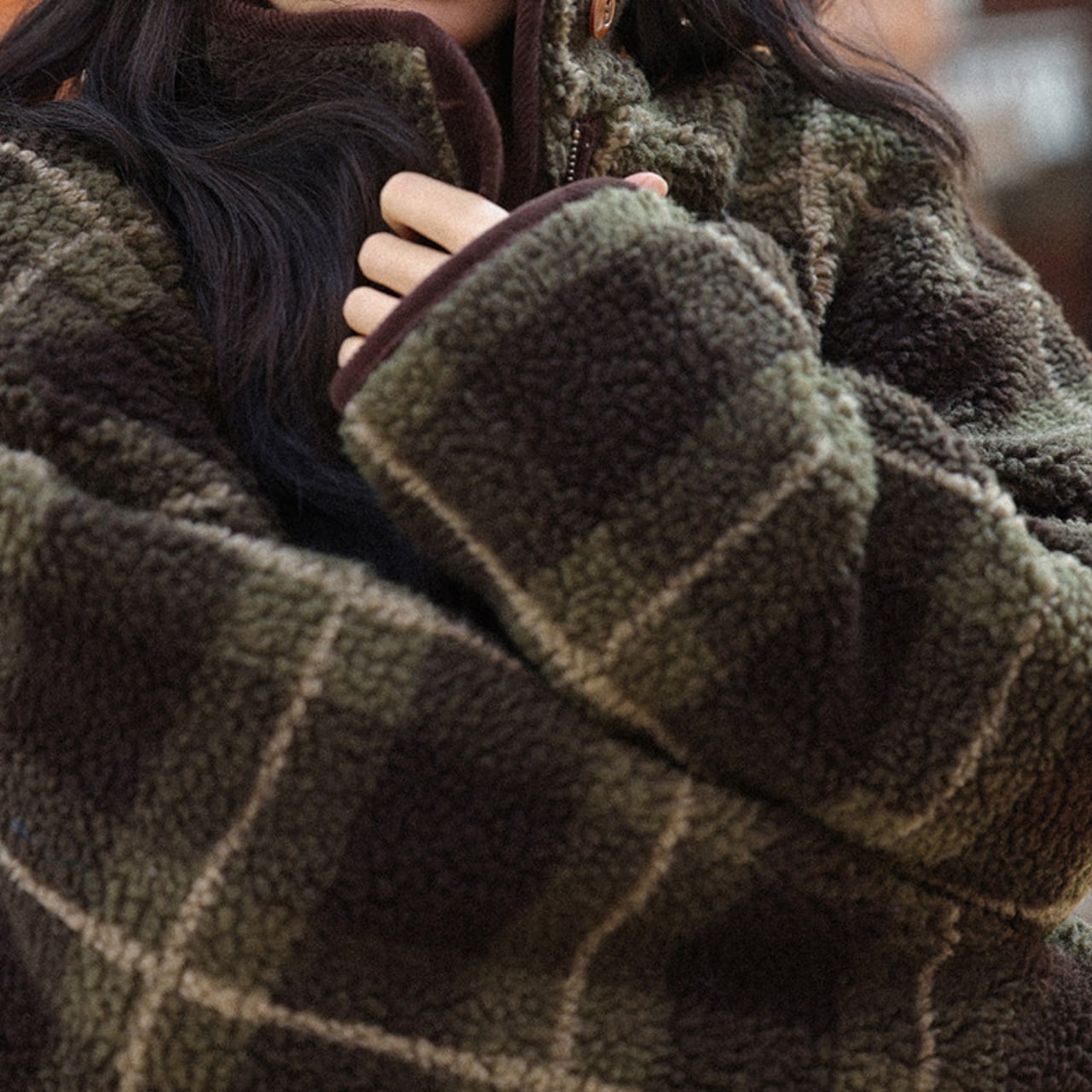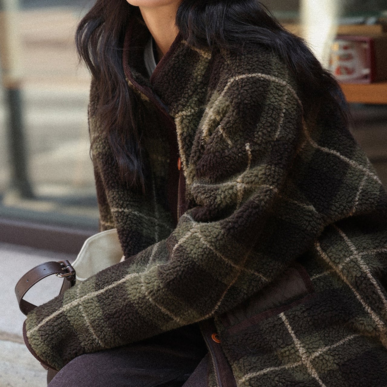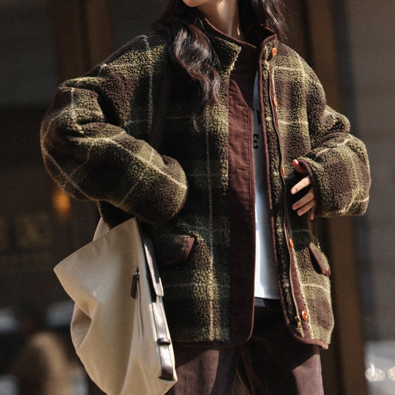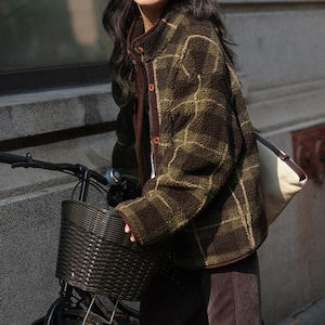 深みのあるグリーンの大柄チェックが、冬の装いにクラシカルな温かみを添えます。